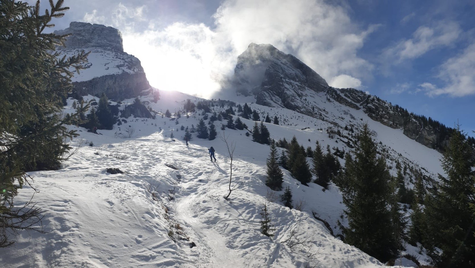 * On suit les traces, parfois on coupe, traçage assez évident, pas de risque, neige assez dure à certains endroit, couteaux pour moi en split à la fin.