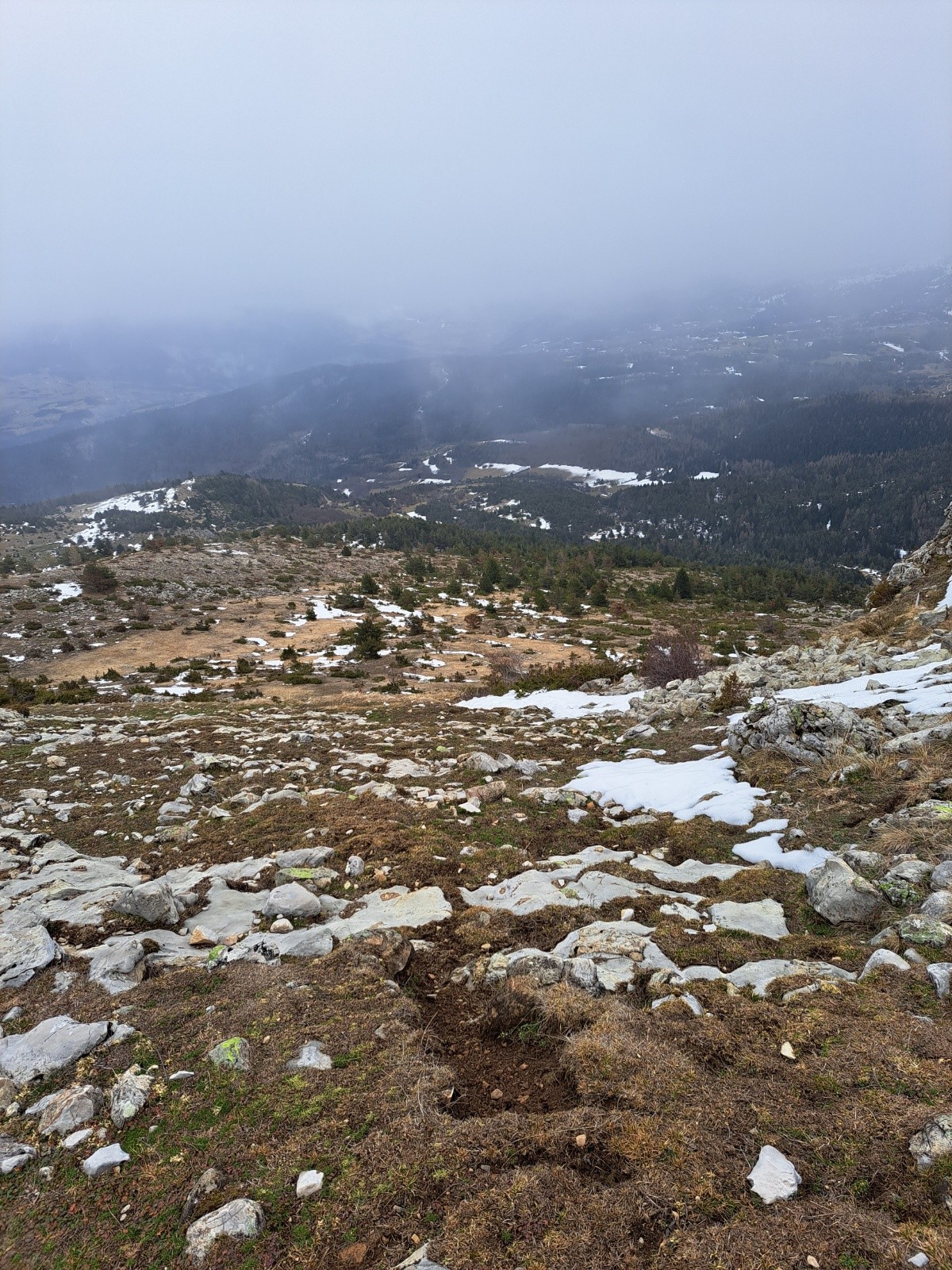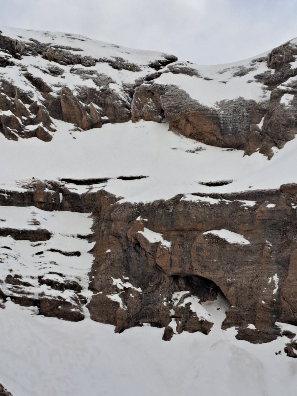 Le col, le fameux col. Dernière étape avant l'entrée du chourum. La vue sur le monstre est encourageante. Neige jusqu'à l'entrée...Neige sur la vire...Un peu déneigé sur les crêtes...Donc, comment va être la première grotte? Comment va être la deuxième ? Comment va être la jonction jusqu'au sommet?