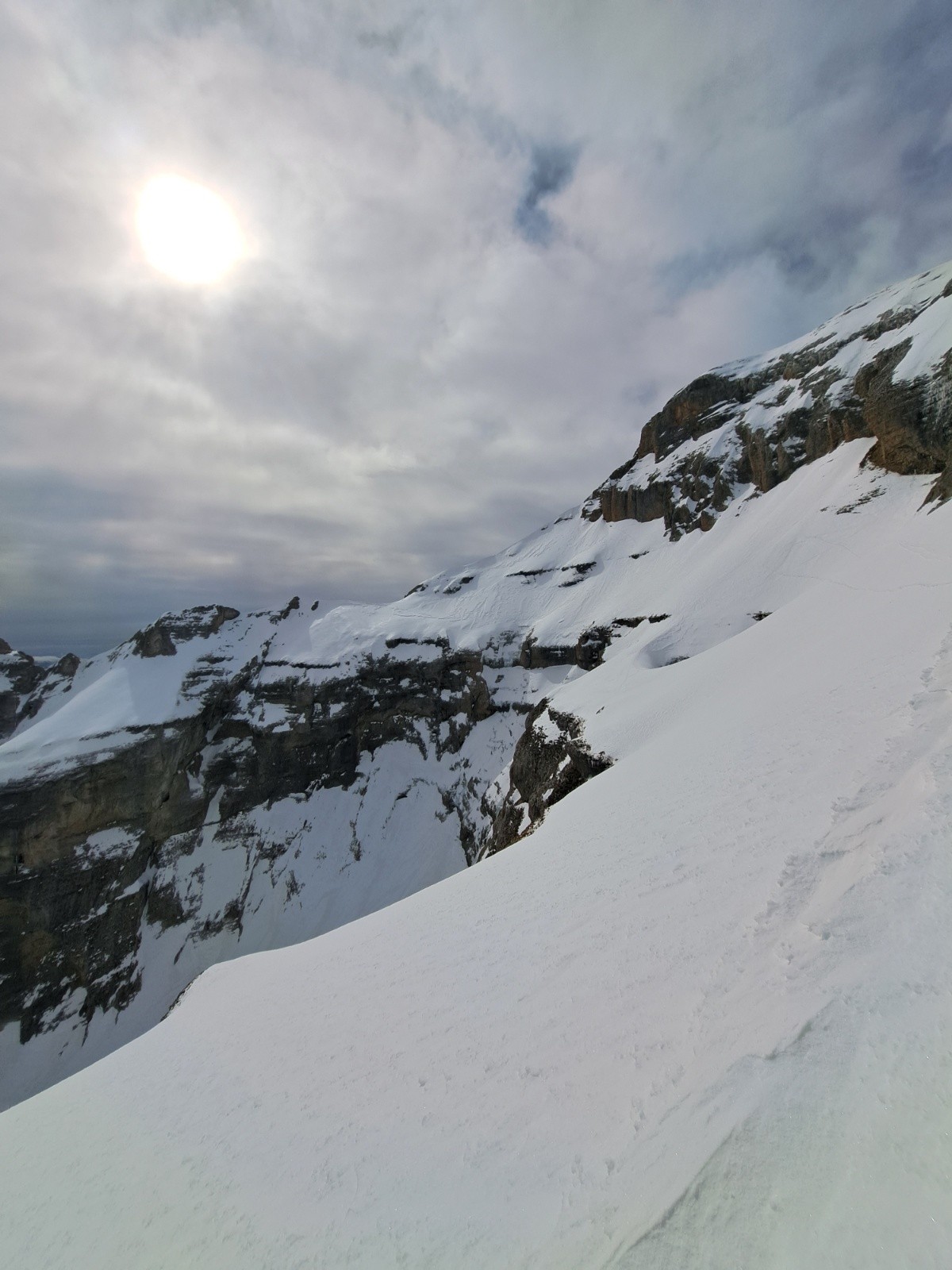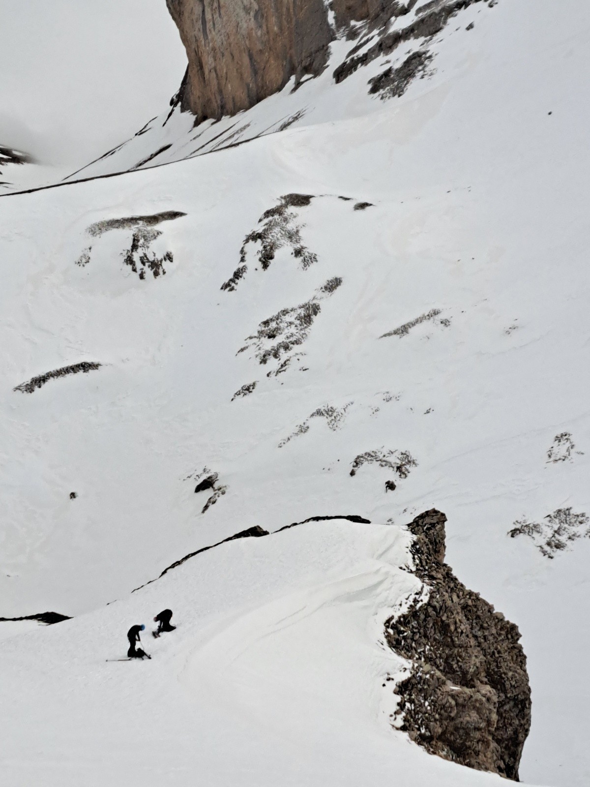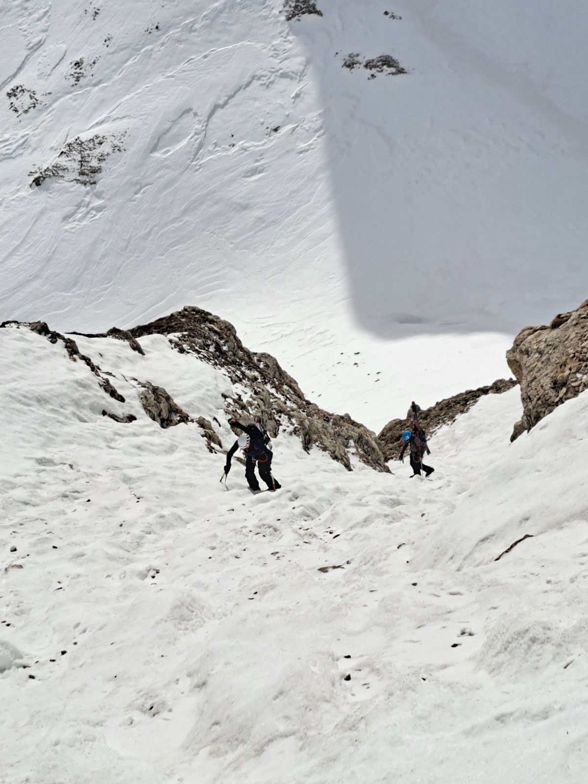 Mais, et il y a toujours un mais, étant tous les 3 quand même un peu amers, on échange brièvement sur cette jolie langue de neige vue main droite du chourum et qui permettrait à nos spatules d'aller jouer un peu sur cette impressionnante vire olympique. La décision est prise et nous voilà partis pour le Pas de l'étoile que nous n'avons encore jamais skié dans le secteur. Au moment où l'on accède à la vire en piolets crampons, je vois 3 gars qui partent en direction du chourum. Tiens, nous ne sommes pas seuls à être optimiste aujourd'hui! Je me dis que ces 3 loulous vont malheureusement déchanter.