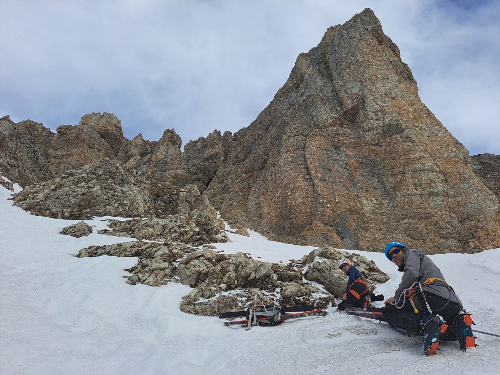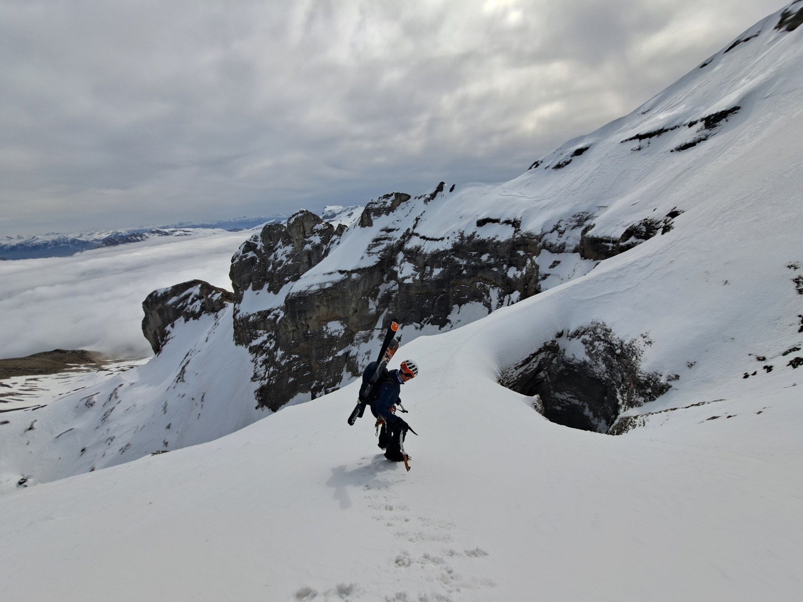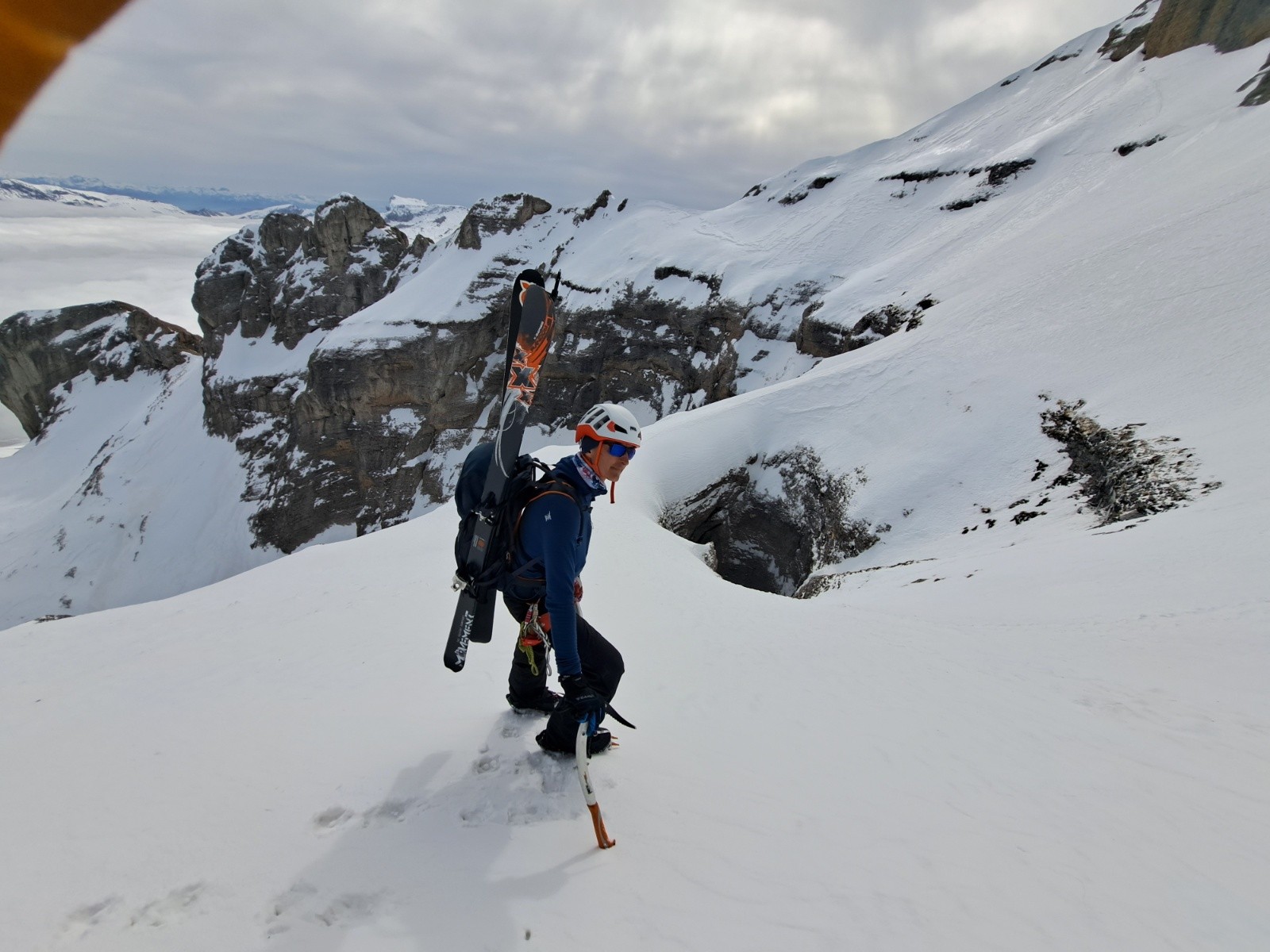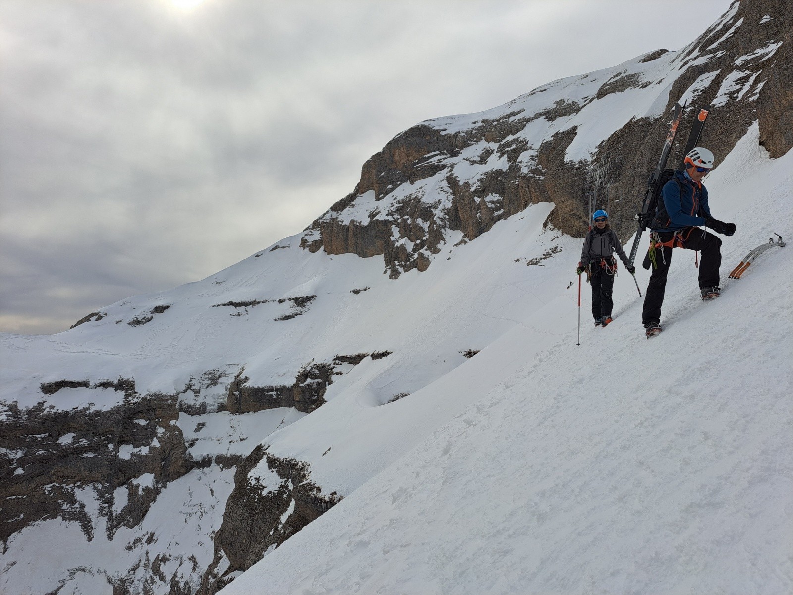 Mais, et il y a toujours un mais, étant tous les 3 quand même un peu amers, on échange brièvement sur cette jolie langue de neige vue main droite du chourum et qui permettrait à nos spatules d'aller jouer un peu sur cette impressionnante vire olympique. La décision est prise et nous voilà partis pour le Pas de l'étoile que nous n'avons encore jamais skié dans le secteur. Au moment où l'on accède à la vire en piolets crampons, je vois 3 gars qui partent en direction du chourum. Tiens, nous ne sommes pas seuls à être optimiste aujourd'hui! Je me dis que ces 3 loulous vont malheureusement déchanter.