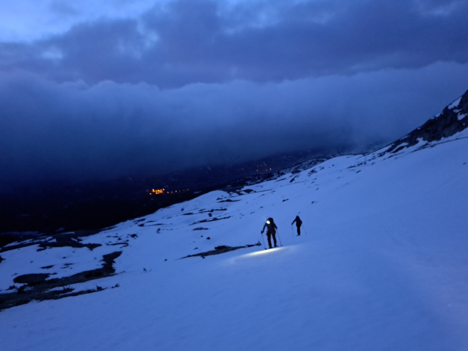 Du coup, on n'a rien changé à nos habitudes. Lever 3h20. Départ 5h, un peu en retard. Parce que ce chourum, il reçoit tout ce qui dégele au soleil et ce, dès 7h du mat...Mais le ciel est couvert et ça joue en notre faveur...