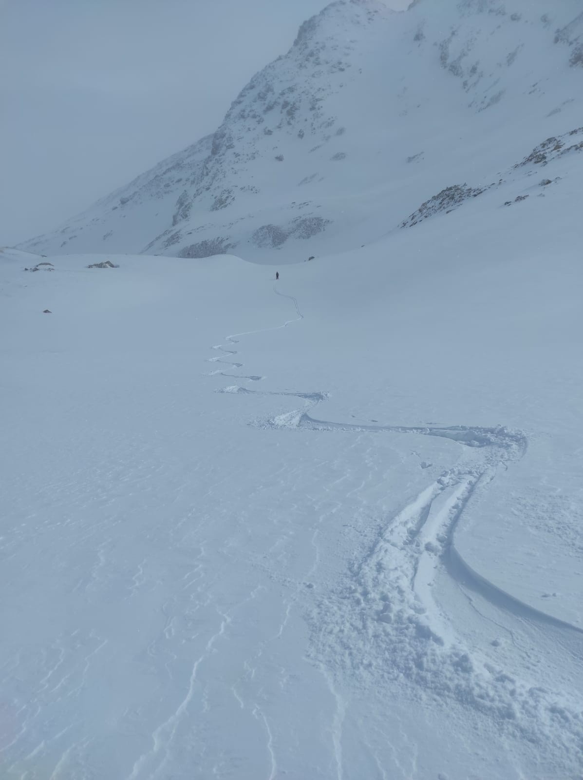 a l'E du col de la roue, on tire N-NE vers le point 2996, neige OK, ça passe sans probleme. On retrouve le vent du N glacial au sommet. Descente plein E, en direction du Col du Frejus (on n'y passe pas) , d'abord dans neige dure, soufflée, qui masque les pierres à nos dépends, puis 200m de descente en poudre tres sympa, puis (de +/- 2800m a 2400m) brouillard qui gâche bien le plaisir de cette poudre retrouvée mais inskiable en aveugle, descente au GPS (2 GPS valent mieux qu'un quand la technologie chinoise tombe en rade a cause du froid! ) jusqu'aux pistes où on repasse sous la nappe de brouillard, puis on quitte la piste pour prendre la combe du ruisseau du Frejus, très chouette au début, mais qui manque cruellement de neige sous 2000m. Un bien joli tour sans doute par meilleure visibilité!