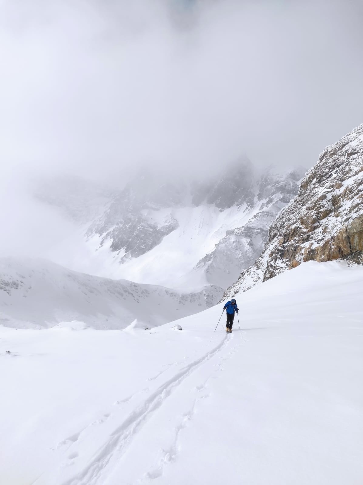 Loooongue remontée du vallon de la roue , la neige tombée la veille (10 cm?) a été (et est toujours) balayée par le vent => alternances de neige soufflée, de plaques et de passage plus doux en poudre plus légère...
