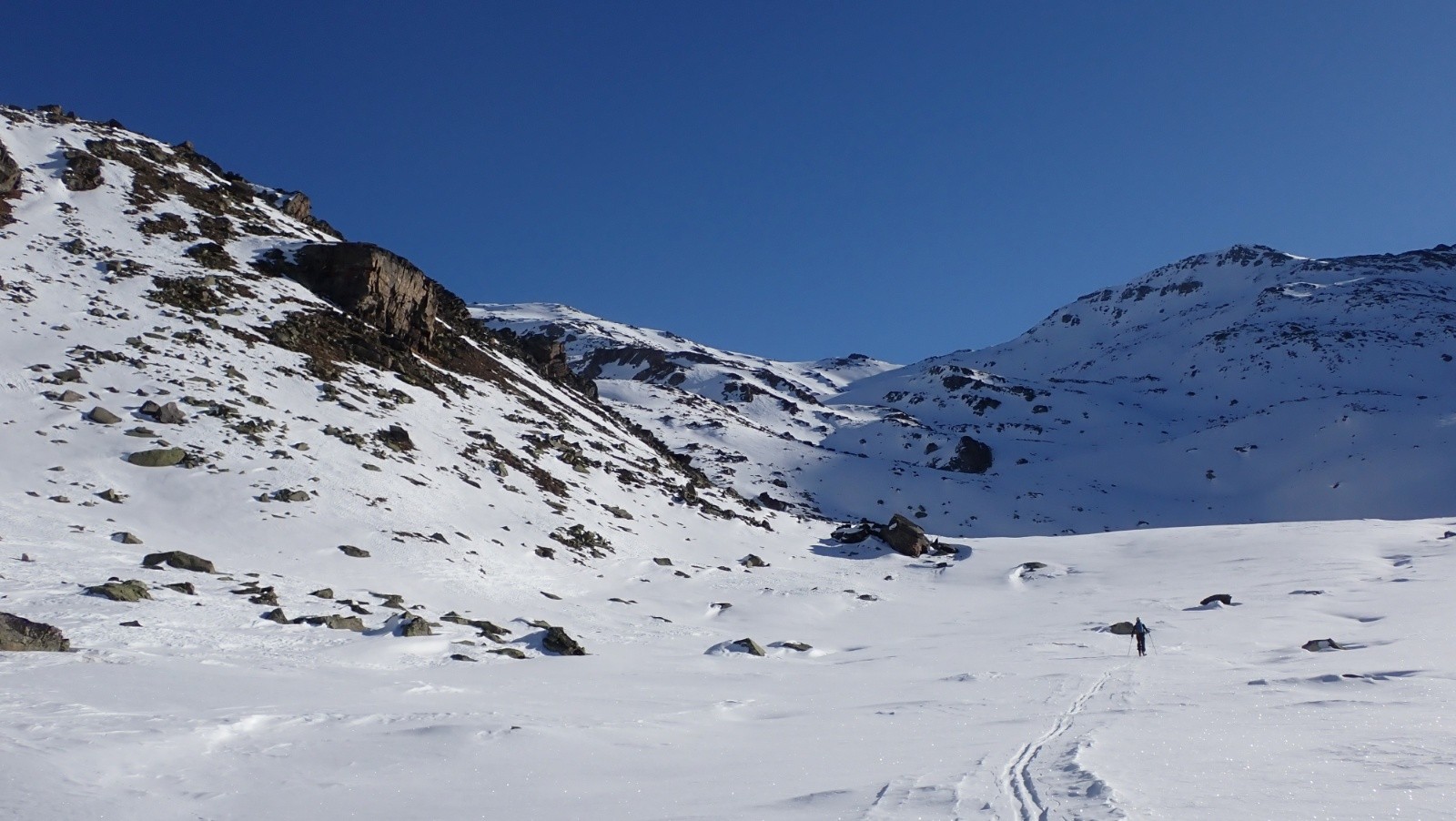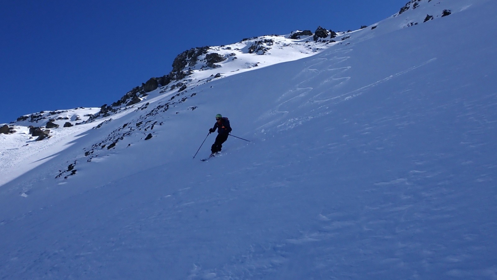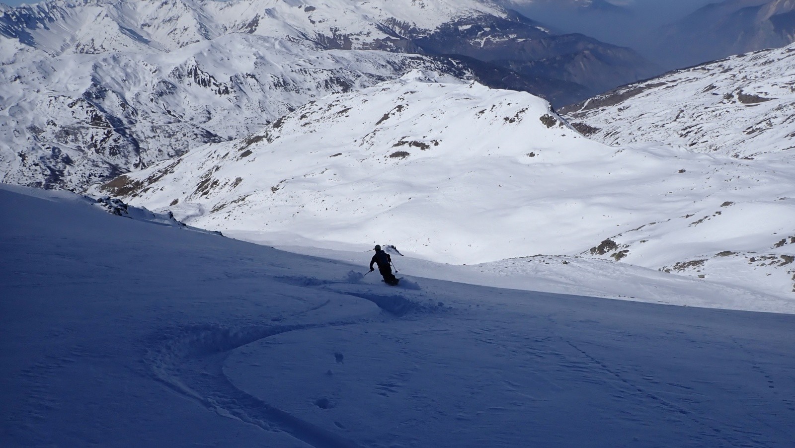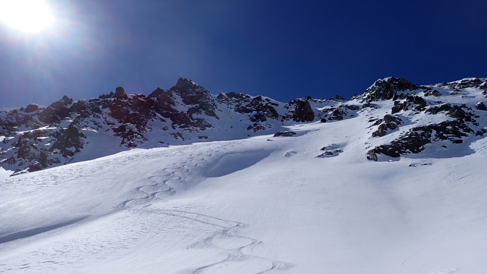 Conditions pour le ski : un peu de bruyère sur la trace de montée deux petits passages courts où il n'est pas vraiment nécessaire de déchausser. neige dure écaillée en face sud. Sur le glacier, 20 à 30 cm de poudre rapportée par le vent, sur les contrepentes NO, 15 cm de poudre le plus souvent en choisissant les itinéraires. Le vallon des Marches en bonne neige dure. Retour par la piste en bonne condition à la voiture.