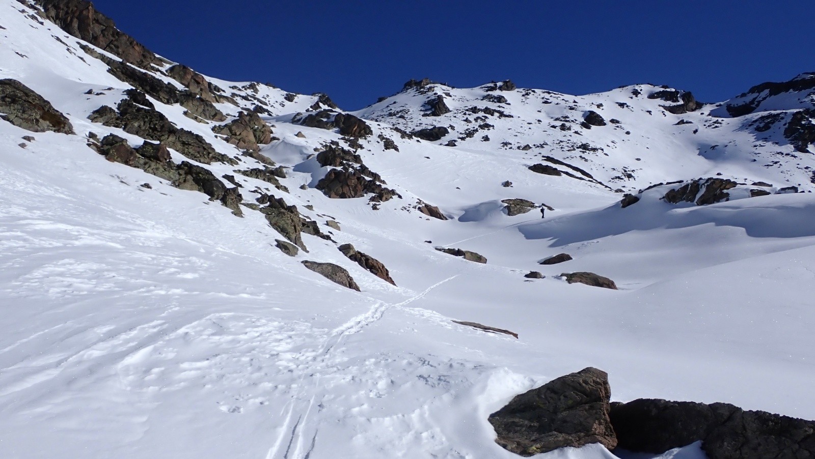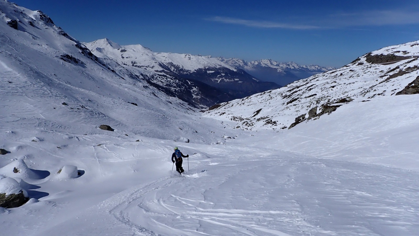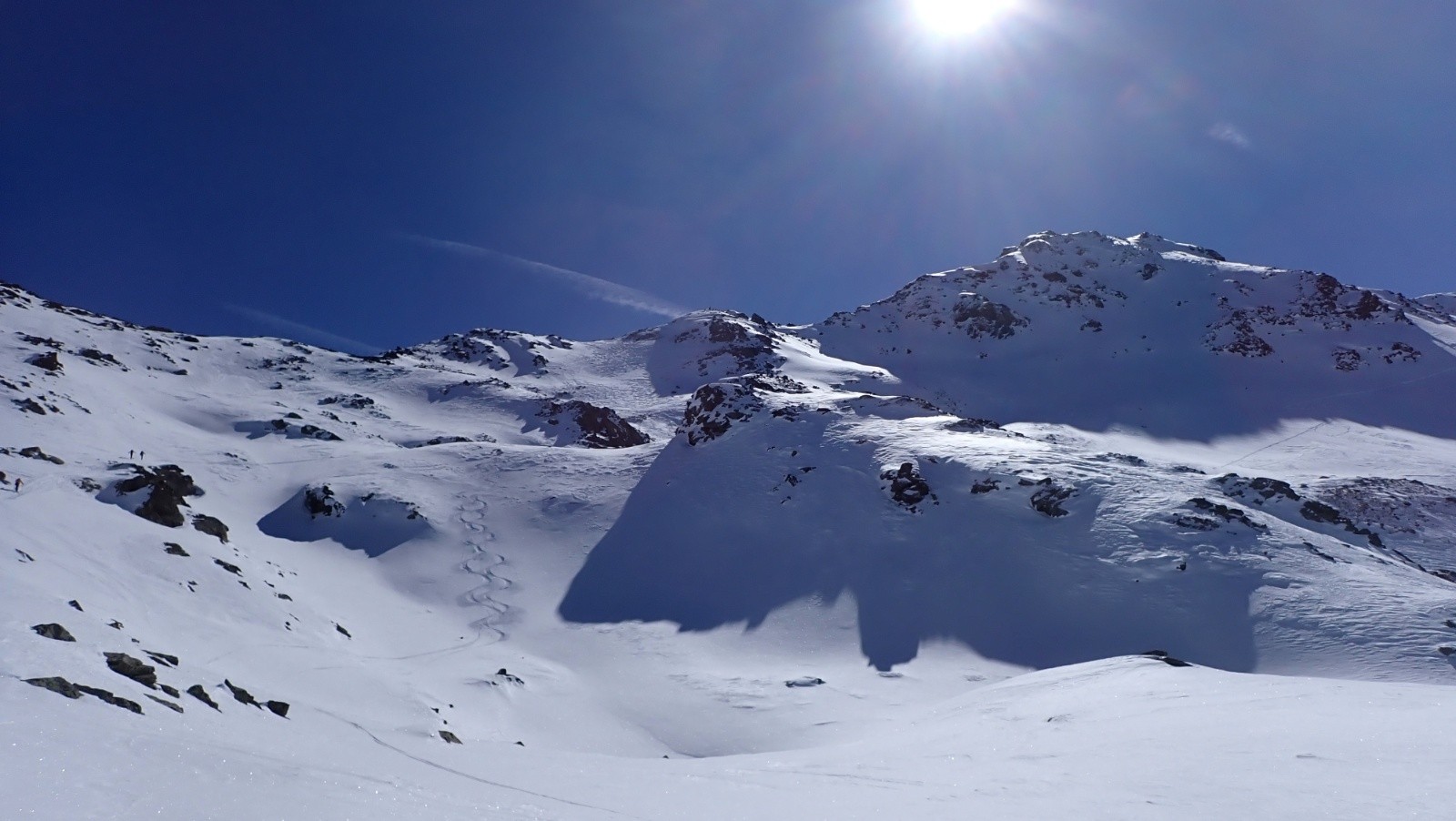 Conditions pour le ski : un peu de bruyère sur la trace de montée deux petits passages courts où il n'est pas vraiment nécessaire de déchausser. neige dure écaillée en face sud. Sur le glacier, 20 à 30 cm de poudre rapportée par le vent, sur les contrepentes NO, 15 cm de poudre le plus souvent en choisissant les itinéraires. Le vallon des Marches en bonne neige dure. Retour par la piste en bonne condition à la voiture.