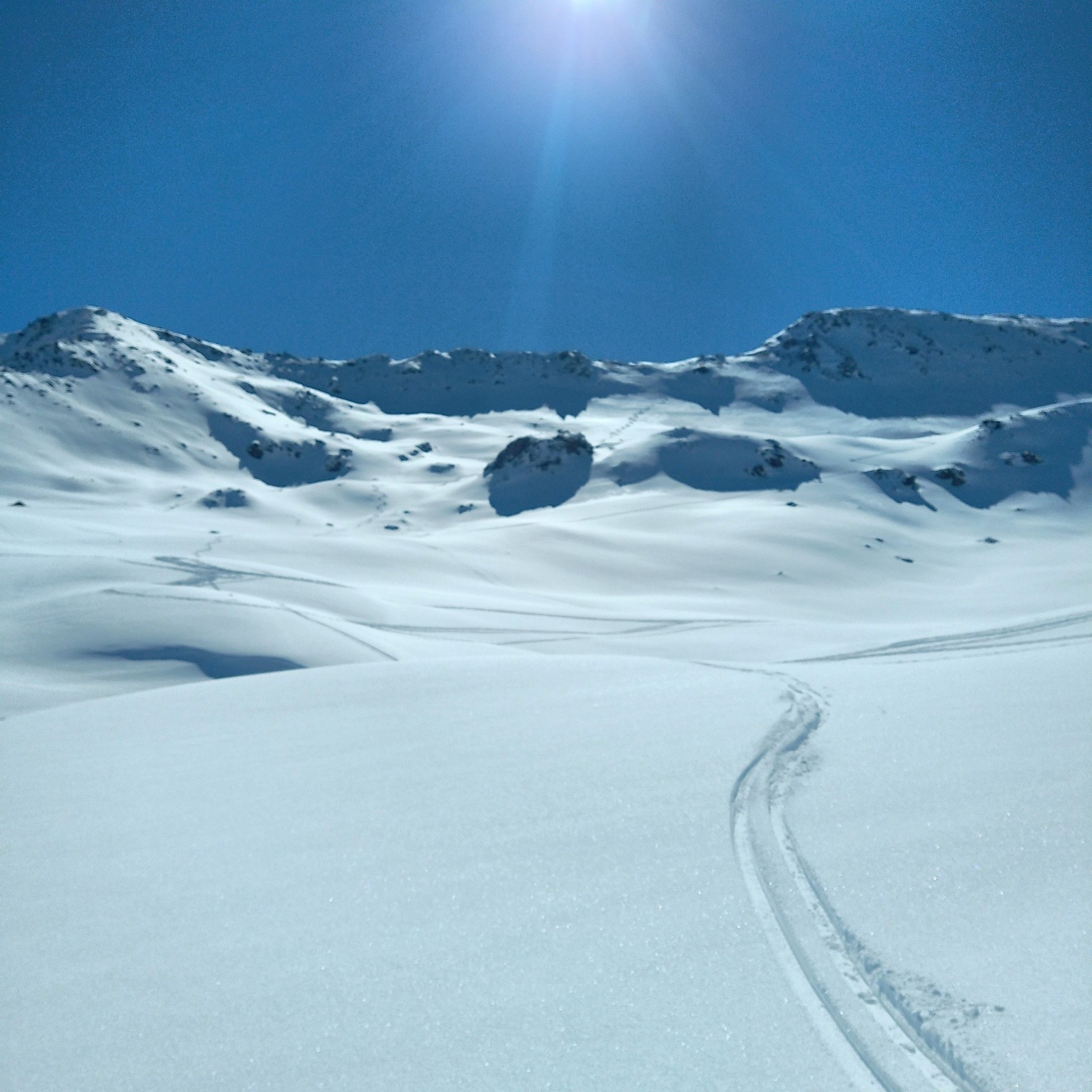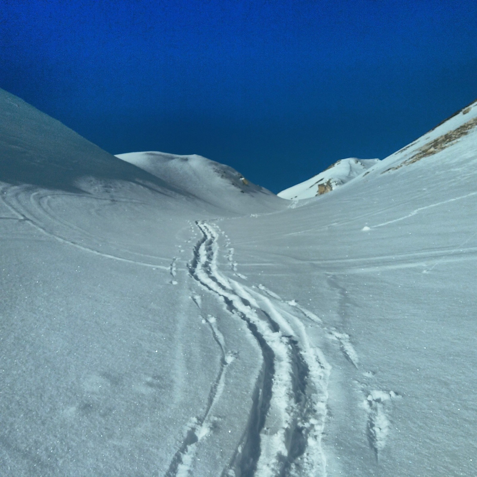 En bas du couloir qui part a gauche du col des méandes, je repeaute, histoire d'aller skier la belle poudreuse vue le matin en montant au col du cheval blanc...bingo..les 400 m d'ascension paient...au lieu de remonter en direction du col de vallée étroite et ne faire que de la traversée pour rejoindre le lavoir...je trouve de belles sessions de poudreuse.