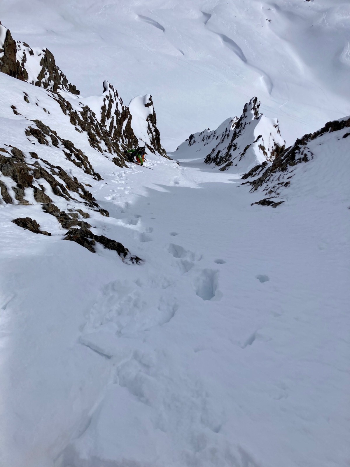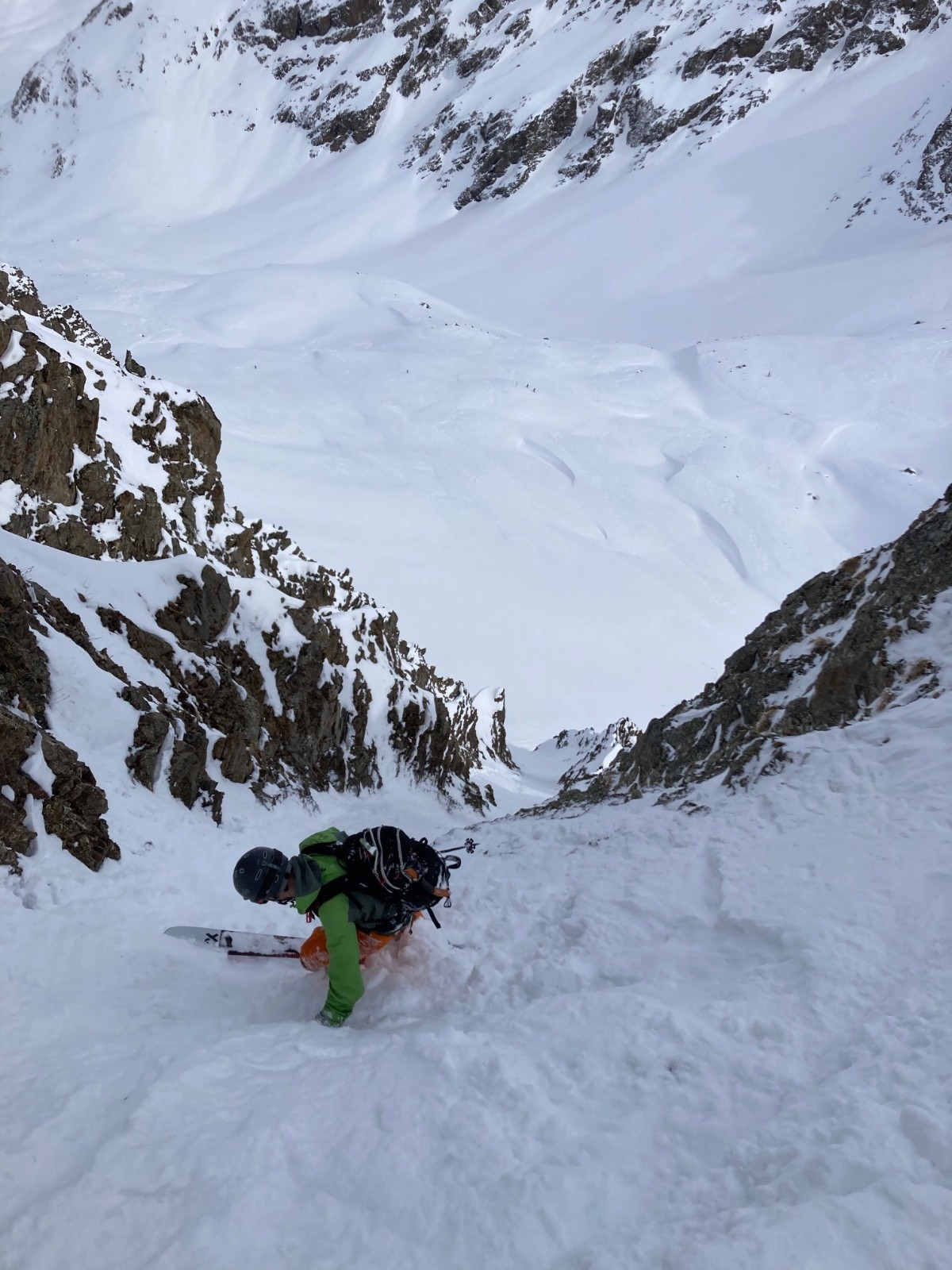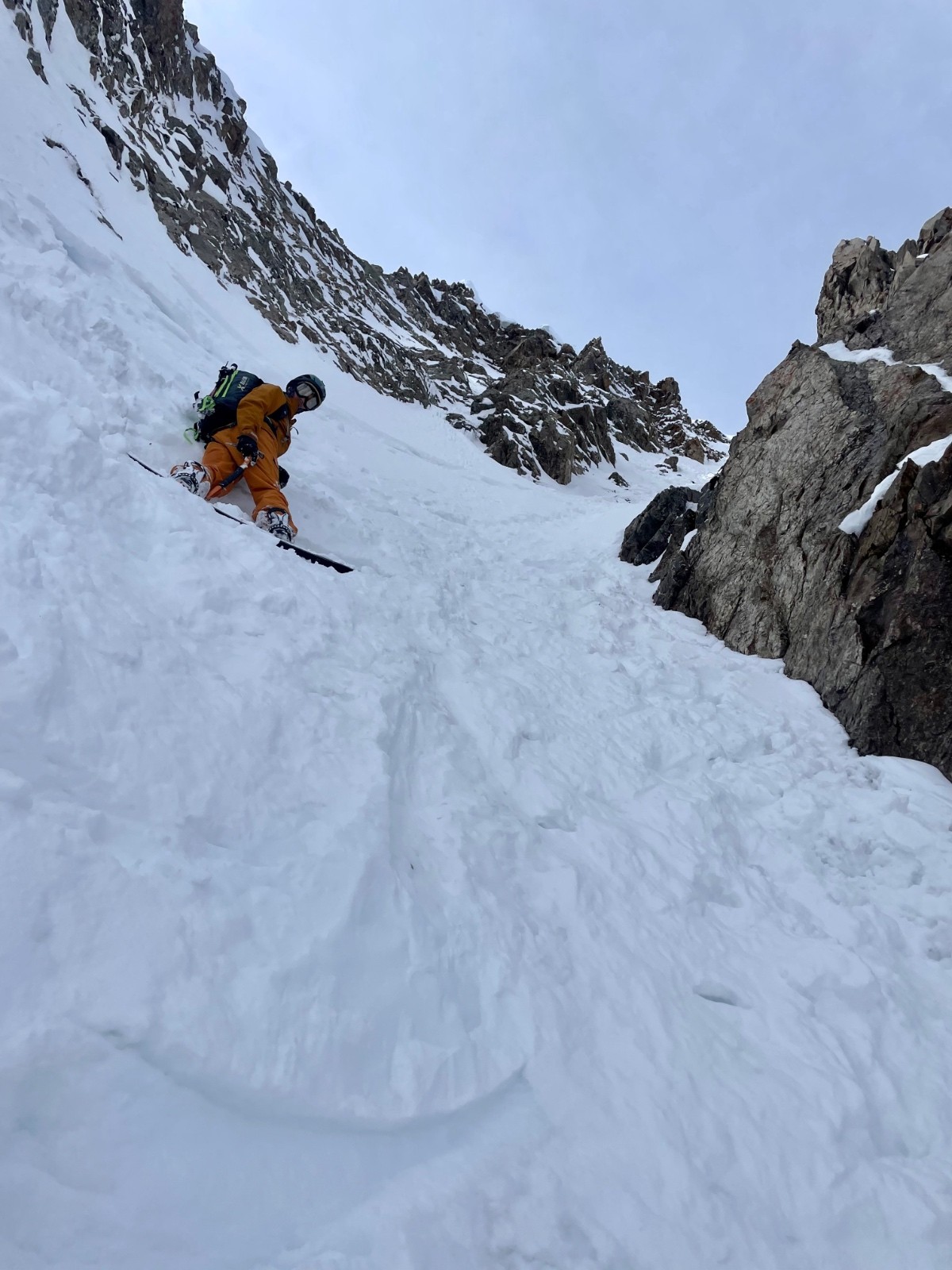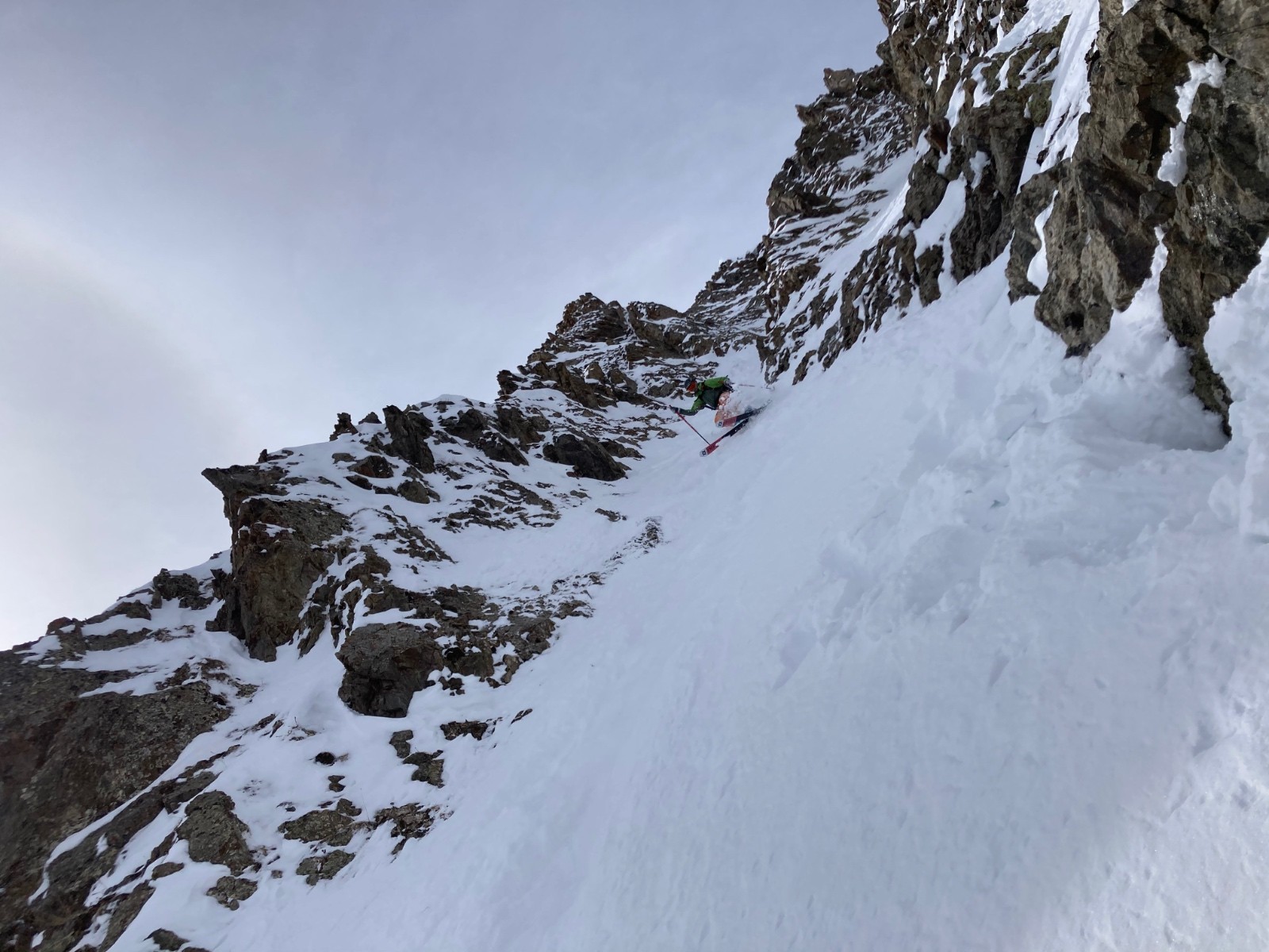 J’avais dans un coin la tête depuis plusieurs saisons la goulotte Harmonie Paradoxale skiée par Hervé Degonon, et c’est en passant au pied de la face que le couloir du jour s’est révélé praticable. L’autre goulotte imposait un trop long passage à pied à la descente…