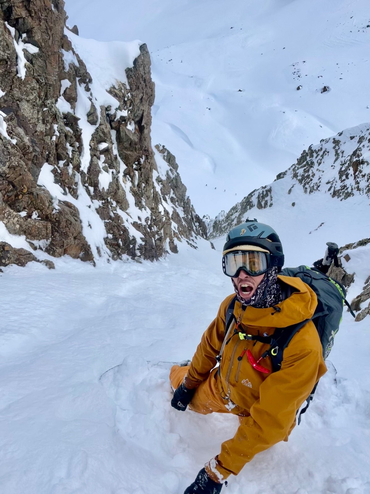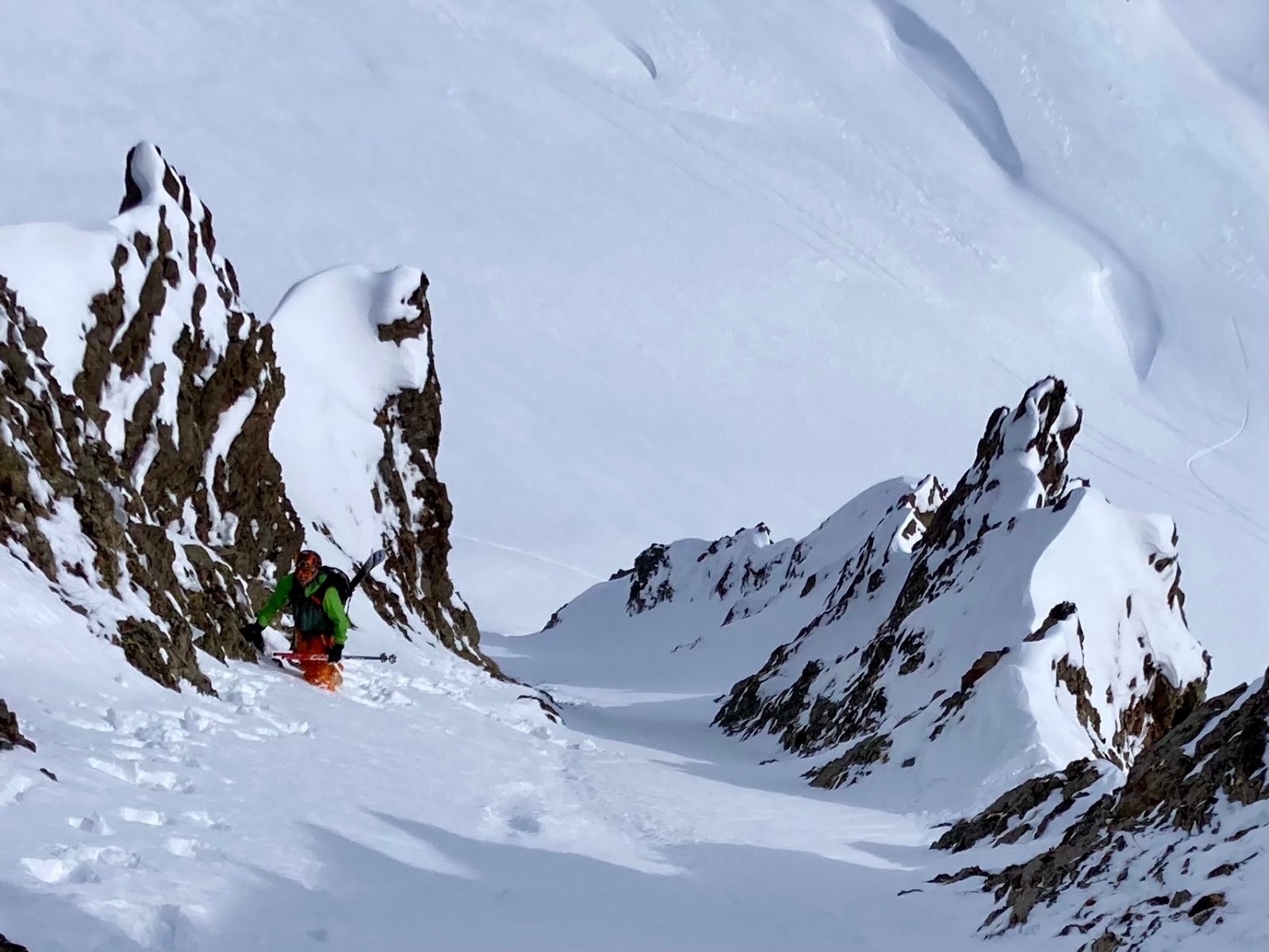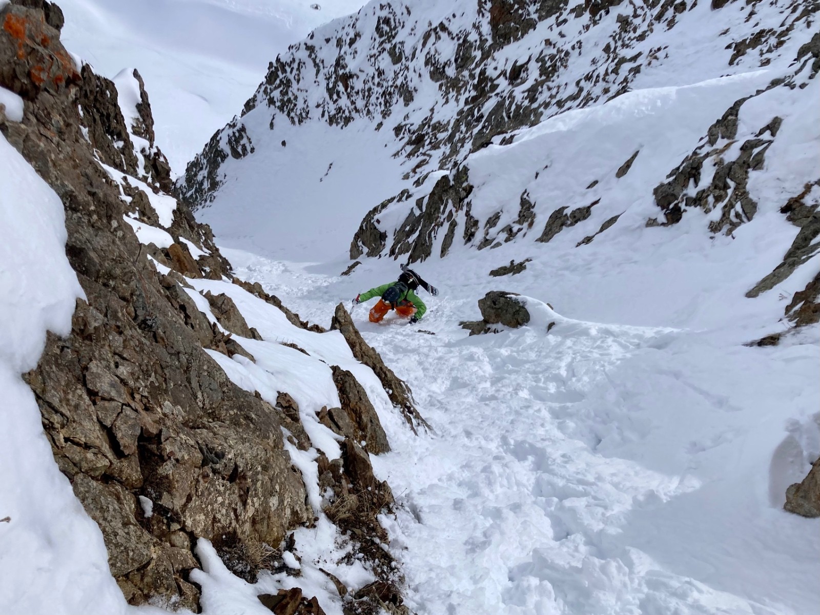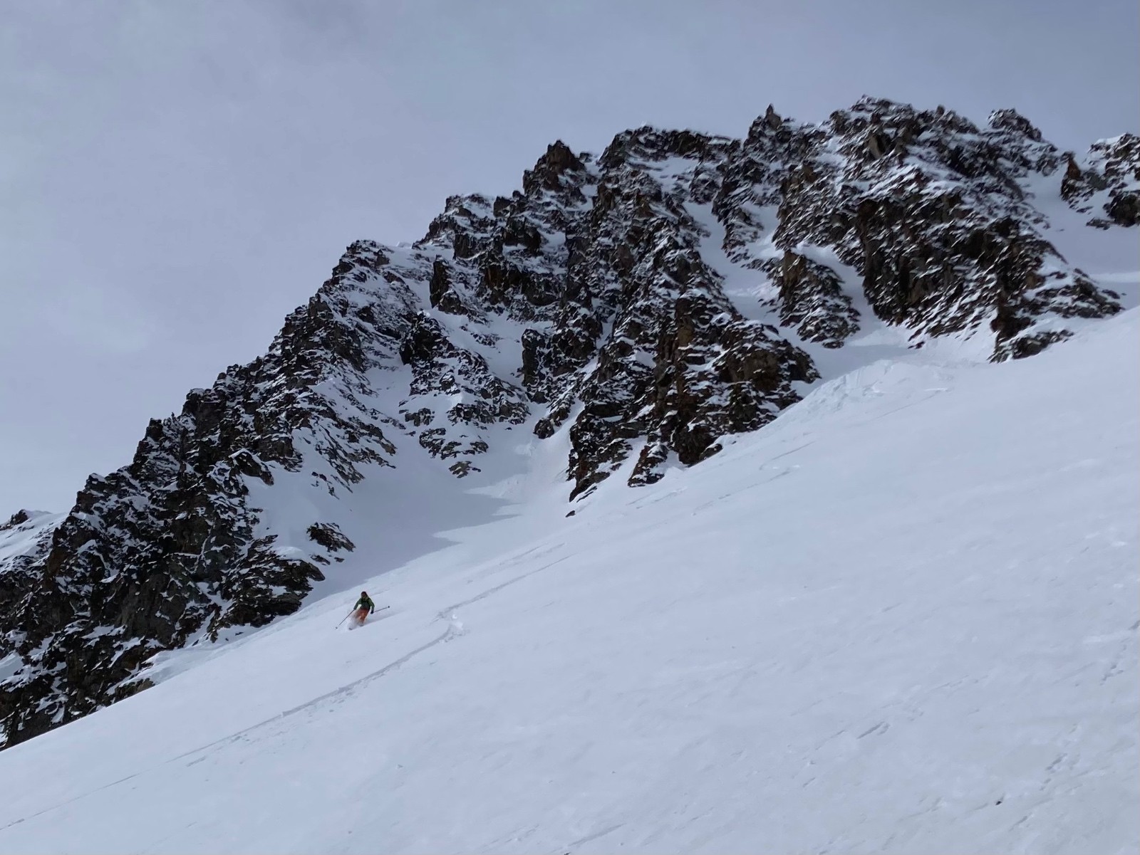 J’avais dans un coin la tête depuis plusieurs saisons la goulotte Harmonie Paradoxale skiée par Hervé Degonon, et c’est en passant au pied de la face que le couloir du jour s’est révélé praticable. L’autre goulotte imposait un trop long passage à pied à la descente…
