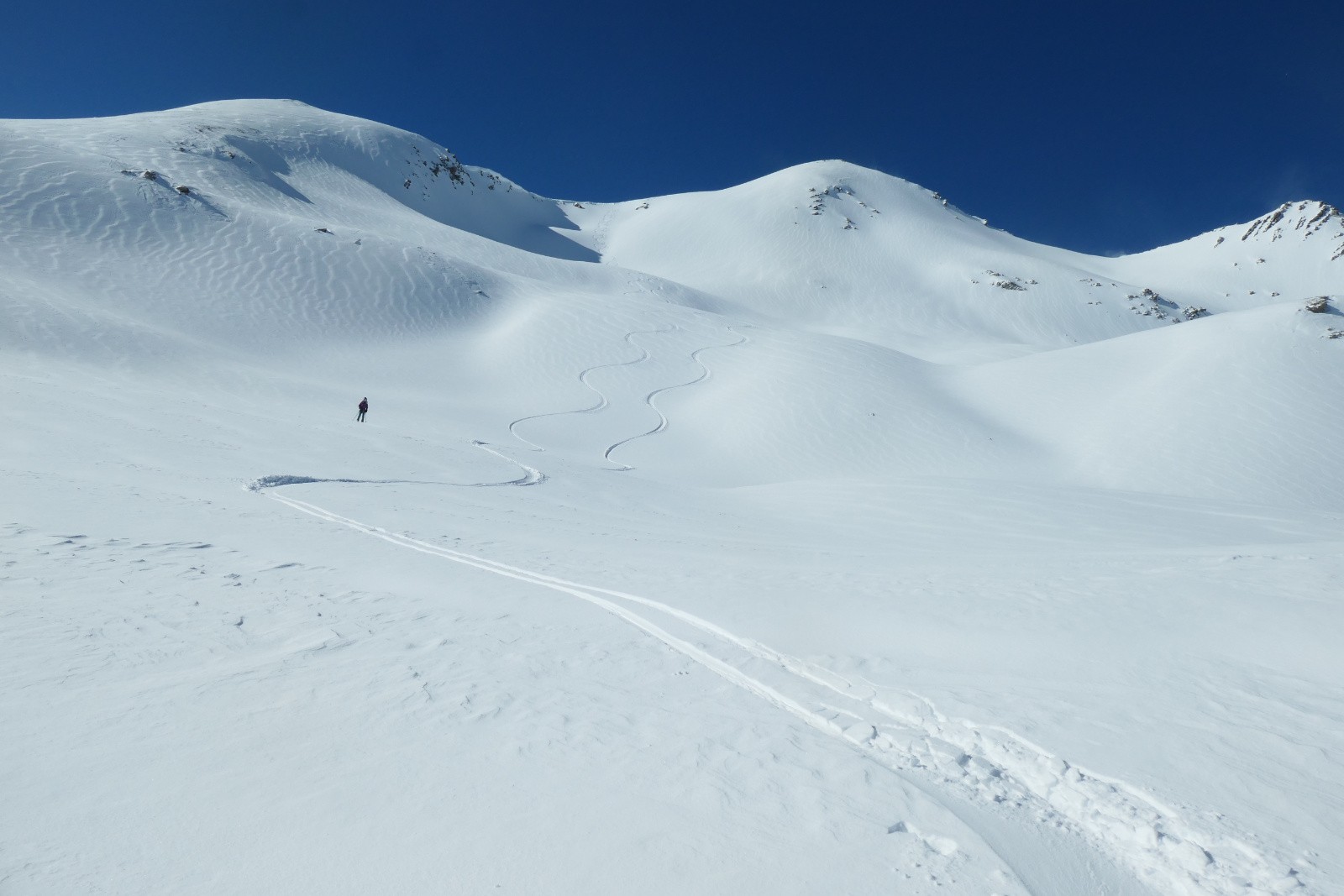 2 voitures au parking qui semblent avoir dormi là. Et un vent qui nous cueille au départ. Pas si fort mais d'un caractère plutôt désagréable. Qu'importe, le ciel est dégagé, malgré quelques nuages qui prennent encore les sommets, et de belles combes blanches et vierges se dessinent devant nous. Fichtre, nous allons tracer le Pic Blanc du Galibier! Par cette matinée calme, et sous le vent continu, on a l'impression d'échapper au temps. On jette parfois un coup d'oeil dans le rétro, nous sommes bien seuls. Au-dessus de 2600m on est globalement plus abrités, la trace est facile, on progresse aisément. On voit bien l'effet de vent qui a décapé quelques buttes dans le vallon et inscrit des vaguelettes dans la poudre. Passé 2800m un premier wouf se manifeste, pourtant l'aspect du manteau neigeux était rassurant. On double donc de vigilance pour la pente finale en prenant la crête au moins pentu. On passe un par un la dernière pente et on atteint le sommet 2-3wouf plus tard. Ce sera bien assez raide pour aujourd'hui. Le Vallon de l'Anesse a l'air tout poudreux, on choisit donc d'aller le visiter pour une première descente. Excellent choix, le vallon a été d'ailleurs moins soumis au vent que de l'autre côté, nous bénéficions d'une poudre bien sympathique jusqu'à 2400m. Plus bas, on sent le fond dur et quelques boulettes d'une coulée partie pendant les chutes, mais le ski reste bien bon. Stop à la rivière pour remonter au sommet. On apprécie la remontée sans vent, dans ce vallon qui semble à ce moment oublié du monde alors que nous sommes juste sous les 3 Evéchés. Sous la pente finale, deux skieurs nous rejoignent, inspirés par l'élégance de nos traces de descente. On les recroisera plusieurs fois au fil de nos pérégrinations. C'est vrai que c'était bon! Nous rejoignons la crête en quelques wouf supplémentaires puis le sommet qui s'est ou la foule commence à arriver. Plus aucun signe d'instabilité, c'est étonnant comme on est plus confiant sur la nivologie une fois que la trace est faite...