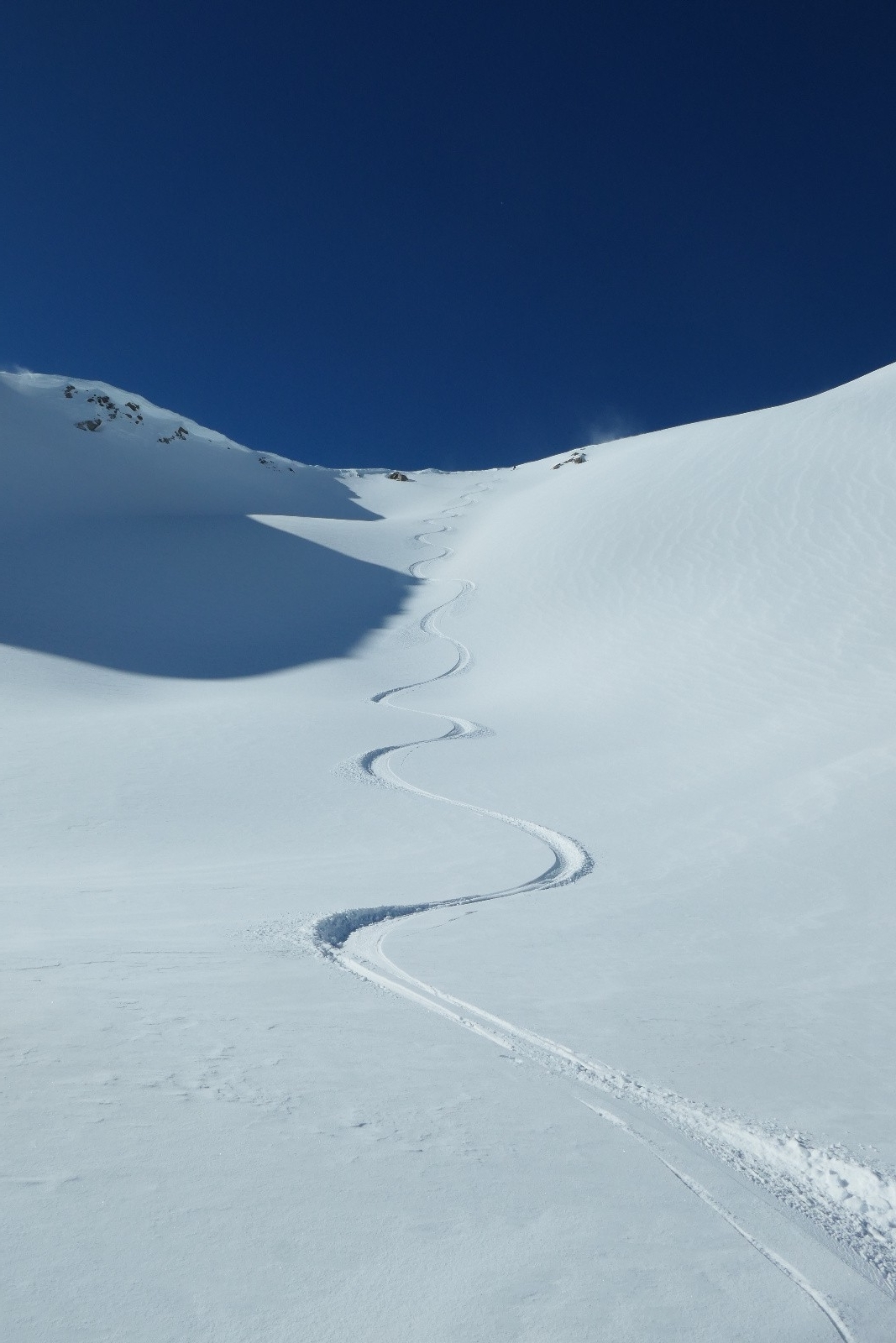 On s'offre encore quelques virage vers l'Anesse, dans cette combe Nord où la neige ne s'est pas encore alourdie au soleil. Dernier repeautage pour rejoindre la crête du Pic Blanc du Galibier avant de redescendre par le Sud. On boucle par le Vallon de Roche Noire dans une poudre un peu plus lourde mais très agréable. Ce sera sans doute une croûte demain, on profite de pouvoir skier cette belle neige dans son premier jour! Une bien belle journée!