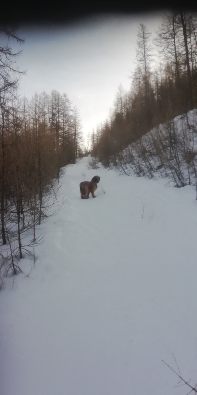 En dessous de 2 100 m, neige humide très lourde. Heureusement on rejoint le chemin de montée.