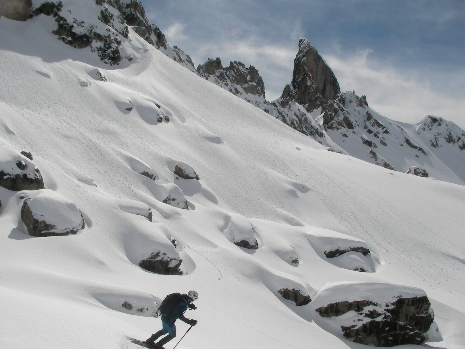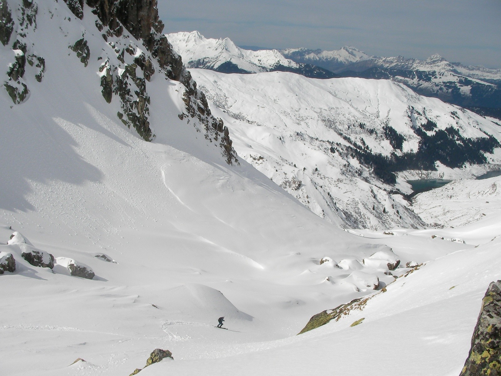 - Descente col de Charbonnière en neige poudreuse dense sur fond dur.