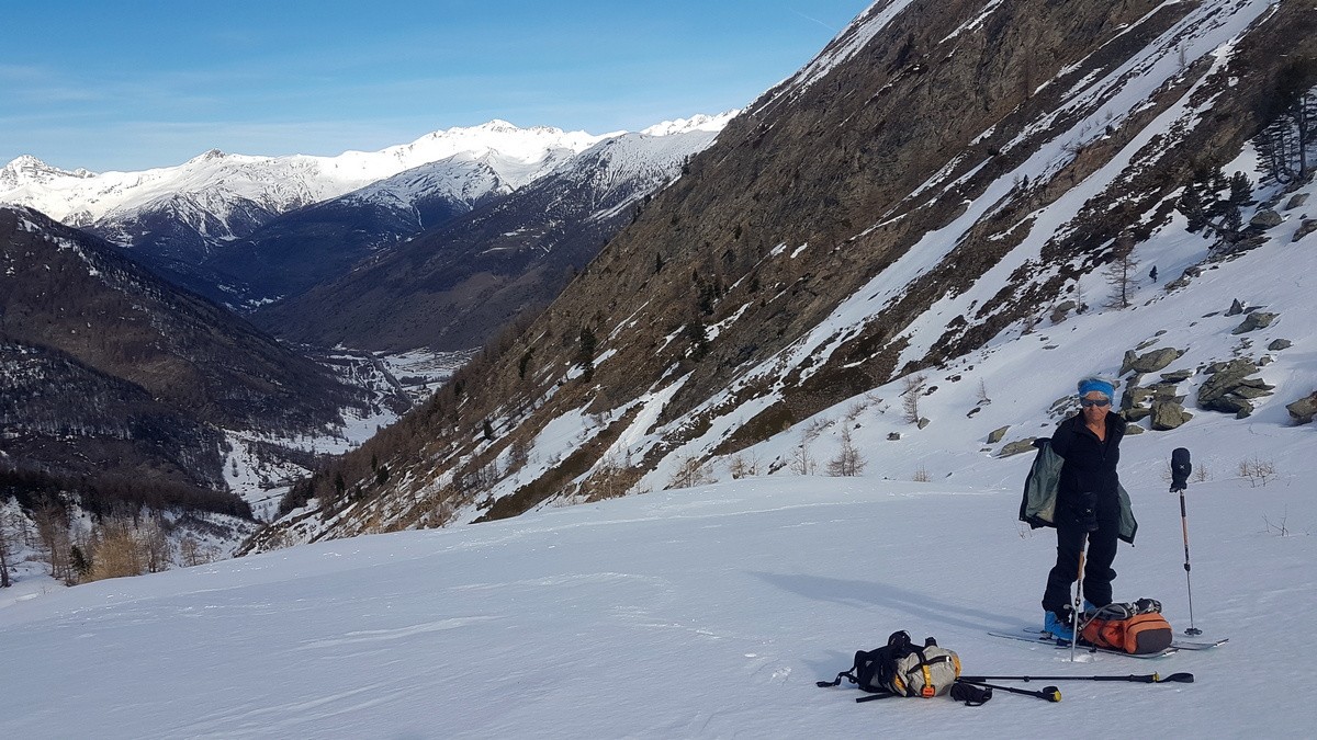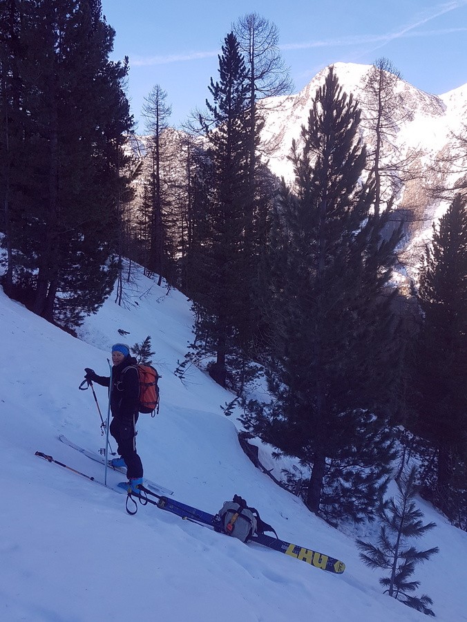 Itinéraire suivi : le topo. A la montée, le chemin d'été n'est pas un chemin d'hiver... Il est donc relativement difficile à suivre. Le faible enneigement nous a amené à monter à pied un moment dans la partie inférieure du bois. Attention, à la cote 2000 m, il faut bien s'assurer d’être sur le fameux chemin pour contourner l'épaule orientée nord-ouest qui permet d'accéder au vallon supérieur. Ensuite, c'est du billard, les couteaux étaient bienvenus. Mais nous n'avons pas fait le vrai sommet rocheux. Sans doute faisable, cependant. Descente sur neige bien dure. Arrivé dans les bois inférieurs, il faut trouver le bon itinéraire qui permet de ne pas déchausser. Pour une fois, nous étions les seules âmes qui vivent sur cette sortie !