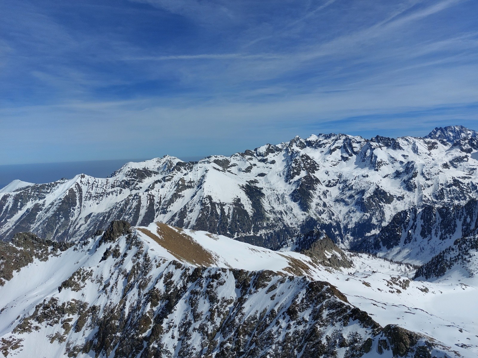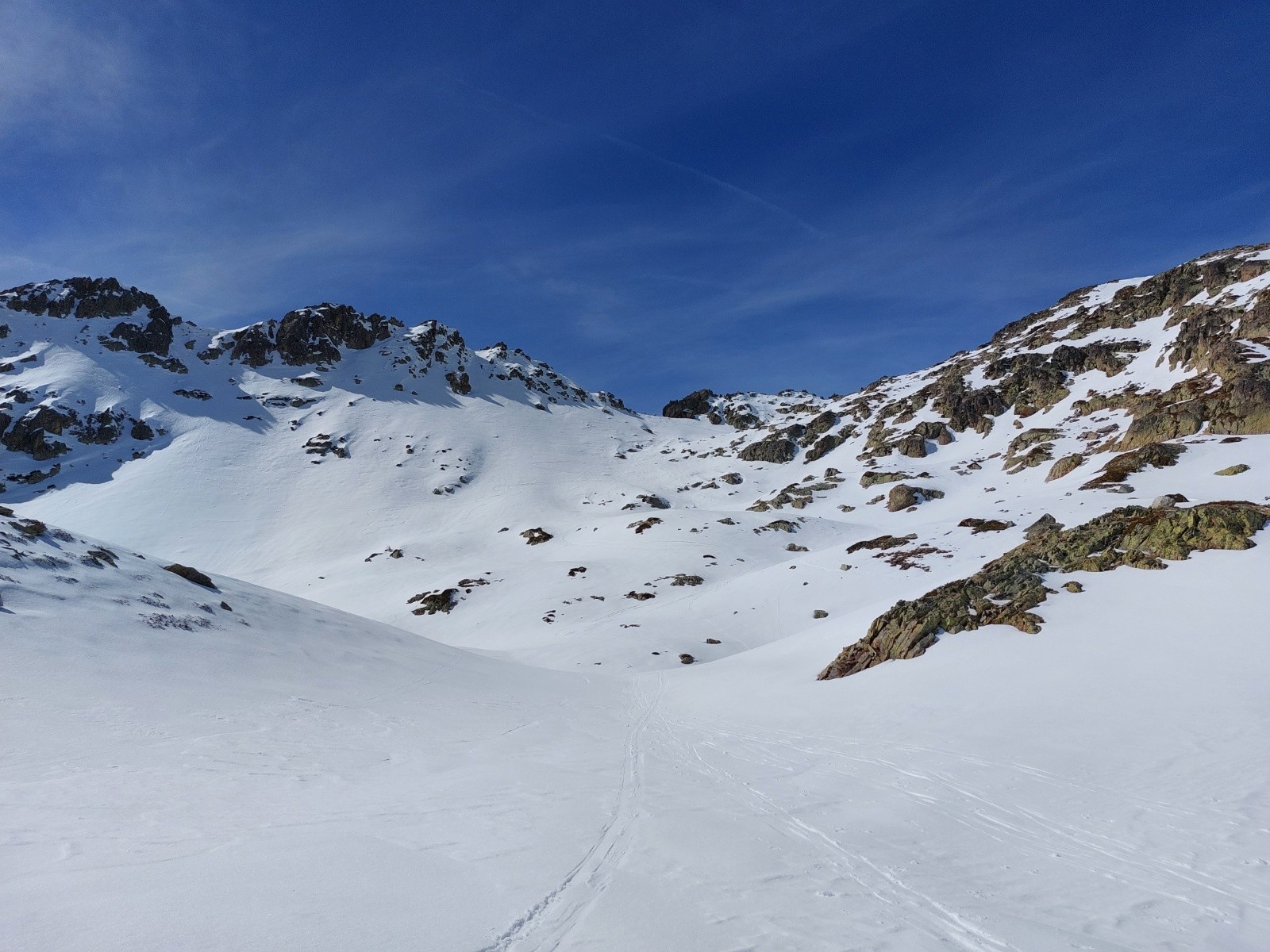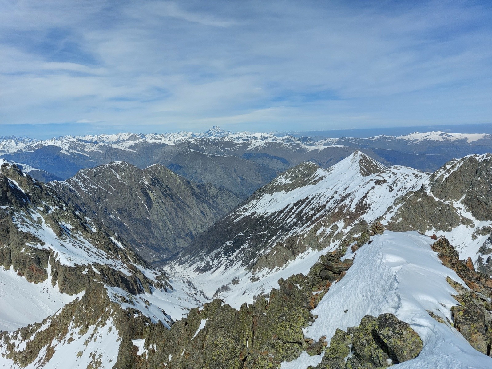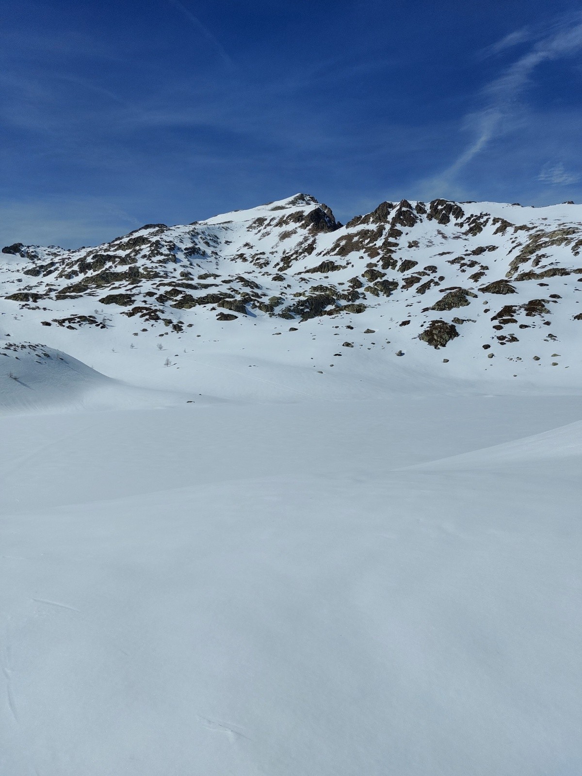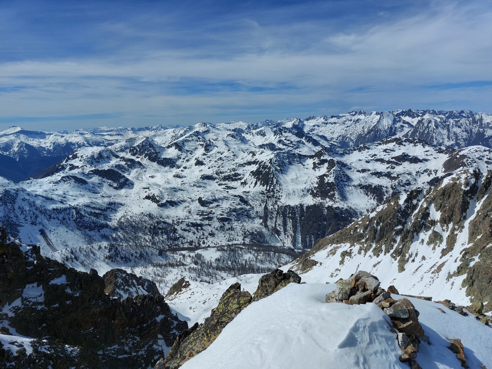 Excellente suite de descente jusqu'à la bifurcation. Repeautage et montée sans histoire jusqu'au lac < d'Aver. Au-dessus ça chauffe bien, une peau se décolle puis je la perds. Je la remets et m'efforce de tracer le plus droit possible pour éviter les entrées de neige. Ça tient tant bien que mal jusque sous le sommet puis elle saute et je finis avec une seule peau dans le raide juste sous la cime, pas simple mais ça passe, un groupe de 4 arrive juste avant moi.