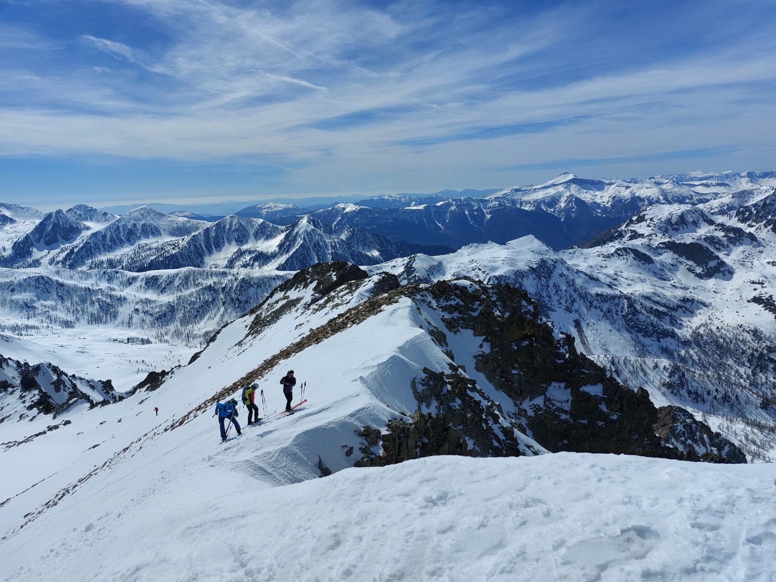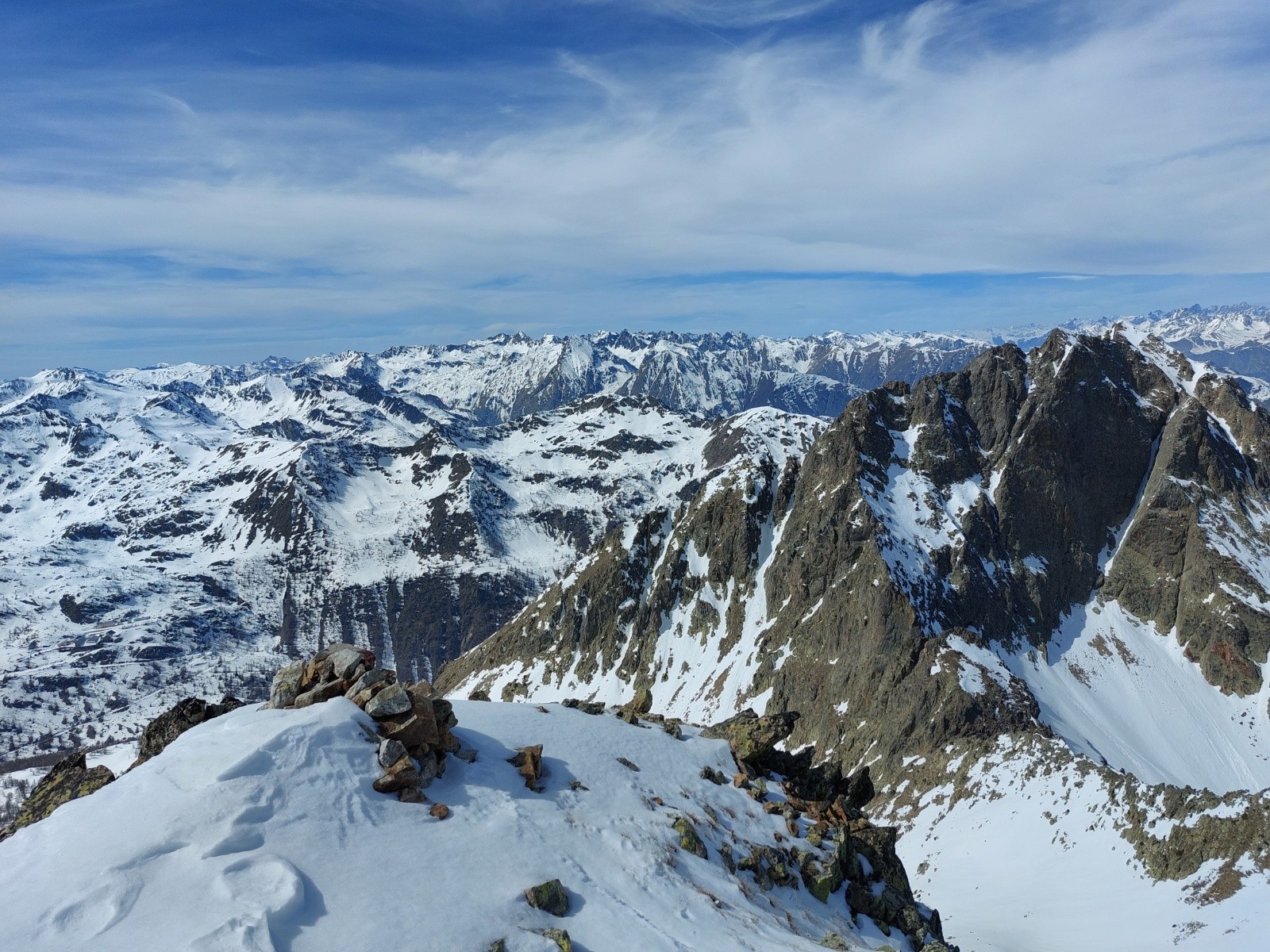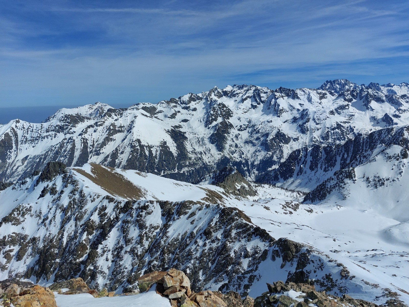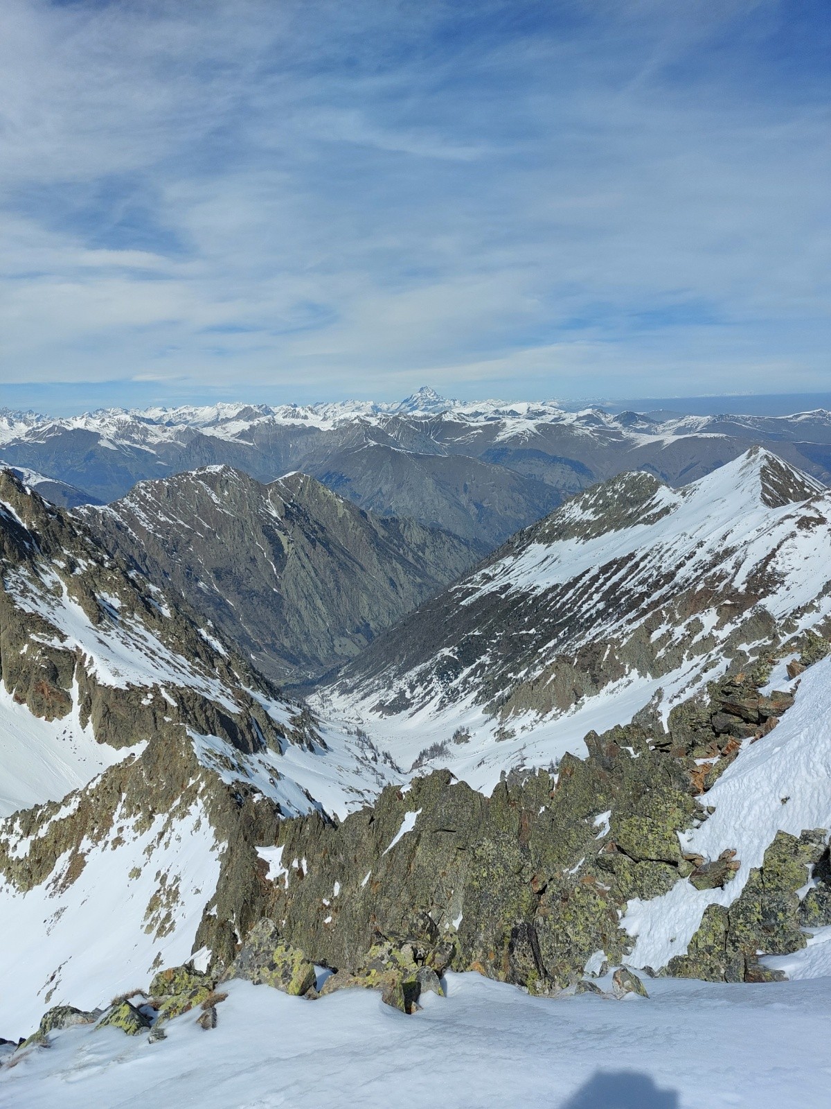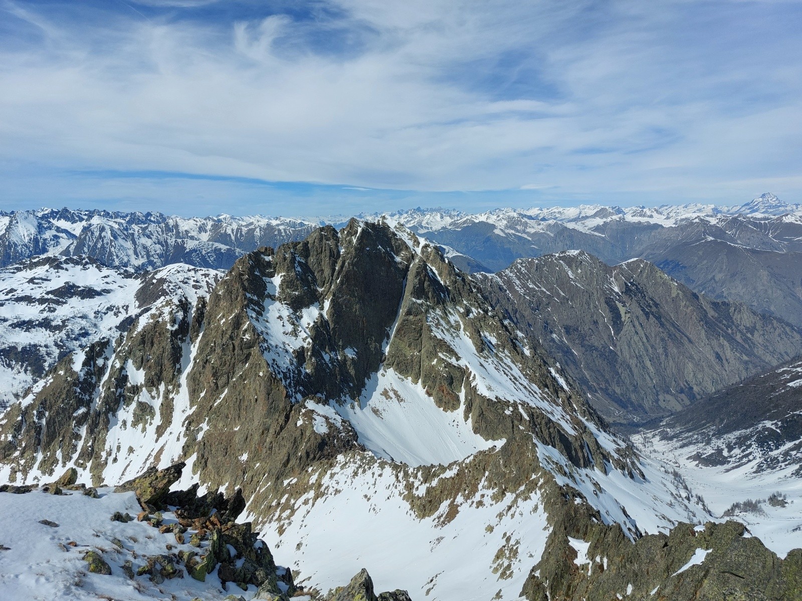 Excellente suite de descente jusqu'à la bifurcation. Repeautage et montée sans histoire jusqu'au lac < d'Aver. Au-dessus ça chauffe bien, une peau se décolle puis je la perds. Je la remets et m'efforce de tracer le plus droit possible pour éviter les entrées de neige. Ça tient tant bien que mal jusque sous le sommet puis elle saute et je finis avec une seule peau dans le raide juste sous la cime, pas simple mais ça passe, un groupe de 4 arrive juste avant moi.