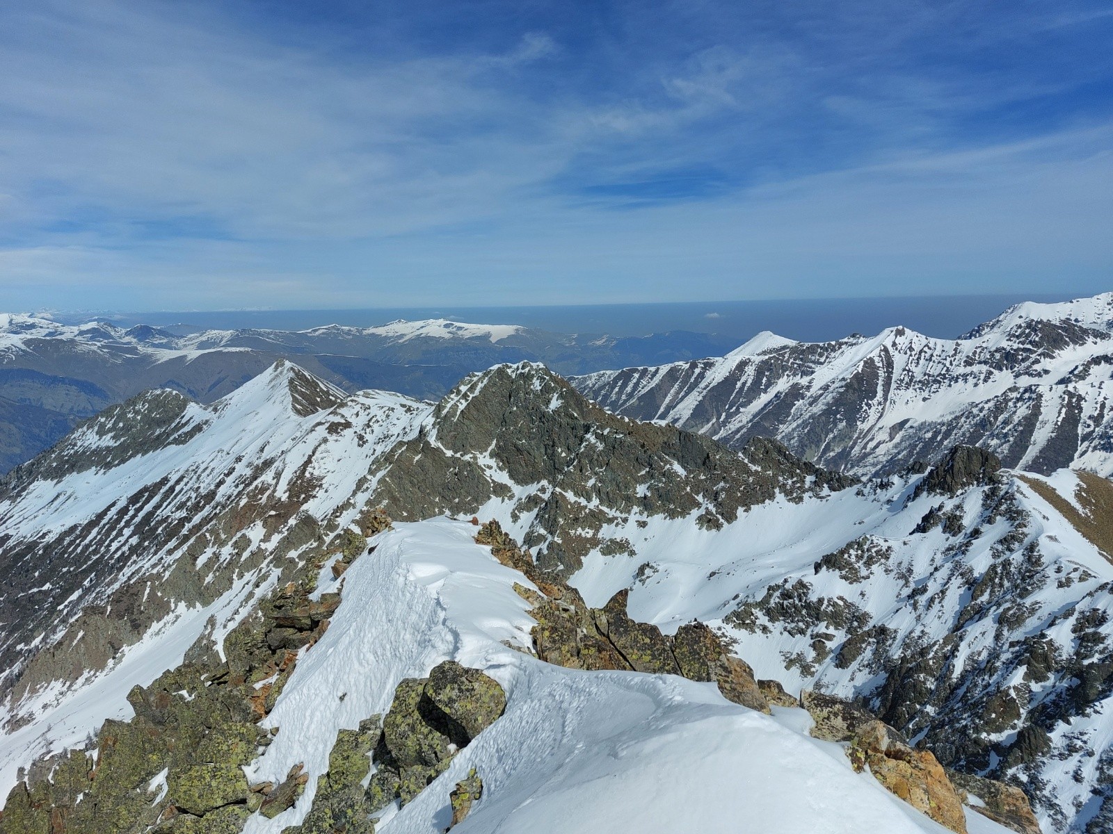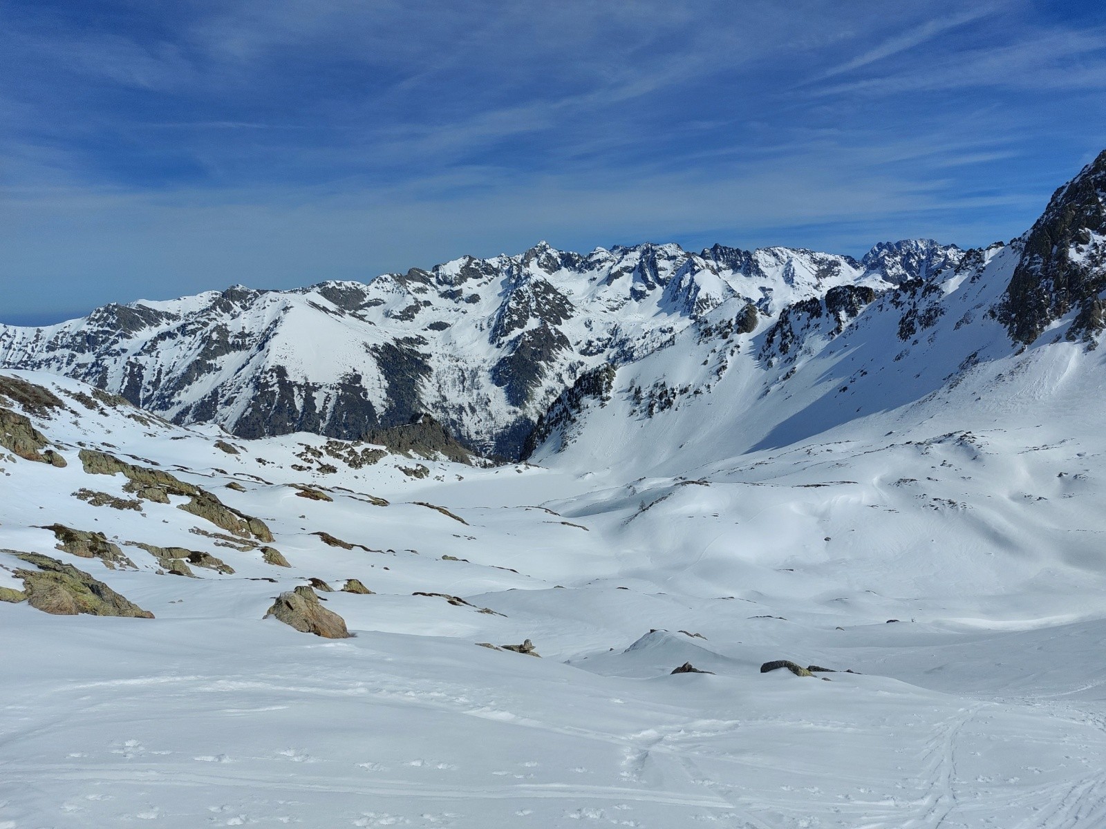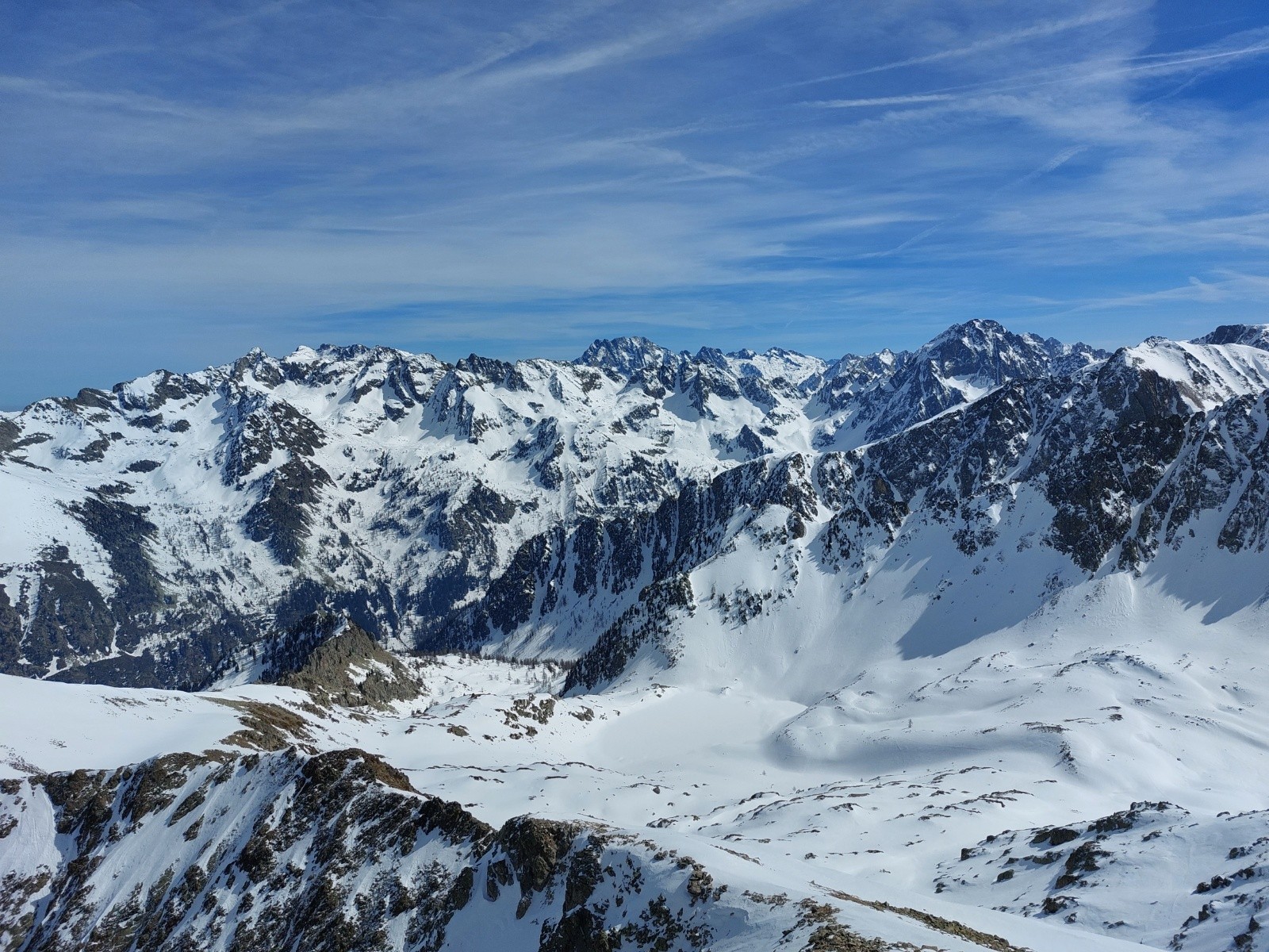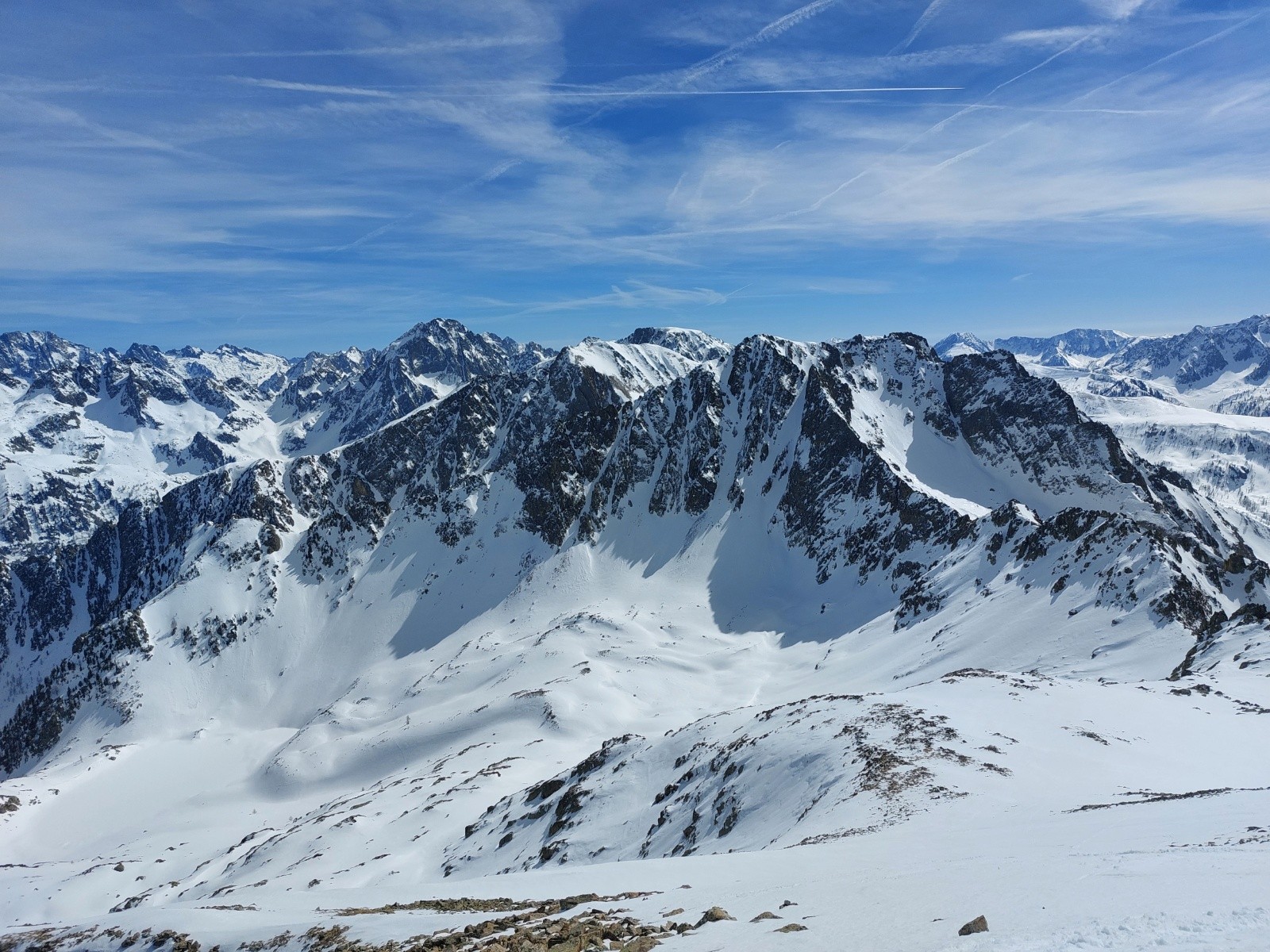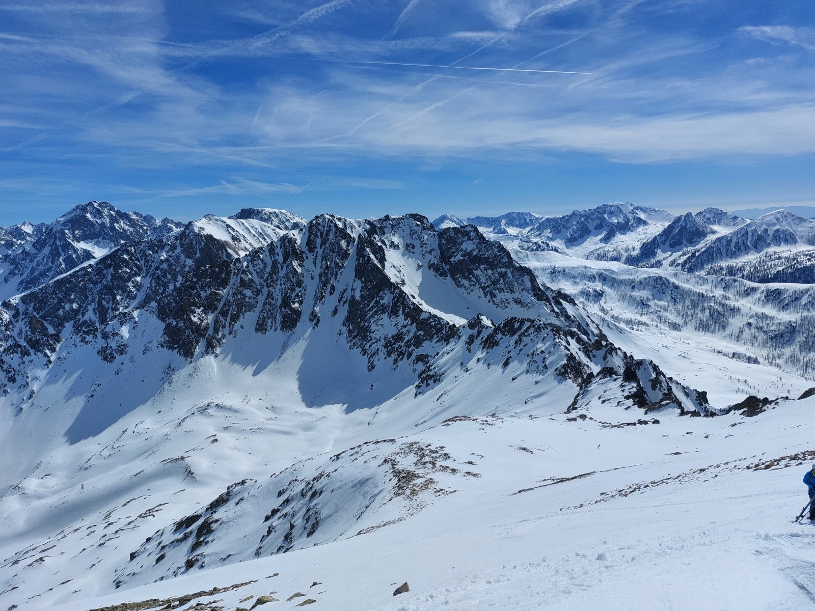 Excellente suite de descente jusqu'à la bifurcation. Repeautage et montée sans histoire jusqu'au lac < d'Aver. Au-dessus ça chauffe bien, une peau se décolle puis je la perds. Je la remets et m'efforce de tracer le plus droit possible pour éviter les entrées de neige. Ça tient tant bien que mal jusque sous le sommet puis elle saute et je finis avec une seule peau dans le raide juste sous la cime, pas simple mais ça passe, un groupe de 4 arrive juste avant moi.