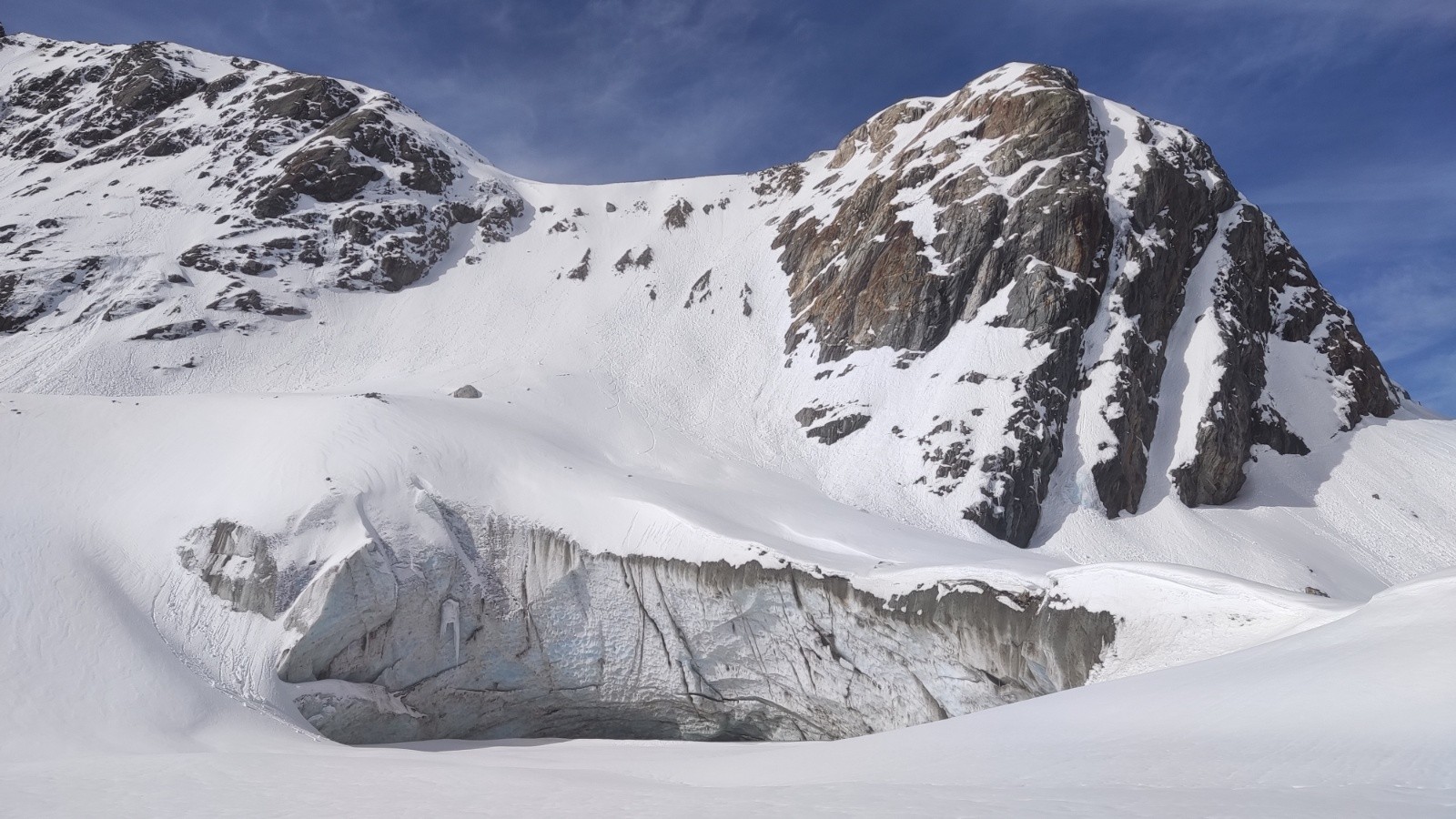 On remet les skis pour descendre sur le plat du glacier. La haute montagne nous ouvre ses portes sous un ciel légèrement voilé. Le paysage est sublime avec les seracs apparents mais nous ne croiserons aucune crevasse ouverte.
