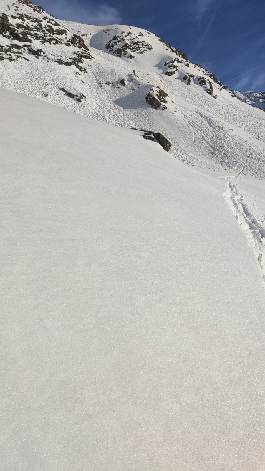 Les 100 premiers mètres entre le sommet et le début du glacier, la neige est dure et traffolée. Et là le rêve prend forme. Une énorme pente de 30 à 45 degrés immaculée avec une couche de poudreuse à en faire baver plus d'un. Les virages se succèdent sans jamais s'arrêter. Mes jambes au bout du rouleau m'obligent à m'arrêter régulièrement.