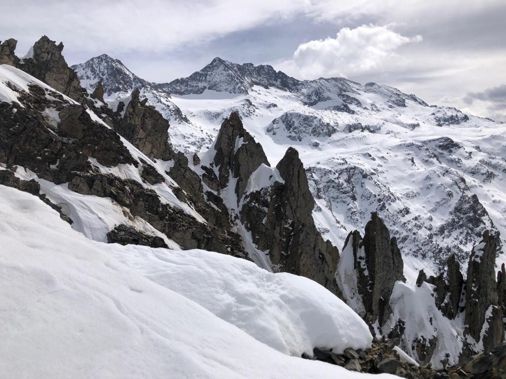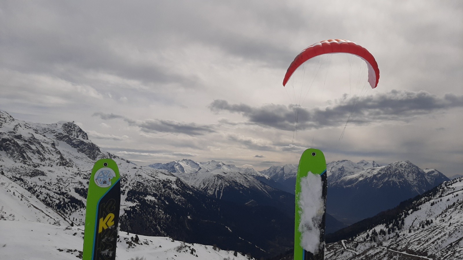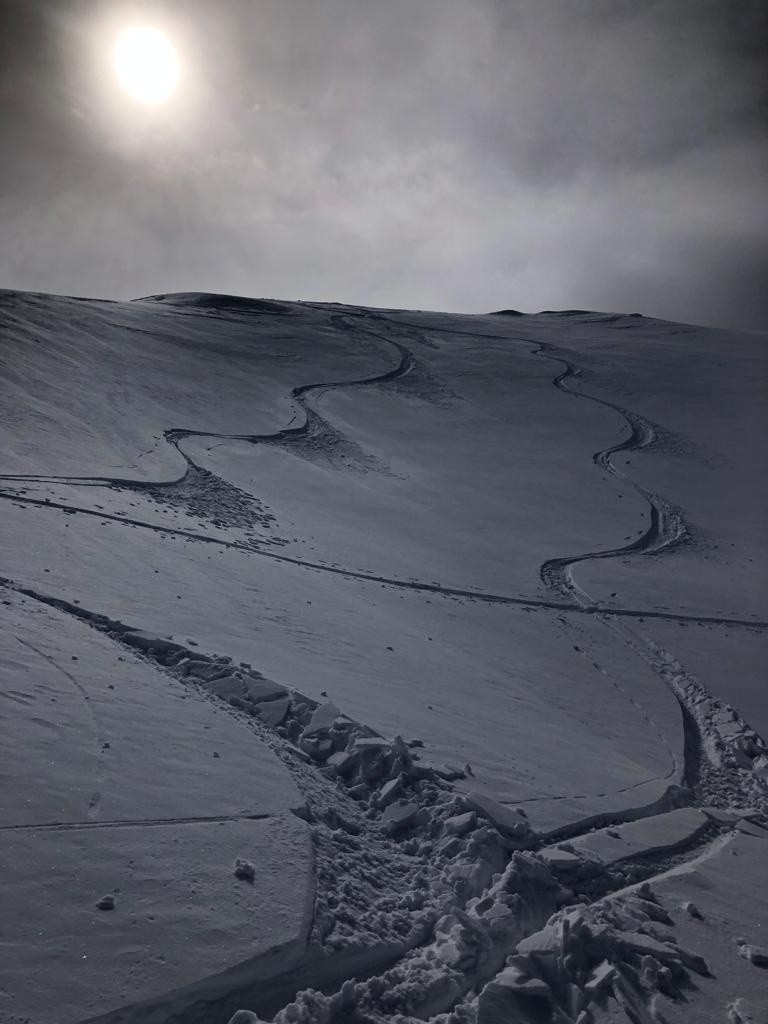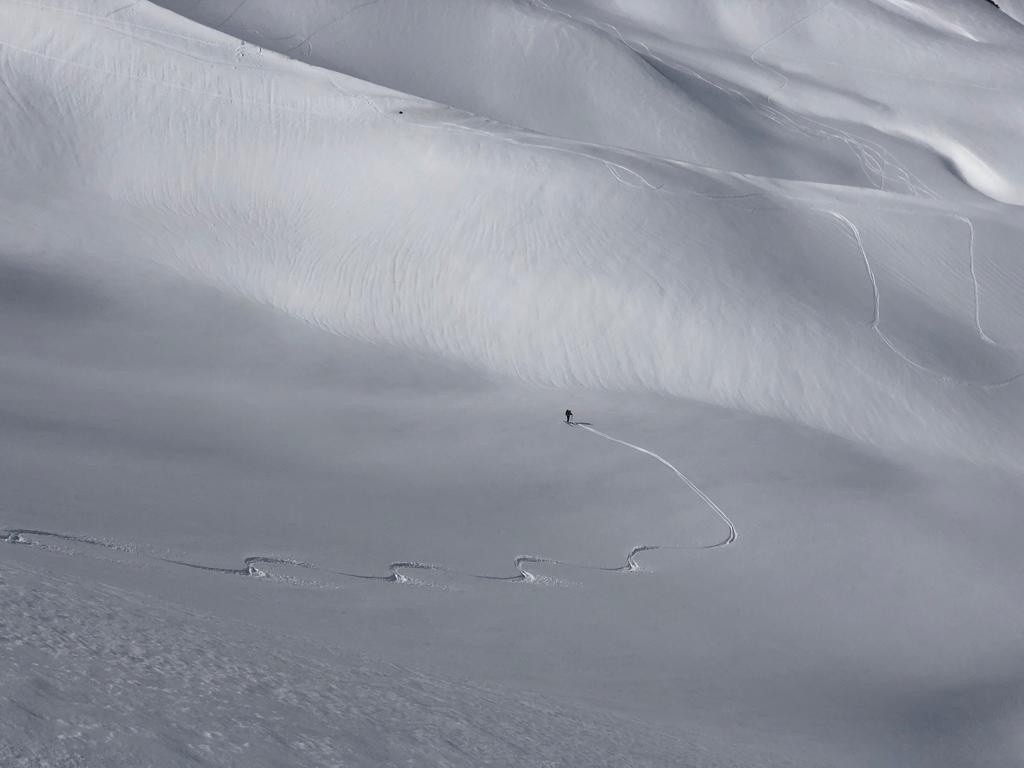 Avec le peu d'enneigement sur la montée vers le col du sabot, les arrêtes de Vaujany nous ont semblées bien adaptées comme objectif de ski de rando en attendant la montée du vent pour une séance de ski kite. Une bonne petite poudreuse tassée en première descente sous côte belle nous comblera avant de remonter sur les arrêtes de Vaujany. On croisera à plusieurs reprises le groupe sympathiques des CAFistes de Lyon dans nos remontées descentes successives à ski. Méfiance mais bonne surprise pour la descente NW sous les arrêtes avant de retourner sous le col du sabot pour entamer une séance de kite ski malgré le peu de vent. Belle démonstration de Jean et ses copains à la manipulation des voiles qui remonteront au col du sabot poussés par le peu de vent. Pour moi ce sera partie remise, pétole et initiation kite ca ne va pas ensemble.