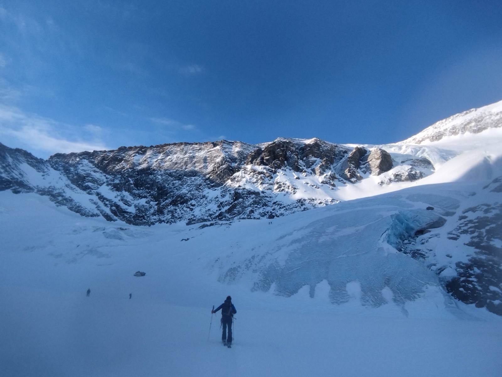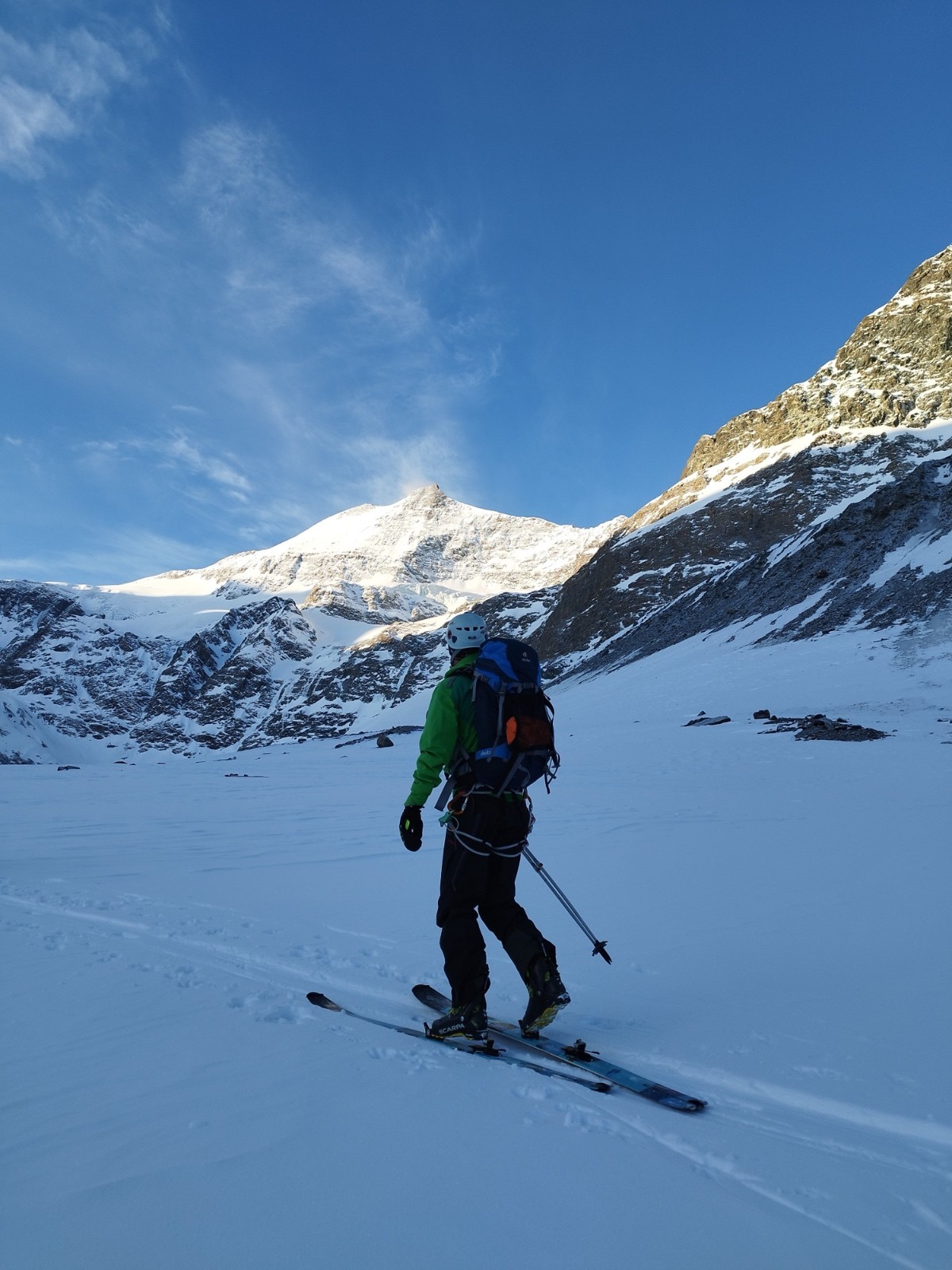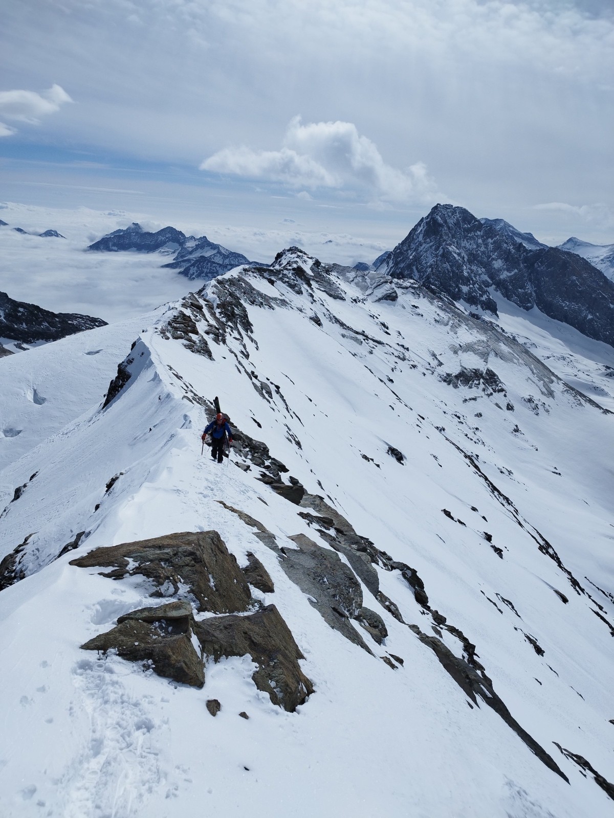 J3/ Départ 6h45. Mère Théo France annonce une couverture nuageuse autour de midi et un plafond autour de 2500-3000m. On décolle sour un grand ciel bleu et de belles lumières. Les diots ont la banane. Nous prenons un rythme de sénateur, le but étant de ne pas griller toute les cartouches avant d'attaquer l'arrête. La montée est bien tracée et seine. Une petite chute de sérac a eu lieu, laissant trainée quelques beaux flacons sur le passage. La montée à la selle passe sans souci, les crevasses sont peu ouvertes et visibles dans l'ensemble. On atteint la selle a 10H30. La bande attaque l'arrête vers 10H45 au point 3474m. Nous évoluons non encordés d'un commun accord. L'arrête est tracée, quelques pas demandent de l'attention notamment avant la croix. Je propose la corde mais personne n'en ressent le besoin. Alors nous filons vers le sommet, concentrés. Superbe ambiance sur cette arrête. Mais ça bourgeonne fort tout autour. On atteint le sommet à midi. Le voile nuageux s'installe autour de nous en mode Armagédon. Une cordée de 3 fait le rappel peu avant nous. Nous attendons. Un guide (Ben de Serre-Che 😉✌️) et son groupe nous rattrape alors. Mais la cocotte se referme. Le temps de faire les manips et c'est le jour blanc intégral. On se rapproche de Ben pour se concertés et descendre en sécu ensemble. On ne vois strictement rien, on ne sais pas si on monte ou on descend. Nous tombons parfois a l'arrêt!! On oublie rapidement l'option descente par le Vallonet supérieur crevassé et paumatoire pour switcher sur une descente par le Grand fond et rallier la Goulaz. Après 45 min de descente en chasse neige, encordés et recroquevillés pour ne pas perdre les traces nous retrouvons un peu de visi au dessus du lac du grand fond et un peu de sérénité aussi. Fin de descente jusque la Goulaz et séance de skating finale histoire de cramer les dernières cartouches.