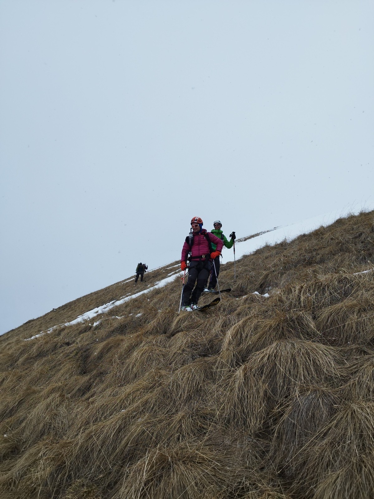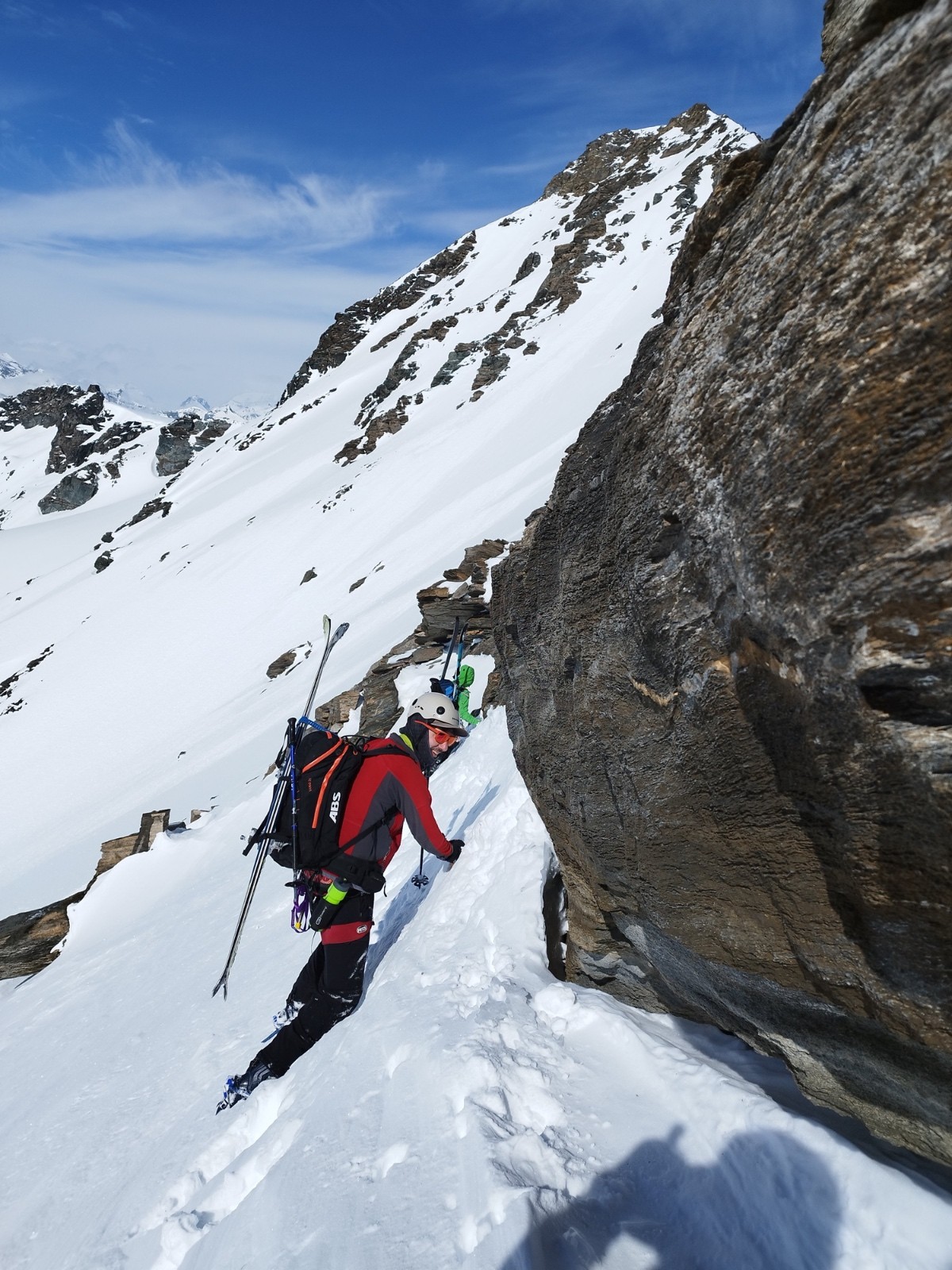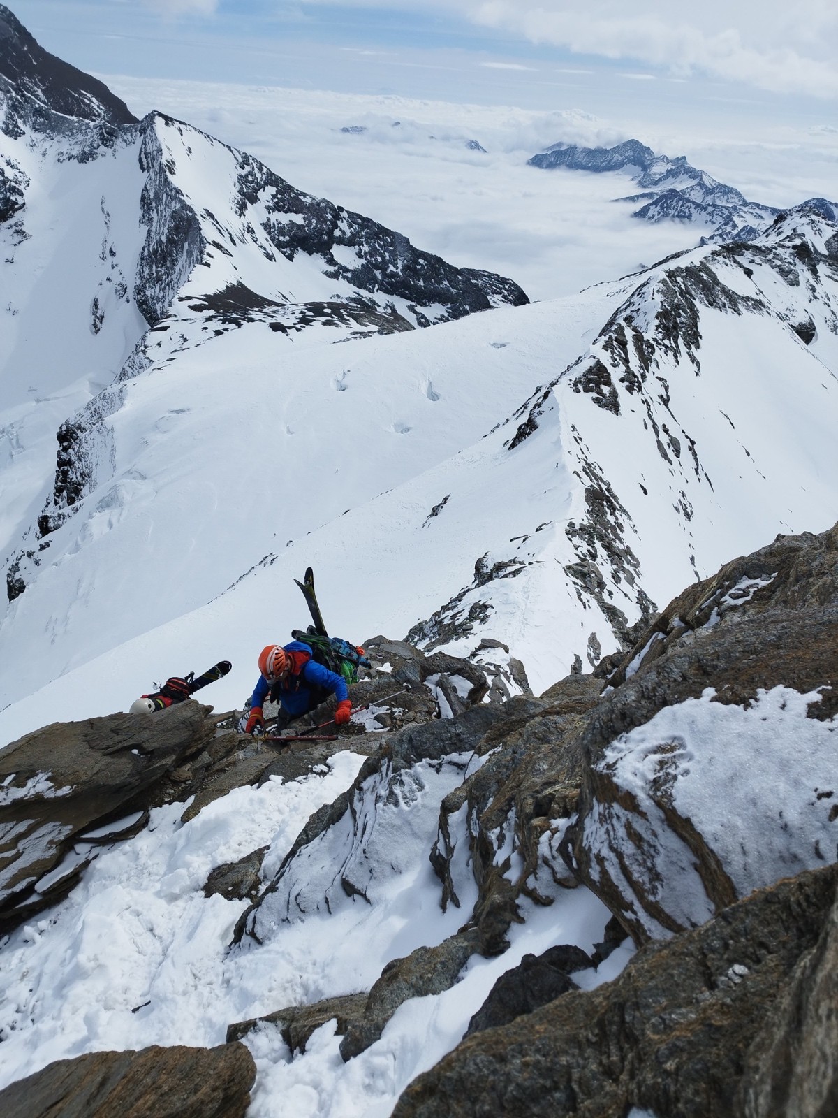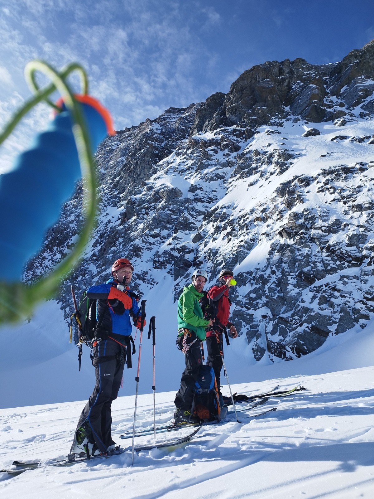 J3/ Départ 6h45. Mère Théo France annonce une couverture nuageuse autour de midi et un plafond autour de 2500-3000m. On décolle sour un grand ciel bleu et de belles lumières. Les diots ont la banane. Nous prenons un rythme de sénateur, le but étant de ne pas griller toute les cartouches avant d'attaquer l'arrête. La montée est bien tracée et seine. Une petite chute de sérac a eu lieu, laissant trainée quelques beaux flacons sur le passage. La montée à la selle passe sans souci, les crevasses sont peu ouvertes et visibles dans l'ensemble. On atteint la selle a 10H30. La bande attaque l'arrête vers 10H45 au point 3474m. Nous évoluons non encordés d'un commun accord. L'arrête est tracée, quelques pas demandent de l'attention notamment avant la croix. Je propose la corde mais personne n'en ressent le besoin. Alors nous filons vers le sommet, concentrés. Superbe ambiance sur cette arrête. Mais ça bourgeonne fort tout autour. On atteint le sommet à midi. Le voile nuageux s'installe autour de nous en mode Armagédon. Une cordée de 3 fait le rappel peu avant nous. Nous attendons. Un guide (Ben de Serre-Che 😉✌️) et son groupe nous rattrape alors. Mais la cocotte se referme. Le temps de faire les manips et c'est le jour blanc intégral. On se rapproche de Ben pour se concertés et descendre en sécu ensemble. On ne vois strictement rien, on ne sais pas si on monte ou on descend. Nous tombons parfois a l'arrêt!! On oublie rapidement l'option descente par le Vallonet supérieur crevassé et paumatoire pour switcher sur une descente par le Grand fond et rallier la Goulaz. Après 45 min de descente en chasse neige, encordés et recroquevillés pour ne pas perdre les traces nous retrouvons un peu de visi au dessus du lac du grand fond et un peu de sérénité aussi. Fin de descente jusque la Goulaz et séance de skating finale histoire de cramer les dernières cartouches.