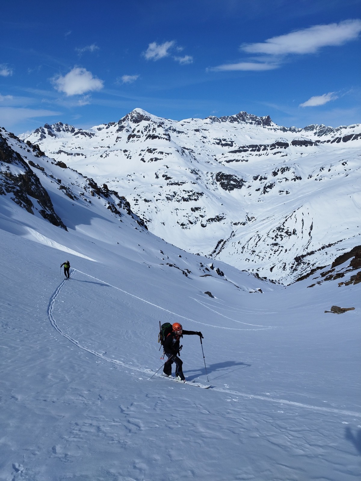 La vue sur le glacier du Gran Méan et les sommets alentours y est splendide. La traversée du glacier se fait parfaitement, mais sous une grosse chaleur. la grosse de doit coule à flot. Mais ça le fait, la troupe gère! Les crevasses sont visibles et le cheminement à travers "sécurisant" pour le moment. Depuis le col du Grand Méan nous rallions le col di san Stefano pour une descente plus directe sur les Evettes. Nous trouverons quelques passages poudreux sous la pointe de Bonneval.
