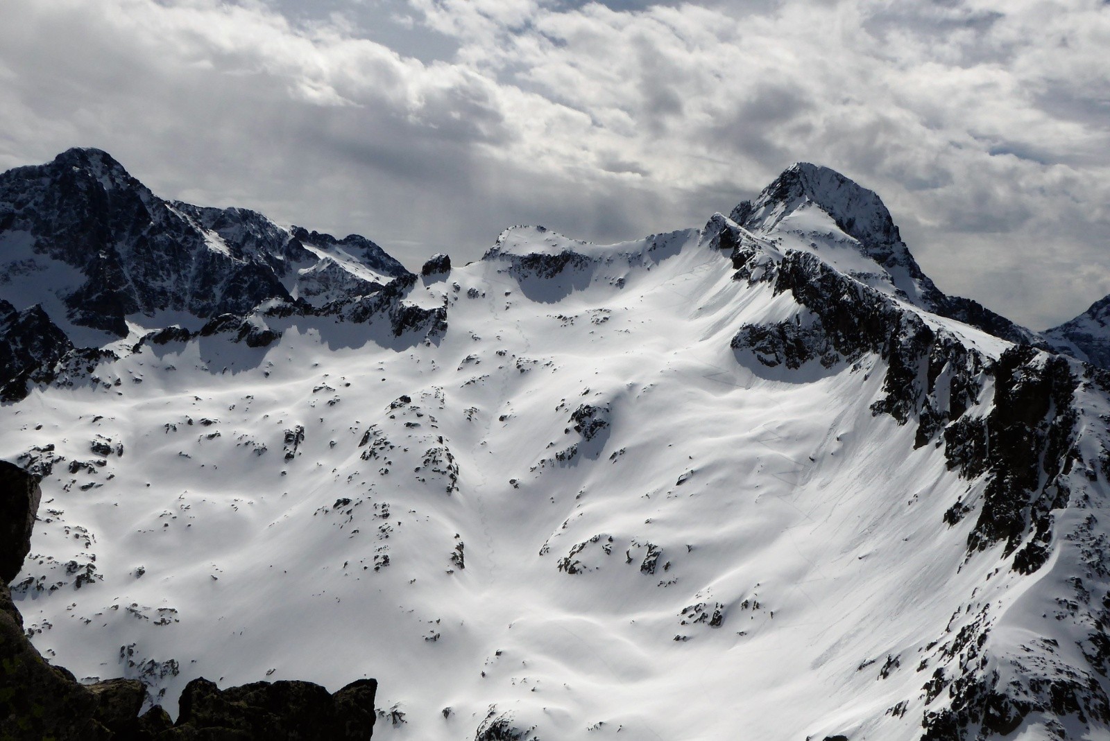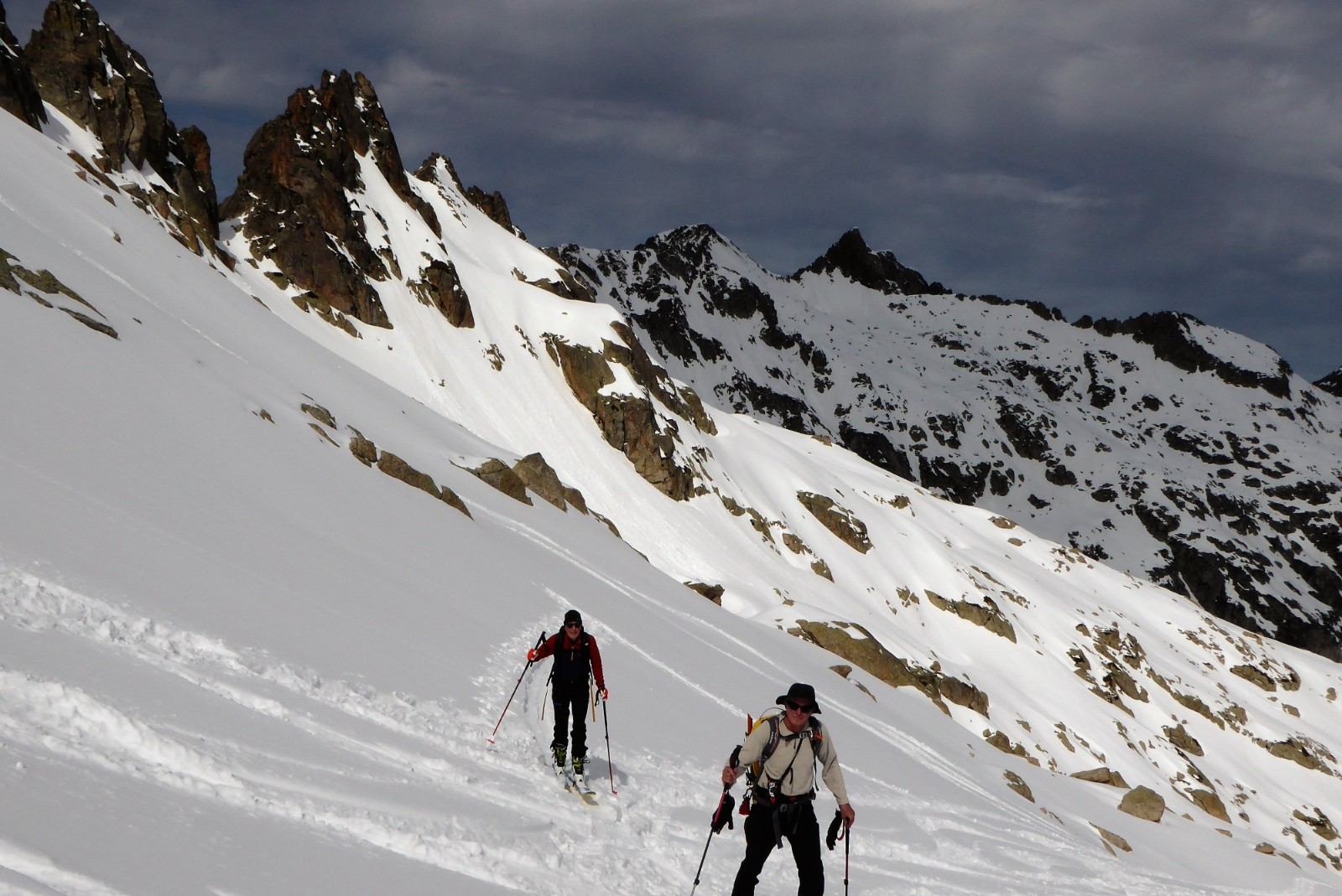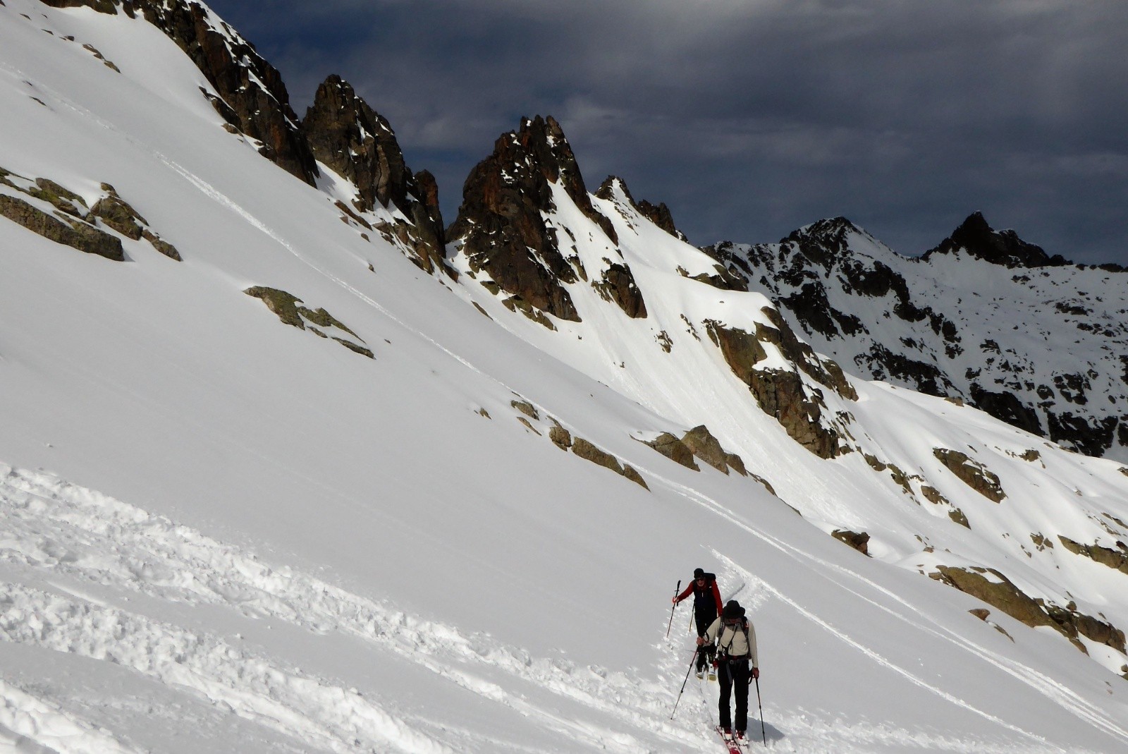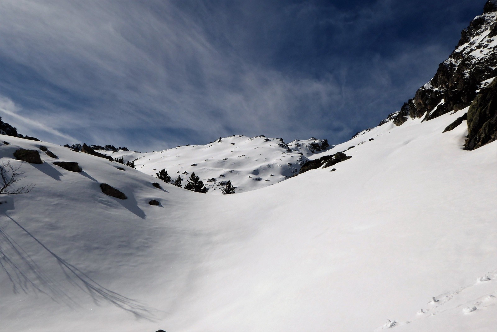 On a porter jusqu'à la conduite 1780m neige bien portante mais pas besoin de couteaux ; neige parfaite pour la descente 50% poudre 50% moquette poil court (un peu en mode "sanglier rider" juste une cinquantaine de mètres au dessus de la conduite), juste 5 traces de skis et des vallons que pour nous.