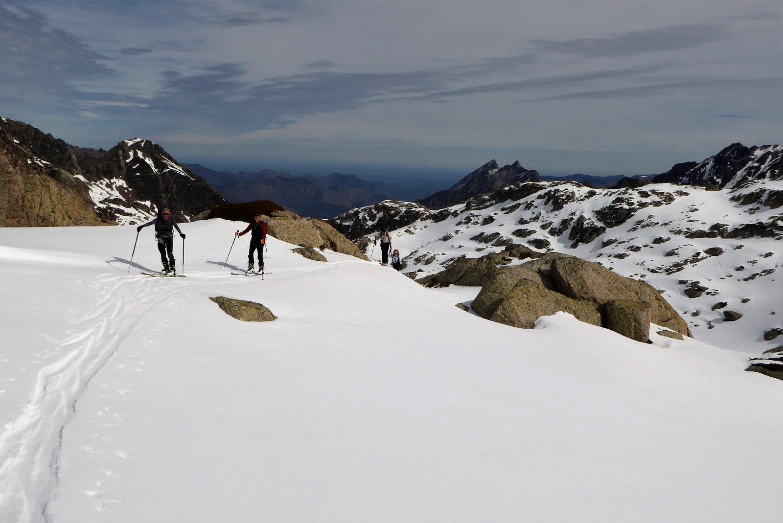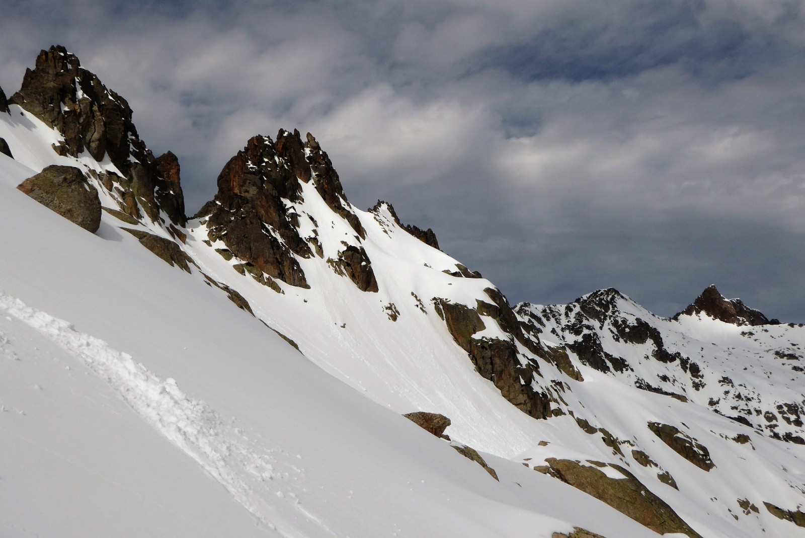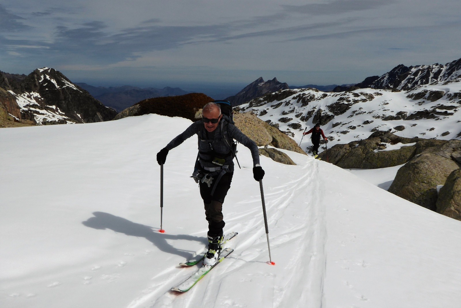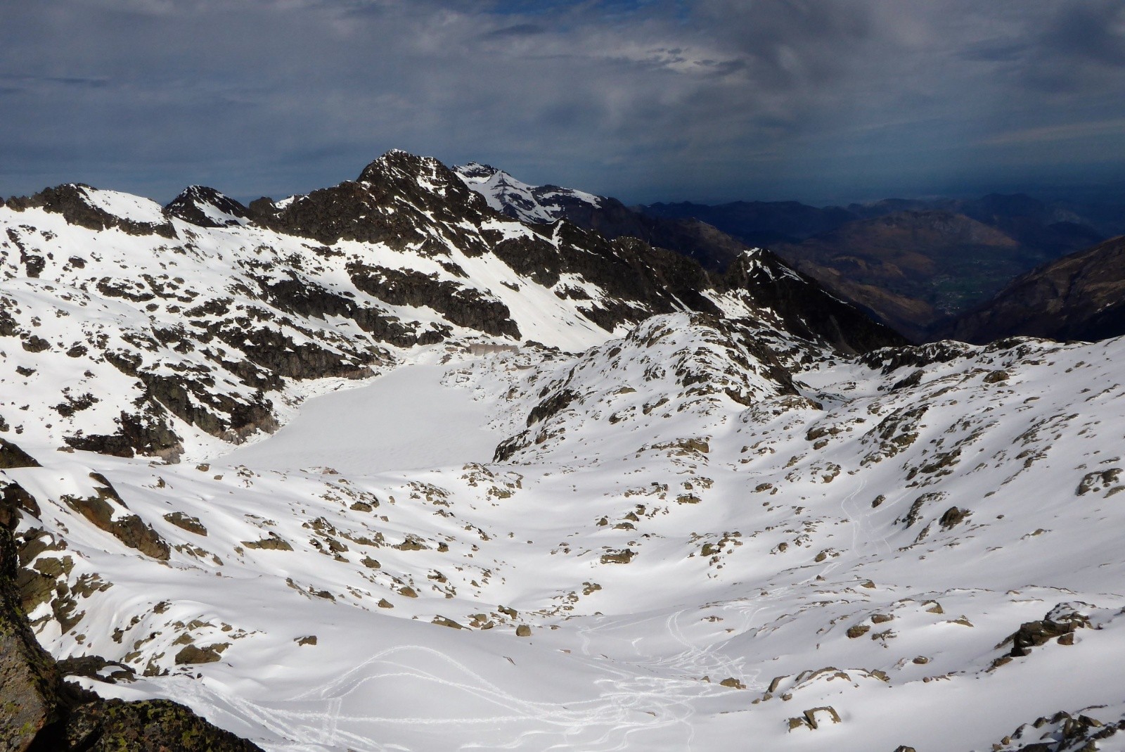 On a porter jusqu'à la conduite 1780m neige bien portante mais pas besoin de couteaux ; neige parfaite pour la descente 50% poudre 50% moquette poil court (un peu en mode "sanglier rider" juste une cinquantaine de mètres au dessus de la conduite), juste 5 traces de skis et des vallons que pour nous.