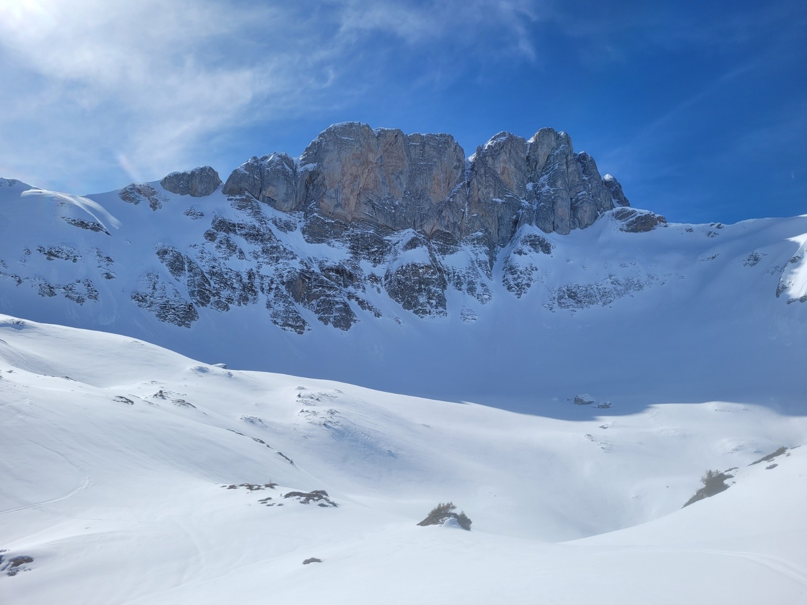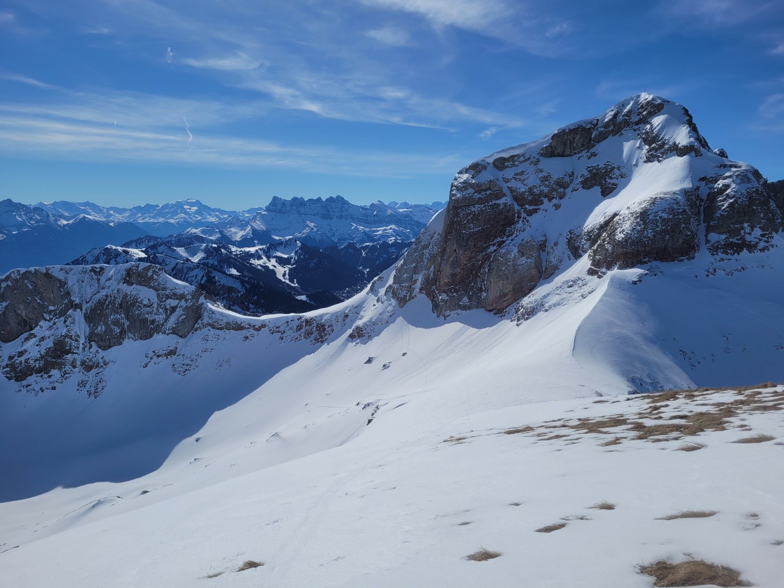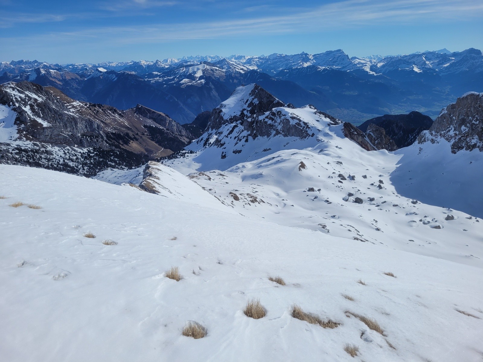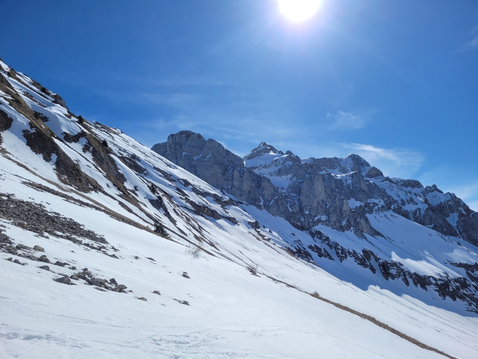 Itinéraire suivi : Vallon de Bise, depuis Fontaine. Absolument seul toute la matinée ! J'ai juste dérangé malgré moi une trentaine de bouquetins qui broutaient les pentes déjà déneigées sous la Dent du Vélan. Pas une trace depuis le Col d'Ugeon, ambiance sauvage garantie !!