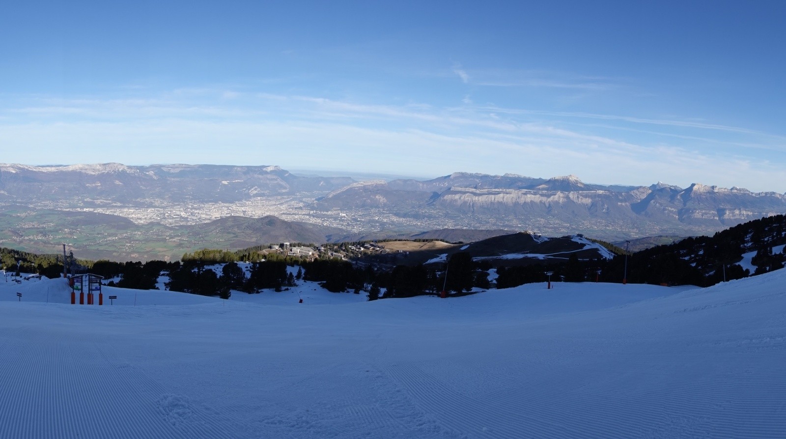 Grand calme à Chamrousse. Il fait presque jour à 5h45 quand je pars. Les pistes ont été damées la veille. Le ciel clair a favorisé un regel nocturne. J’aurai dû mettre mes couteaux. J’aurai dû …