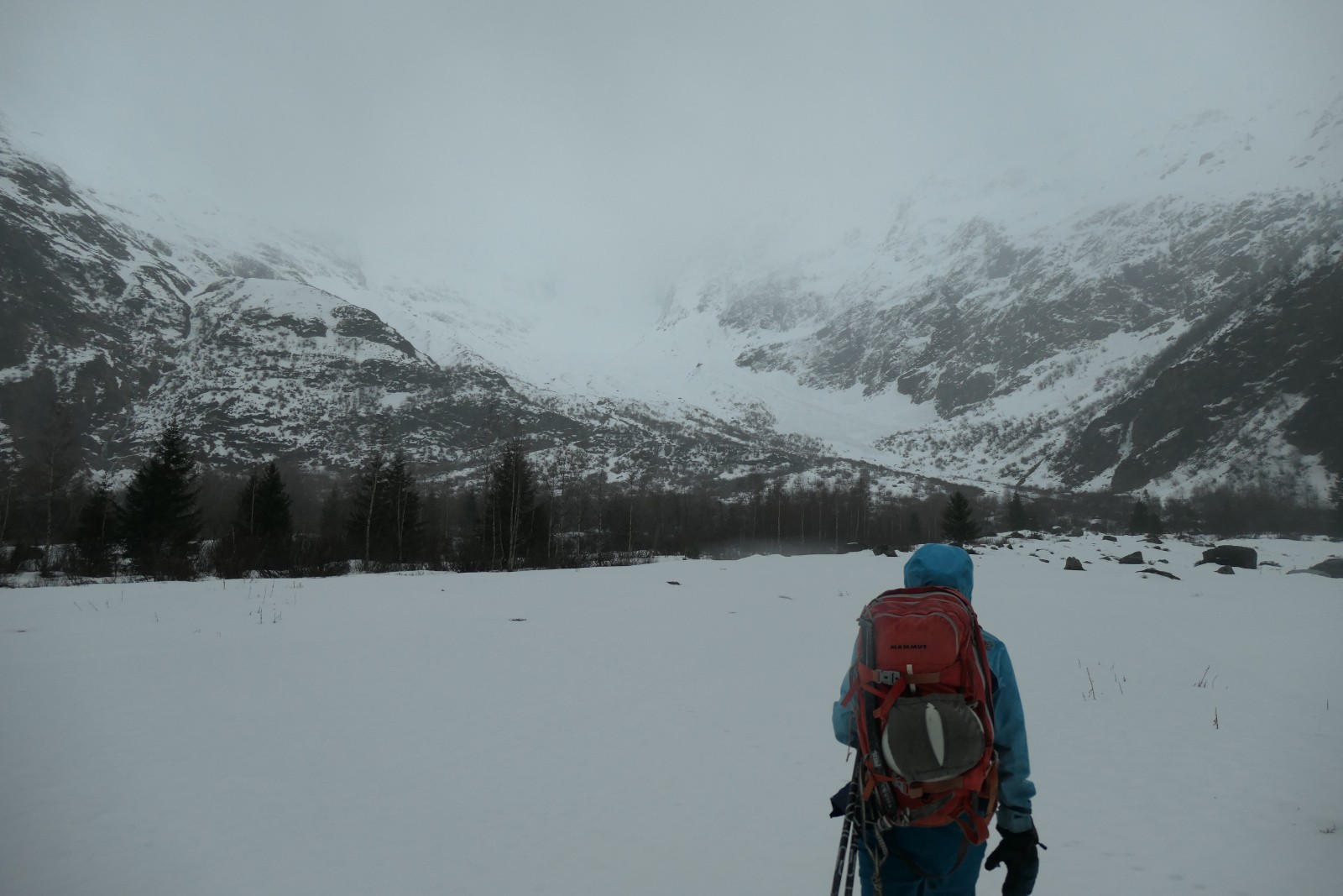 On espère arriver aux chalets de Miage avant que la pluie ne nous attrape histoire que toute notre sortie se passe sous la neige. En mettant les skis sur le sac au sortir de la voiture quelques gouttes semblent vouloir se montrer, mais comme il fait encore bien sombre on arrive à les ignorer. On s'apprête à remonter une longue piste assez plate, la déclivité de la route fini rapidement de nous réveiller, les mollets auraient apprécié un échauffement! Nous cheminons sous la pluie au gré des détonations des pida environnants, le moral un peu dans les chaussettes, mais tant qu'elles sont encore sèches on est confiants. On laisse les baskets juste avant la redescente sur les chalets Miage (la piste redescend un peu) sous une nouvelle averse qui sera continue, après environ 500m de portage. Le traversée du plateau se fait en ski sous la pluie, on a bien quelques doutes mais la limite pluie-neige n'est plus très loin, maintenant qu'on est là autant essayer d'aller faire quelques virages. On a le temps de contempler ce beau cirque sous les Dômes de Miage avant que les précipitations ne s'intensifient. Ensuite on atteint la neige, et un regain de motivation apparaît. C'est vrai que c'est beau la montagne sous la neige, un spectacle qu'on a eu peu l'occasion d'observer cette saison. On s'est déjà rabattus sur le couloir des Chèvres plutôt que le couloir S vu le temps, on progresse, tantôt sereins, tantôt hésitants. Le vent semble se manifester et on se fait un peu malmener pour atteindre un petit couloir sous la pointe supérieure du Tricot (nous sommes montés trop haut pour le couloir des Chèvres), fouettés par la neige. Ensuite on est plus protégés. On poursuit donc notre ascension, un certain Bottamor est venu s'inviter à la sortie. Rapidement on constate que le vent s'engouffre dans le couloir en rafales assez puissantes. La neige cumule vite, nos traces disparaissent presque instantanément. Dans la tourmente et le bottage, et les habits complètement trempés on s'arrête là dépeautant et déguerpissant sans traîner. Le haut est poudreux déjà un peu travaillé par le vent, une section pourrie lourde puis mieux en dessous. On regagne les Chalets de Miage et on fini à pieds sous de fortes averses, maintenant heureux de la raideur de la piste forestière qui nous permet un retour efficace! On a connu des jours plus secs mais on aura quand même profité de la nature!