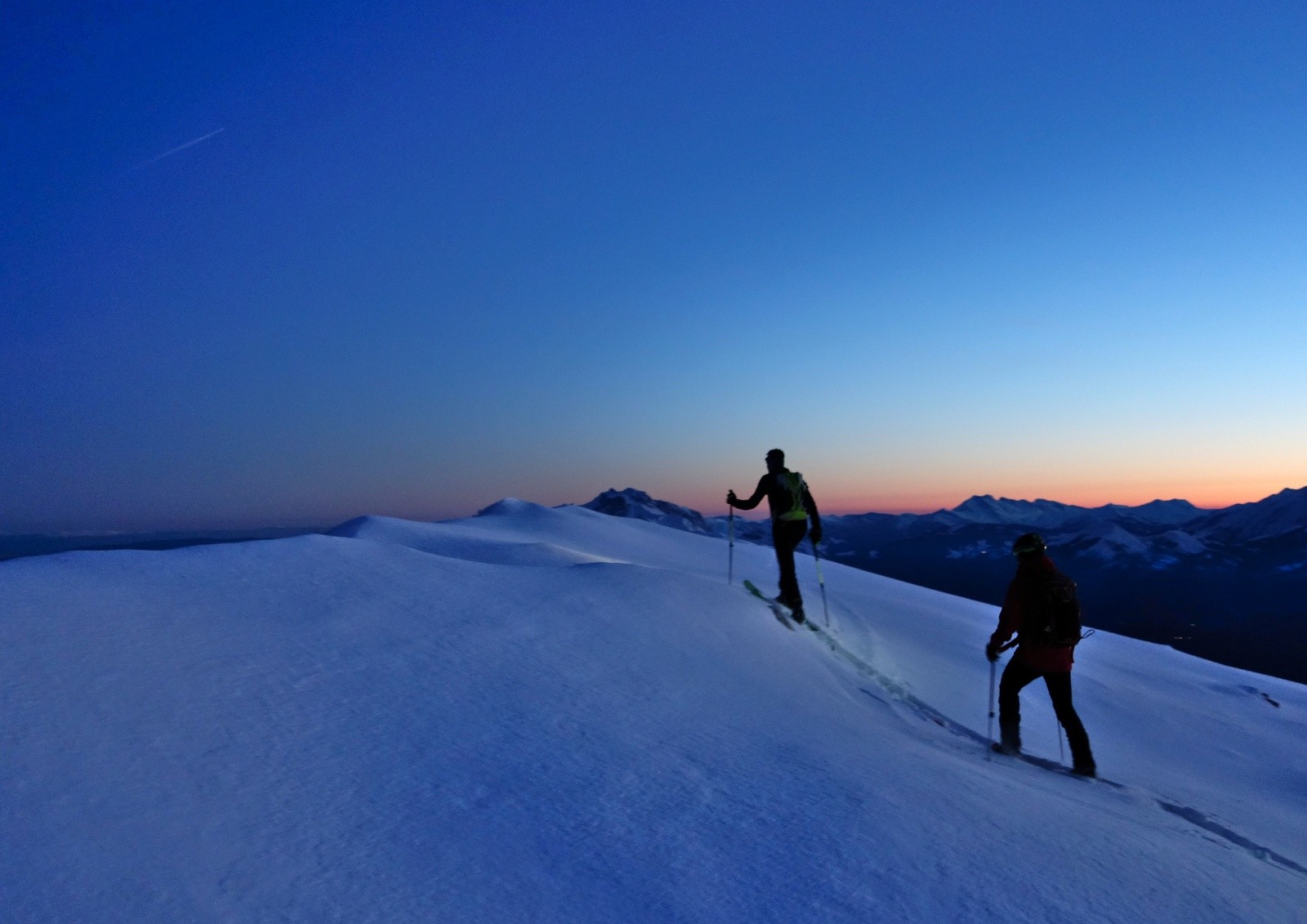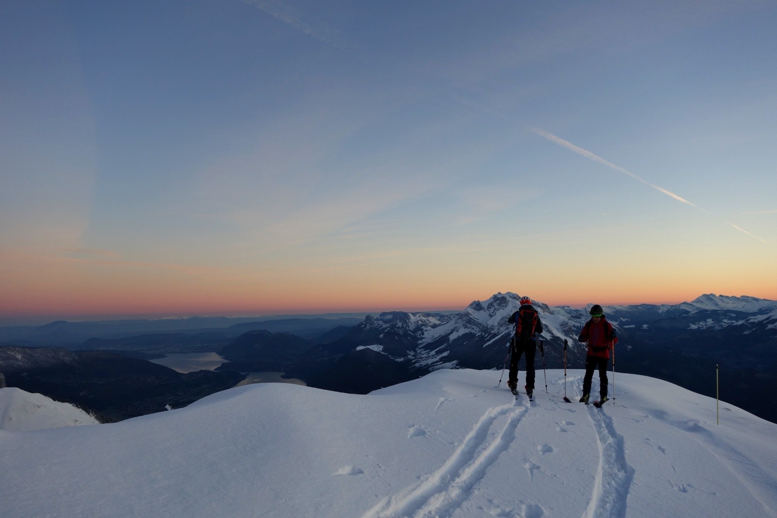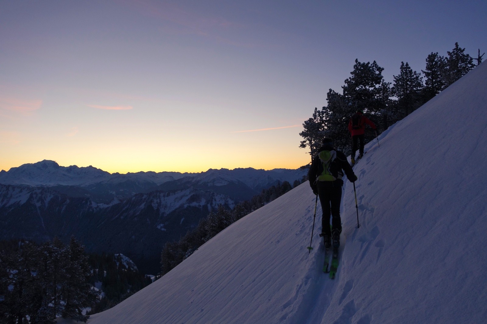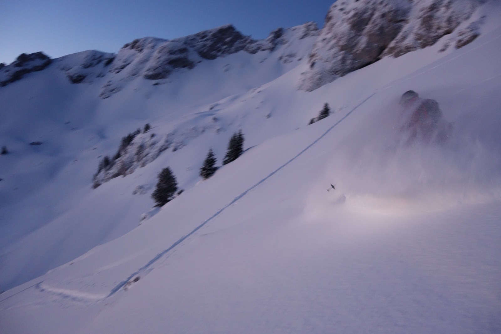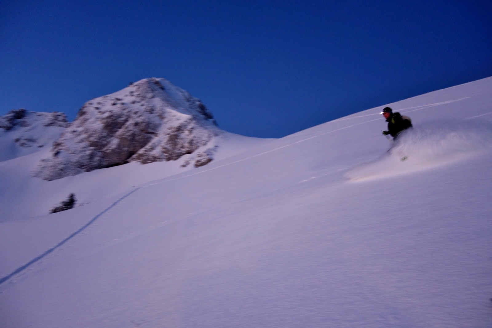 Une première descente par la voie normale de montée jusqu'au sommet du télésiège puis une deuxième par la combe rive droite au levé du soleil, parfait 😊.