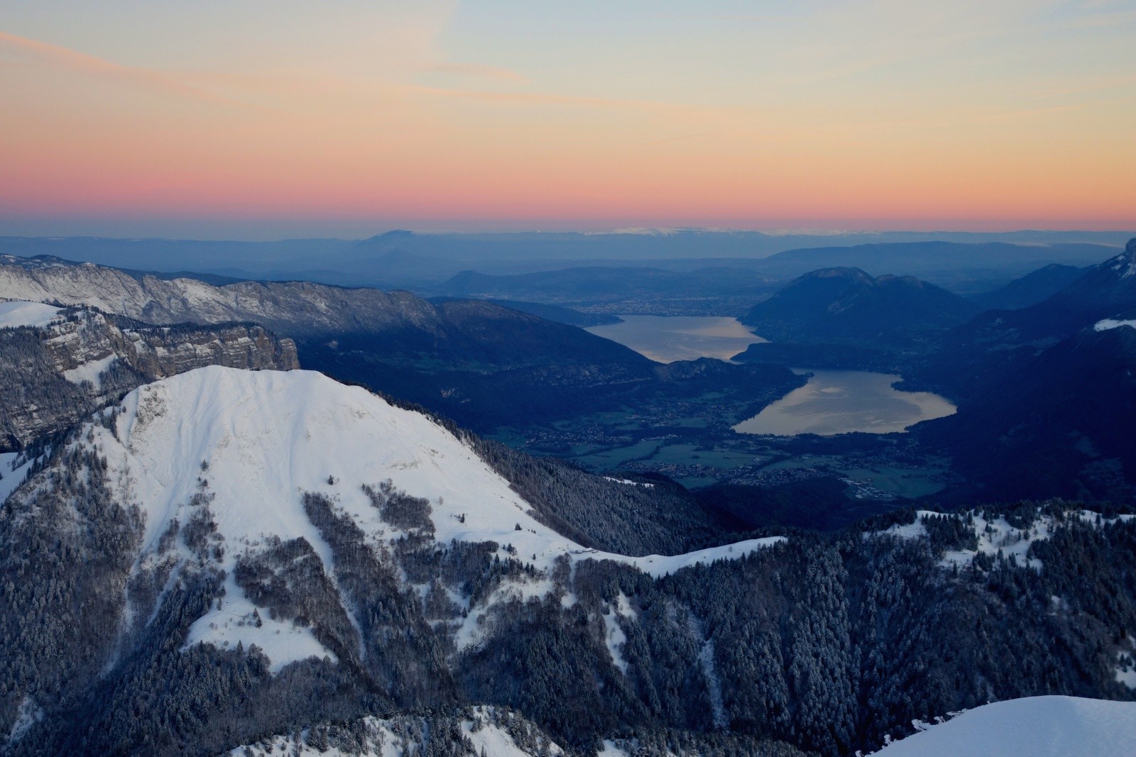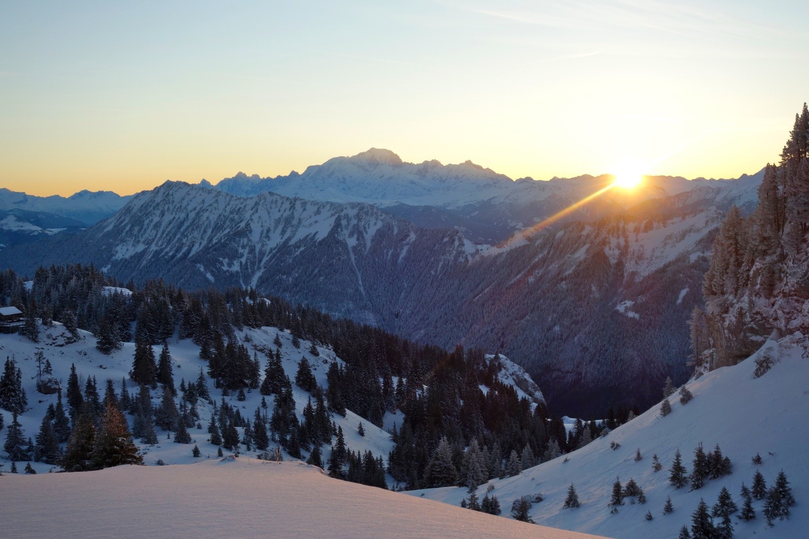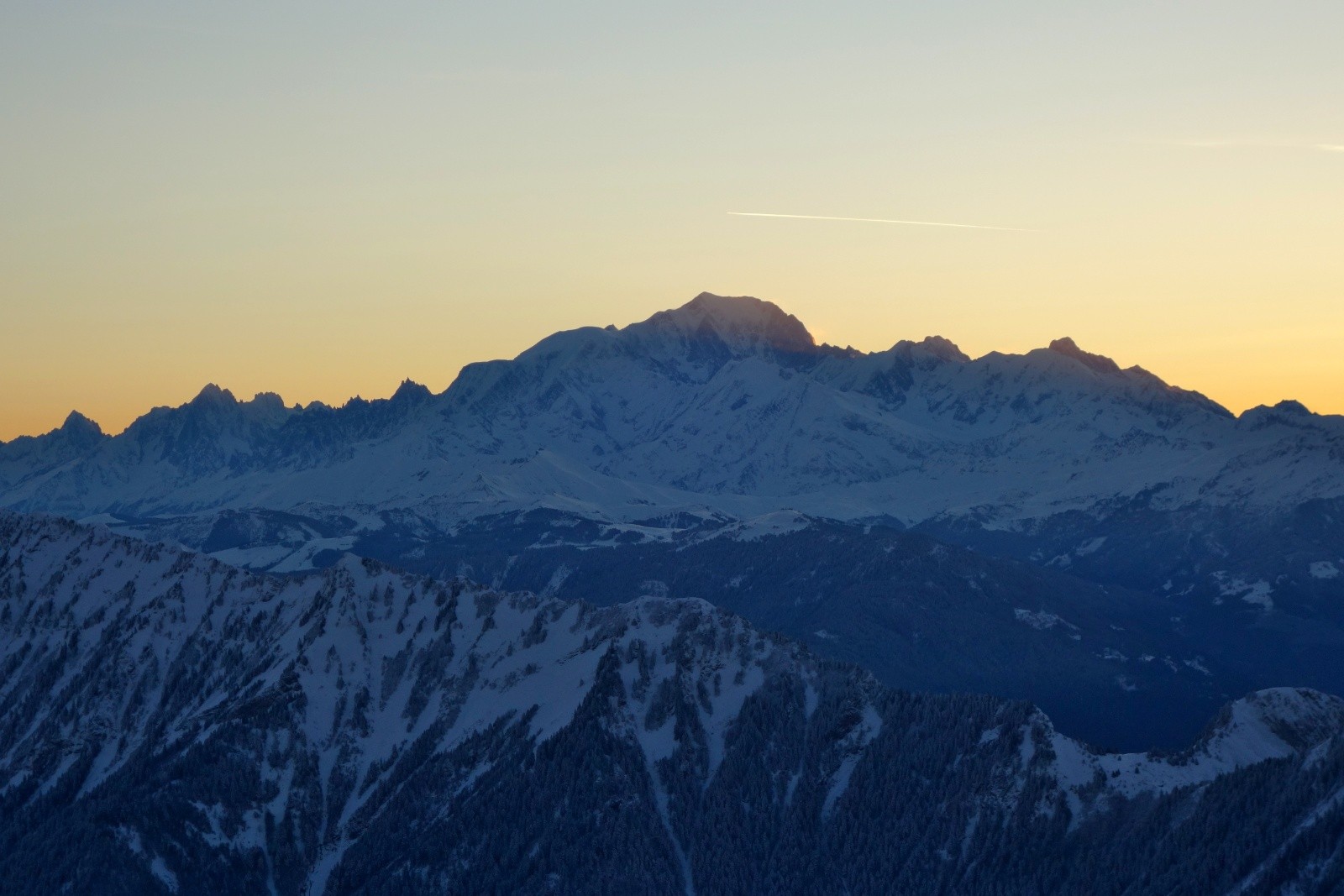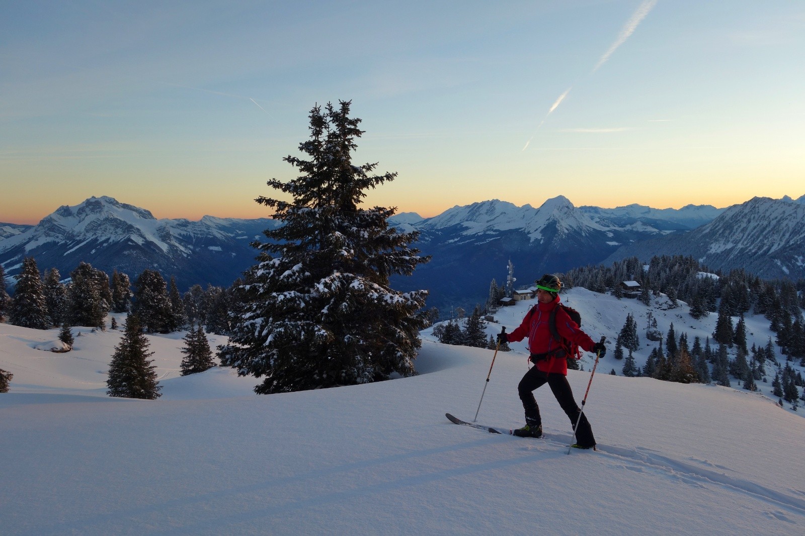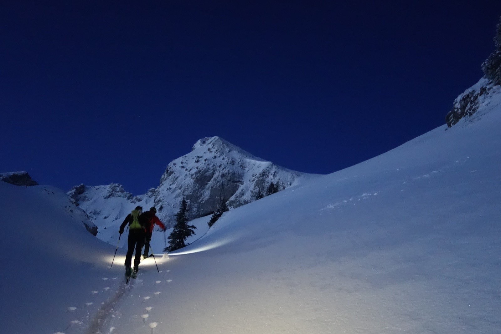Une première descente par la voie normale de montée jusqu'au sommet du télésiège puis une deuxième par la combe rive droite au levé du soleil, parfait 😊.