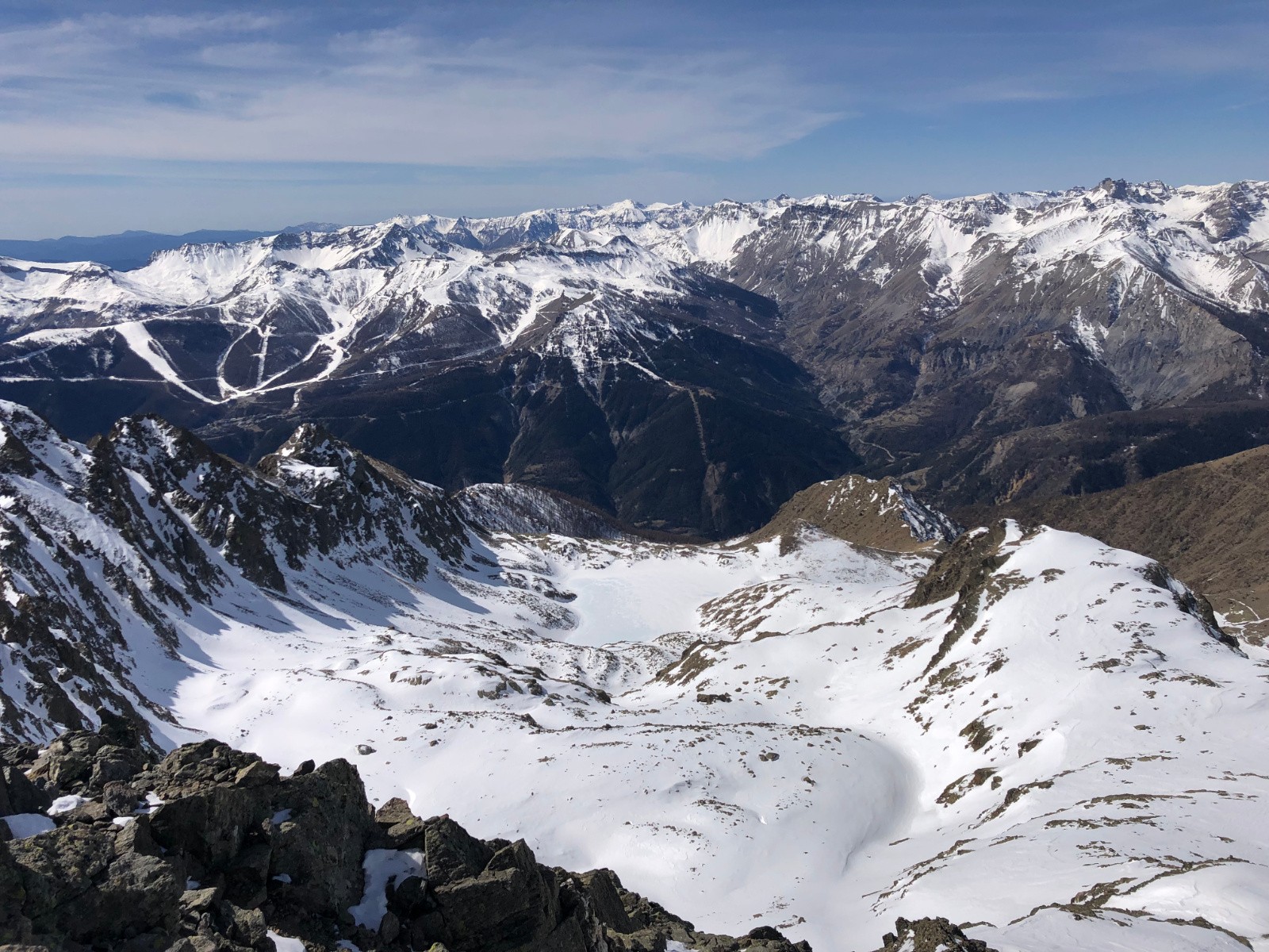 La descente sur Rabuons est pas mal malgré un manque certain de neige dans le Lusernier. Je dois jongler entre les rochers et sillonner dans les creux pour arriver au lac.