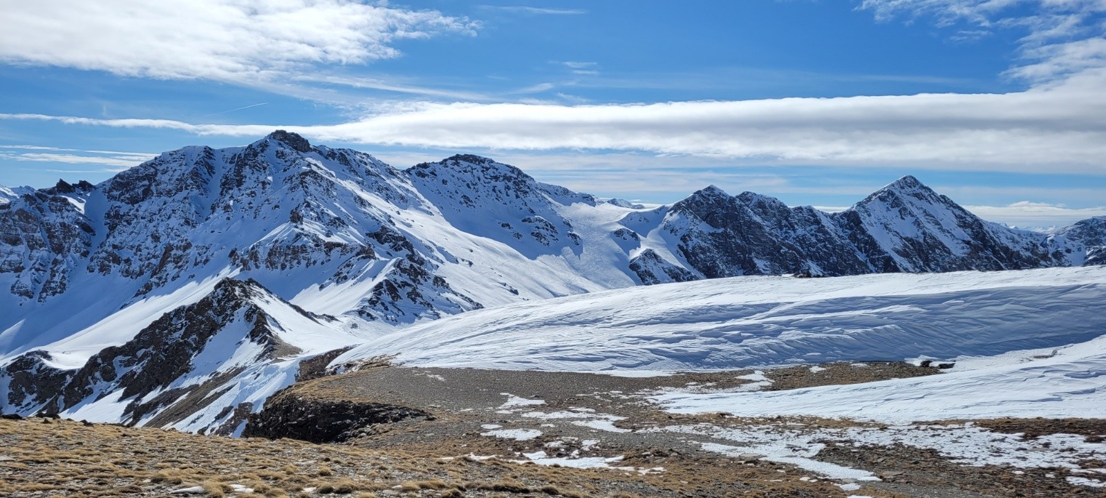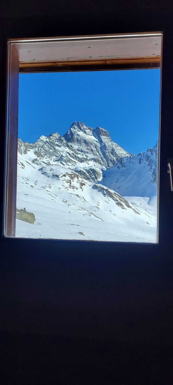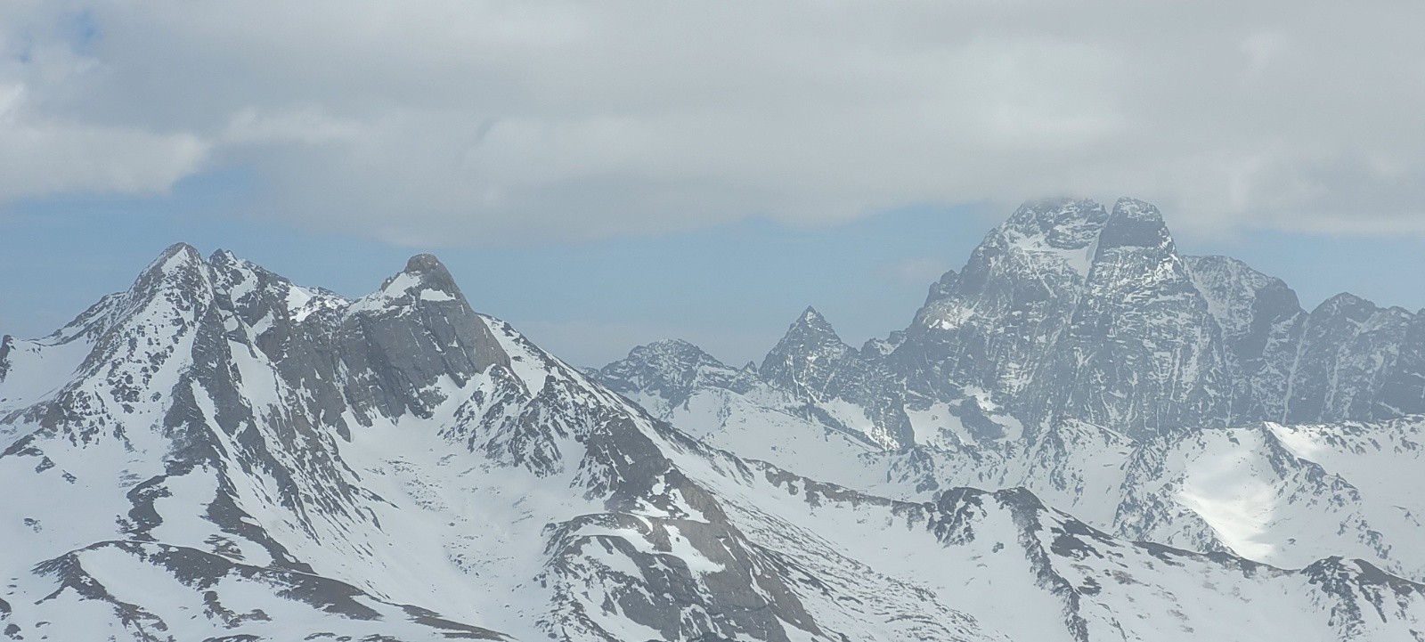 Encore une belle vue, le fond de l'air étant plus chaud que les autres jours, le vent n'est pas si dérangeant. S'ensuit la dernière belle descente jusqu'au Pont de Lariane, encore en neige fraîche en haut 4* s'humidifiant dans la descente.