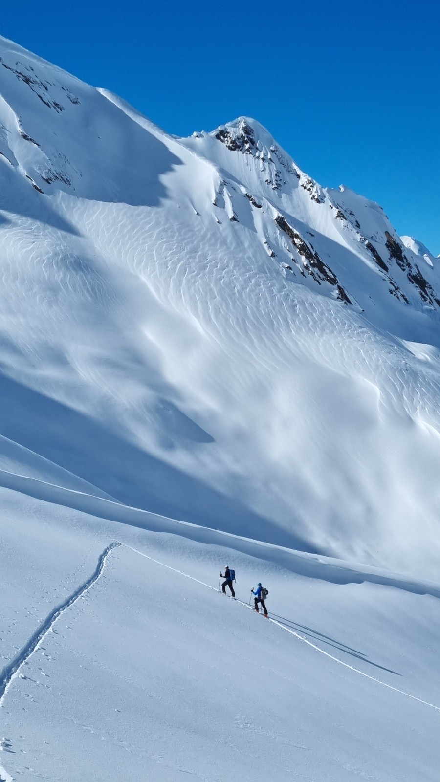 Conditions pour le ski :inespérées pour un début avril. le mauvais temps qui a sévit plusieurs jours avant notre arrivée a remis la montagne en mode hivernale, effacer toutes les anciennes traces. Au delà de 2500 m grosse poudreuse, en deçà neige croûtée devenant grâce au bon regel neige de printemps après 2 à 3 jours.