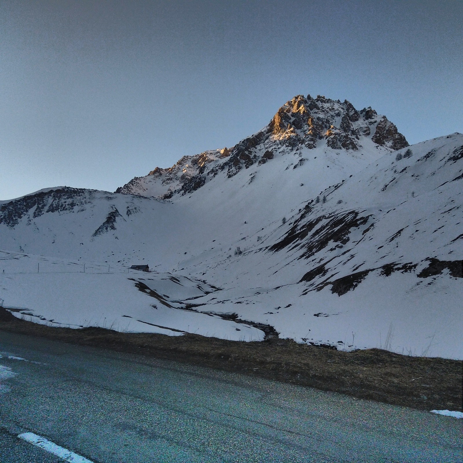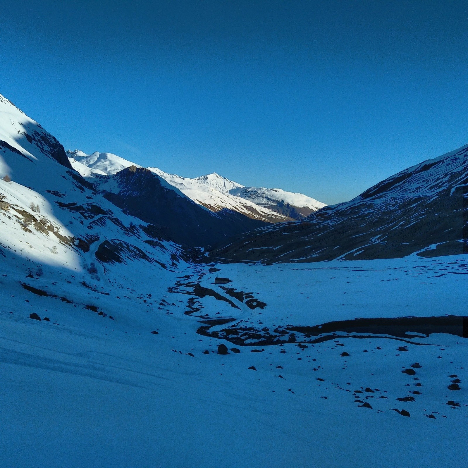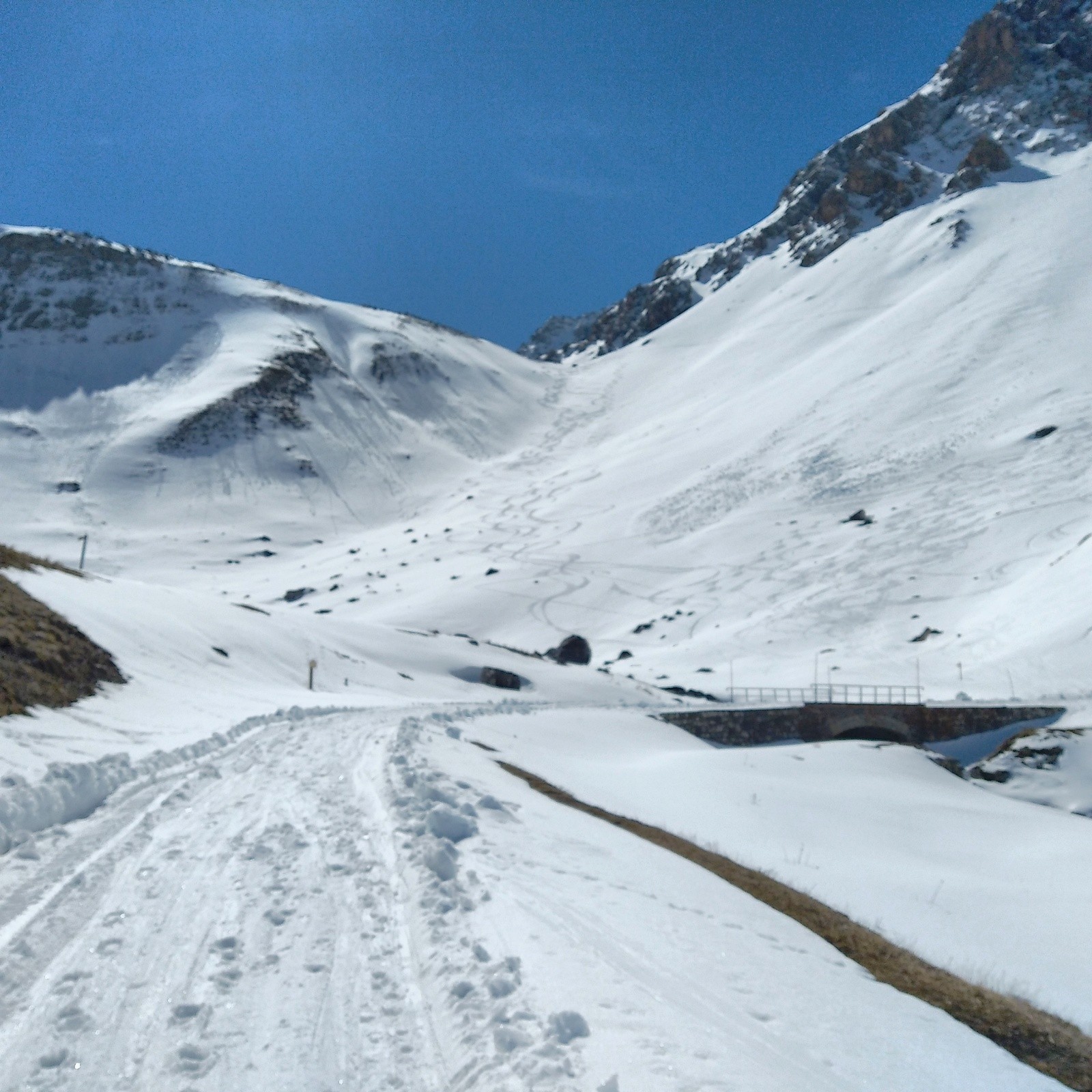 Au bout de qq centaines de m, la neige est froide et poudreuse..il n'y a que 3 traces de descente...encore de la place...au pied du couloir, la trace monte encore, puis je chausse les crampons, ça brasse pas mal, il y a de l'épaisseur...la sortie raide passe bien, pas mal de neige , c'est souvent neige dure et décapé en général..pas le temps d'aller au sommet du Galibier, une autre fois...j'ai un peu traîné entre la route a pied et le brassage du couloir...hop, skis aux pieds et descente...neige poudreuse sur fond dur, a pied on passe au travers..
