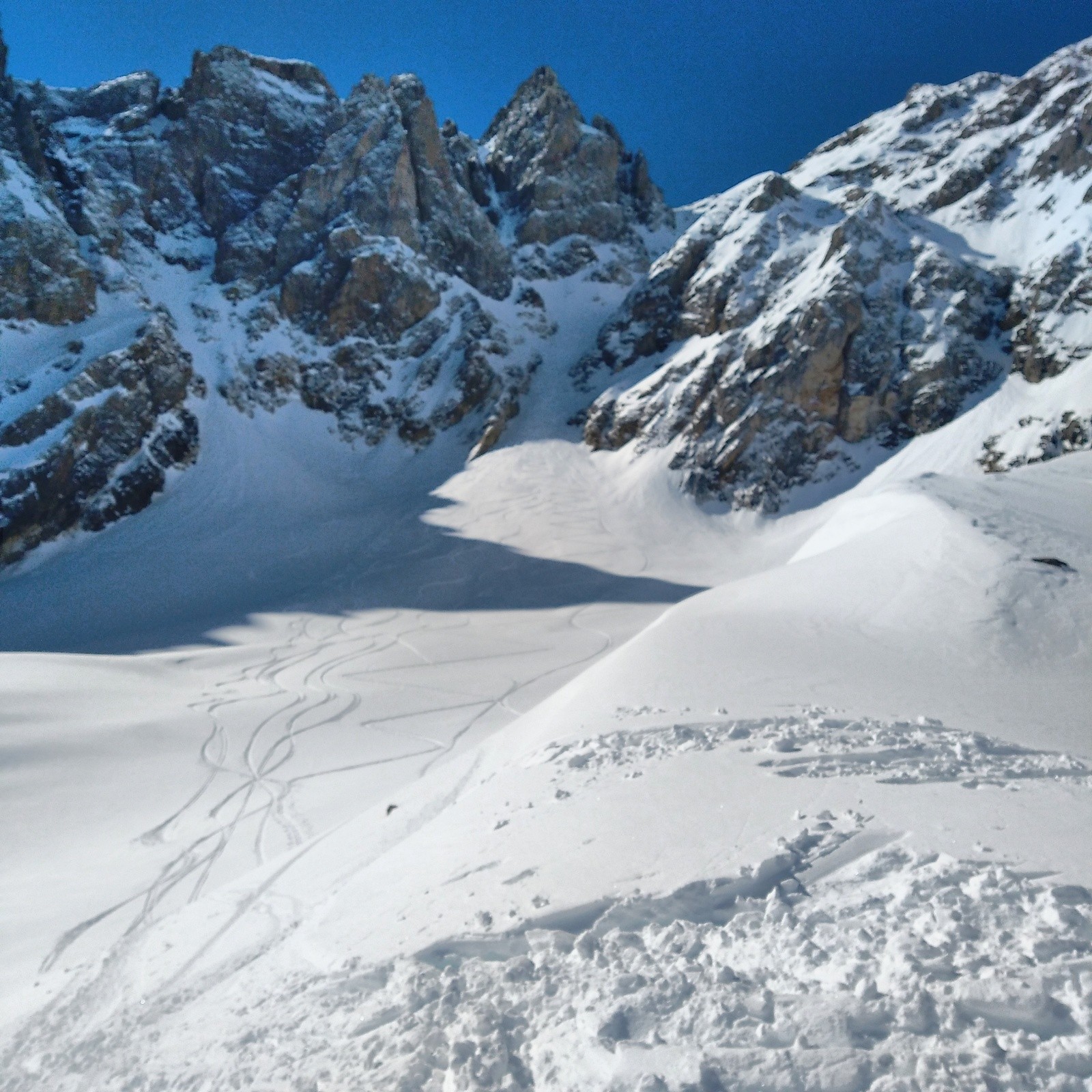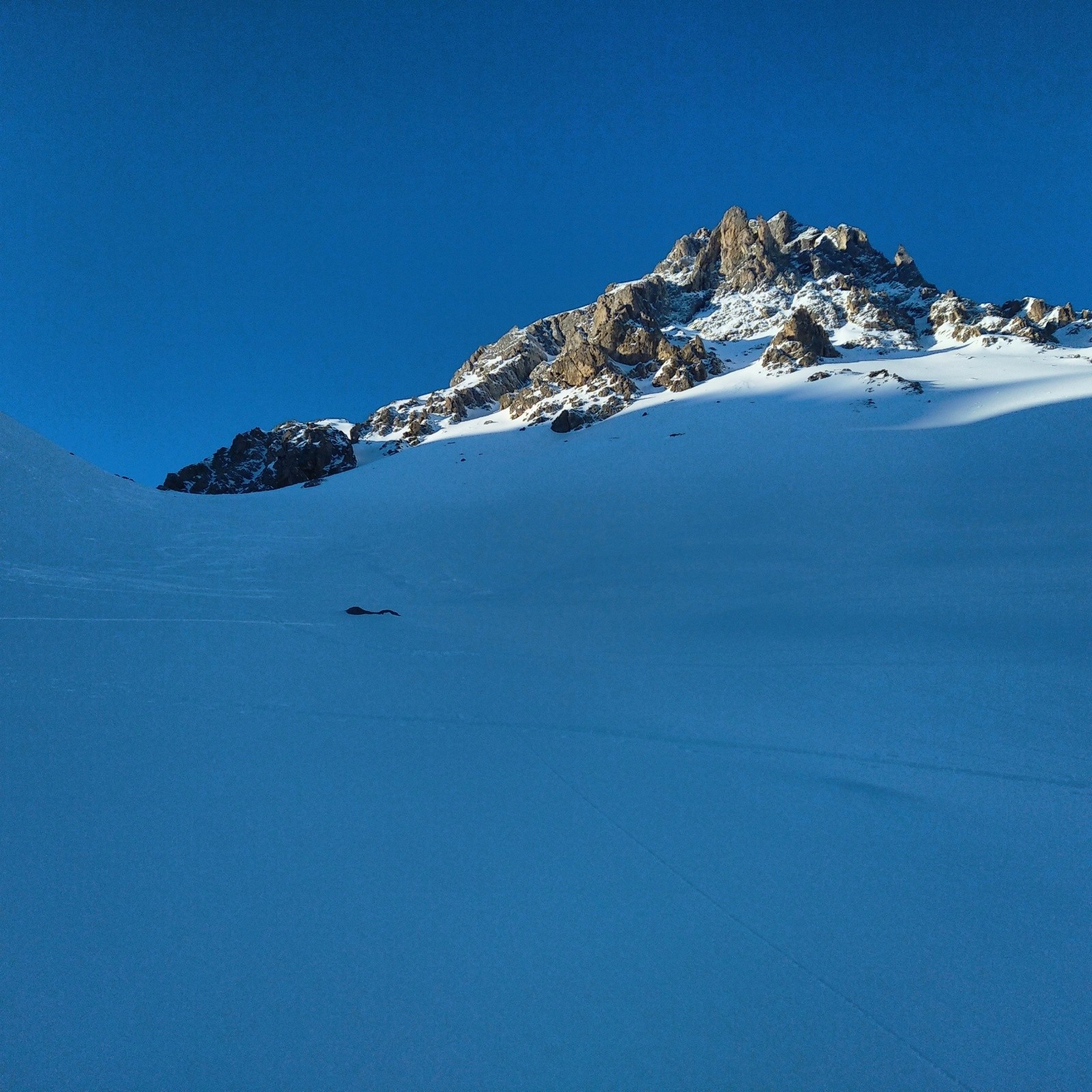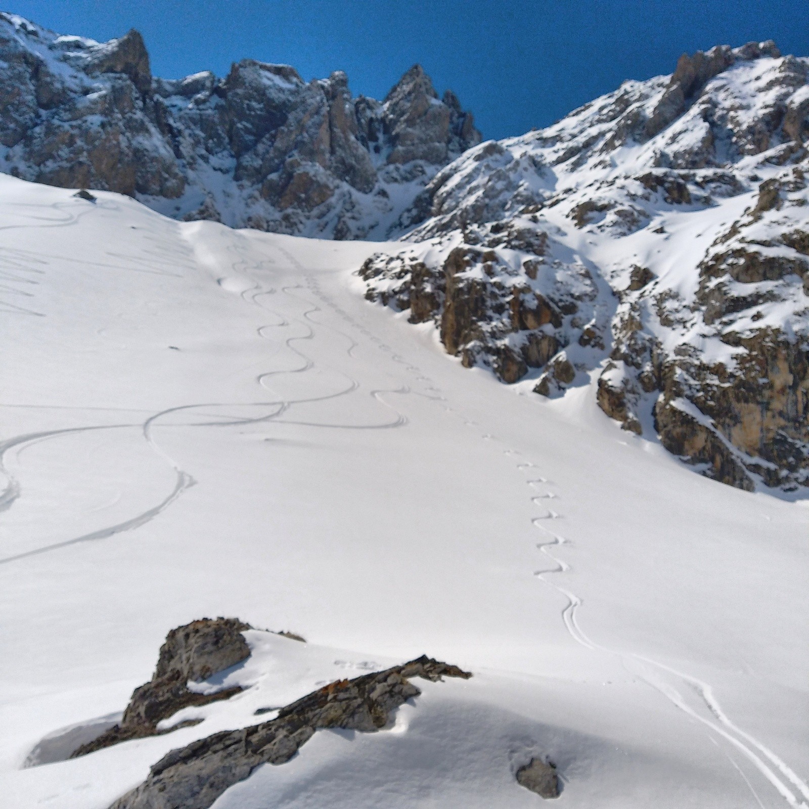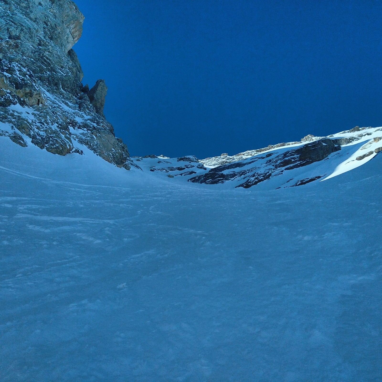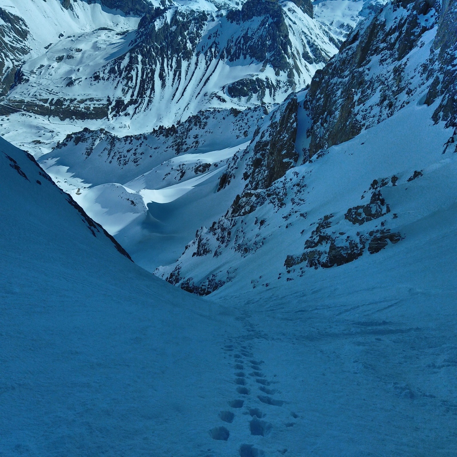 Le cône du bas du couloir est excellent, pas mal de place pour tracer... derrière, la pente de la moraine est aussi excellente...la pente de départ est bonne au début, puis neige moins facile mais ça tourné...retour en ski , puis a pied...une belle matinée de Pâques en montagne.