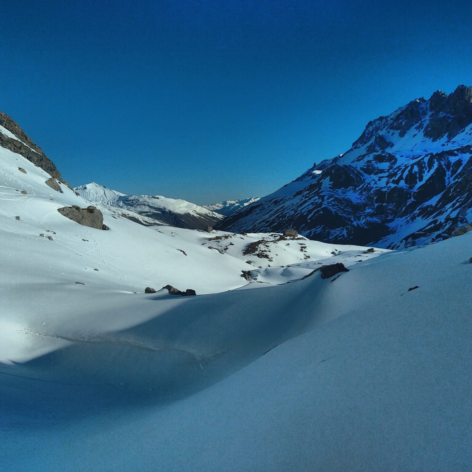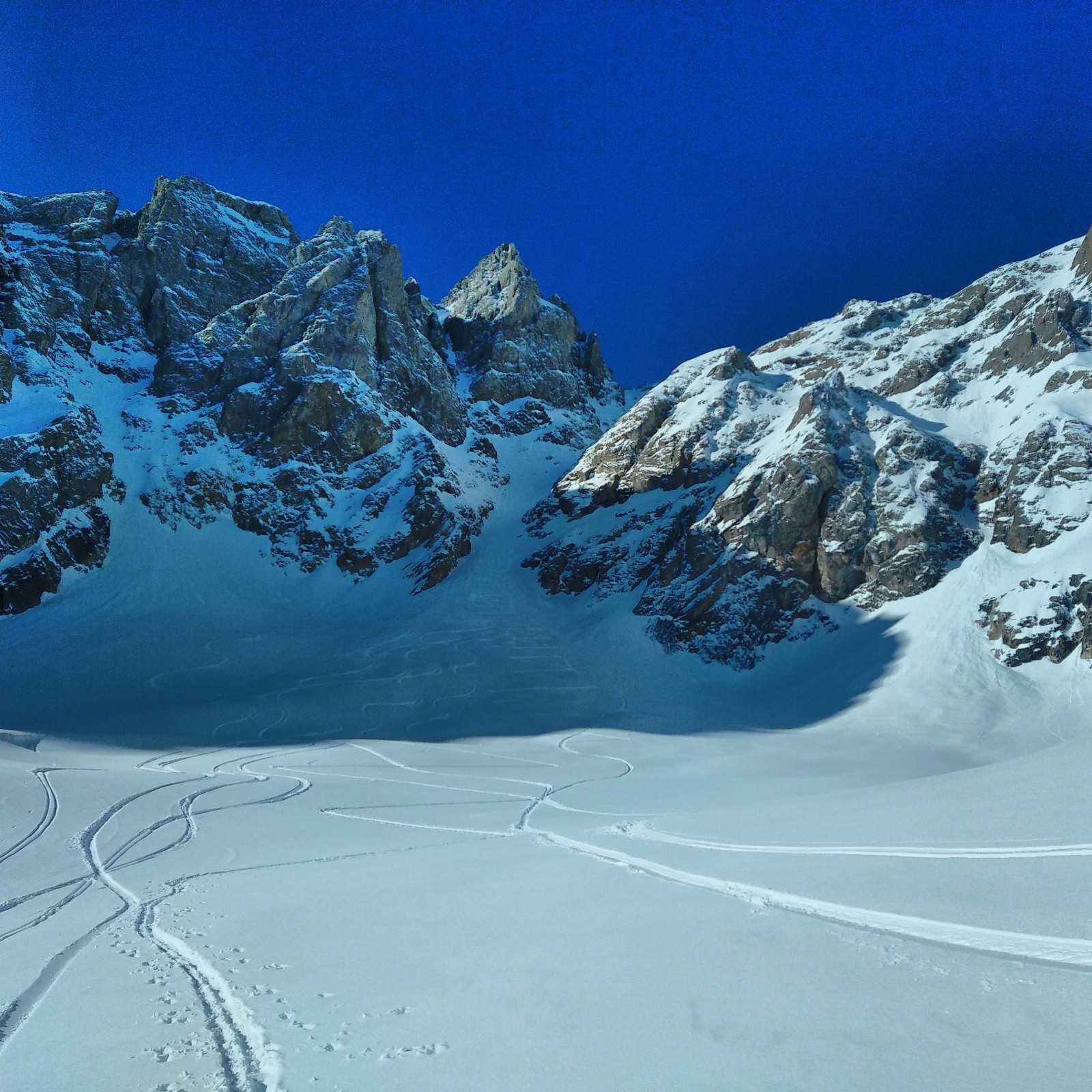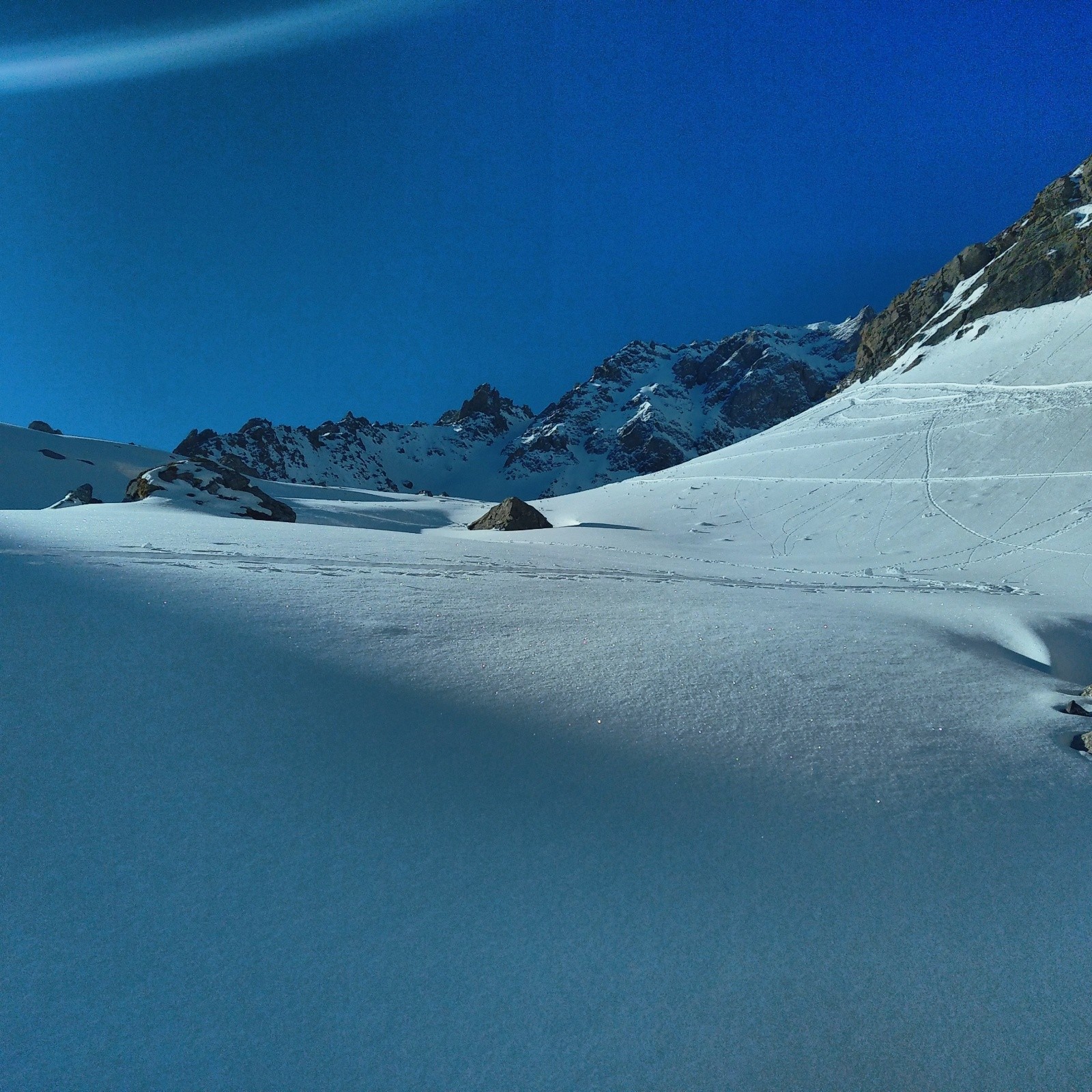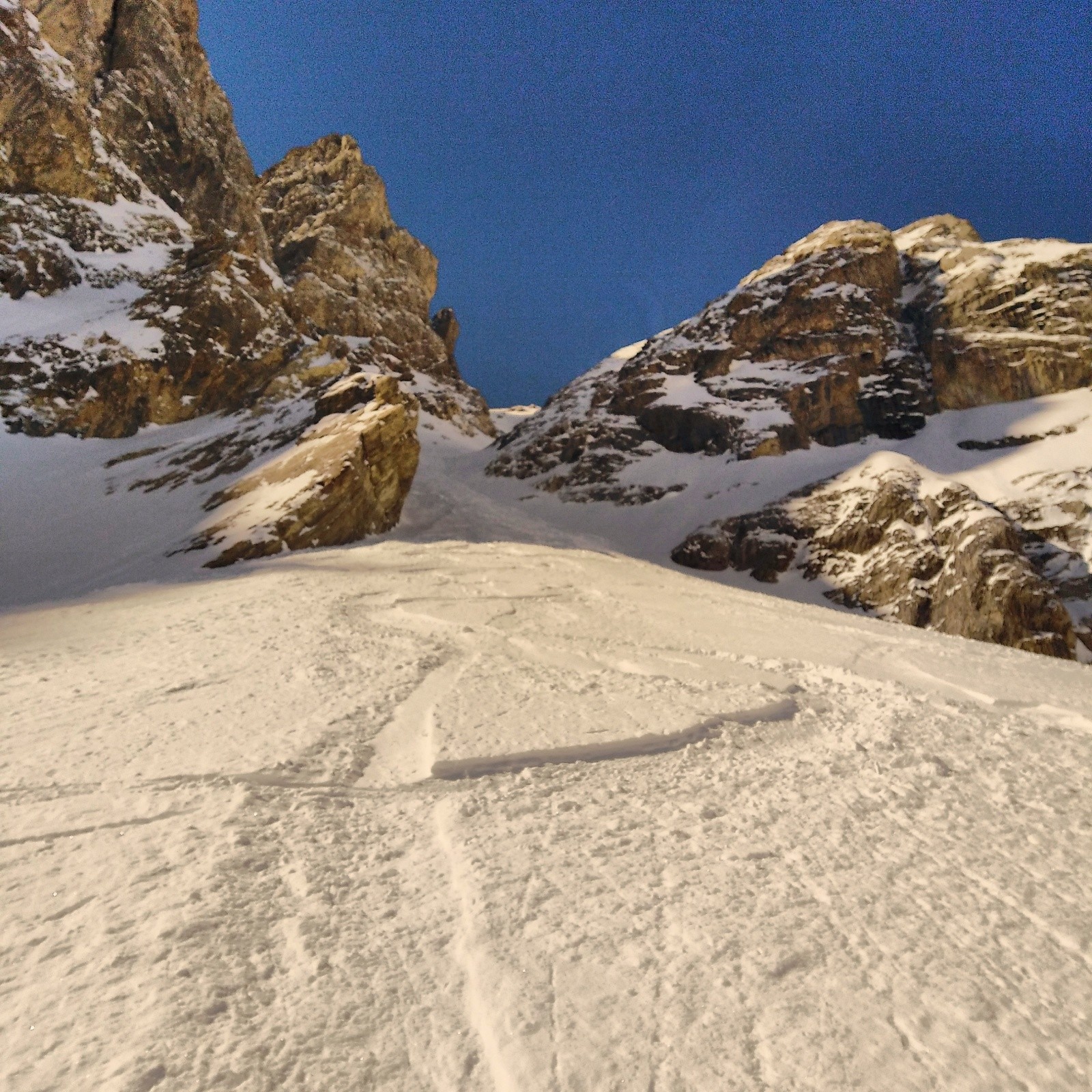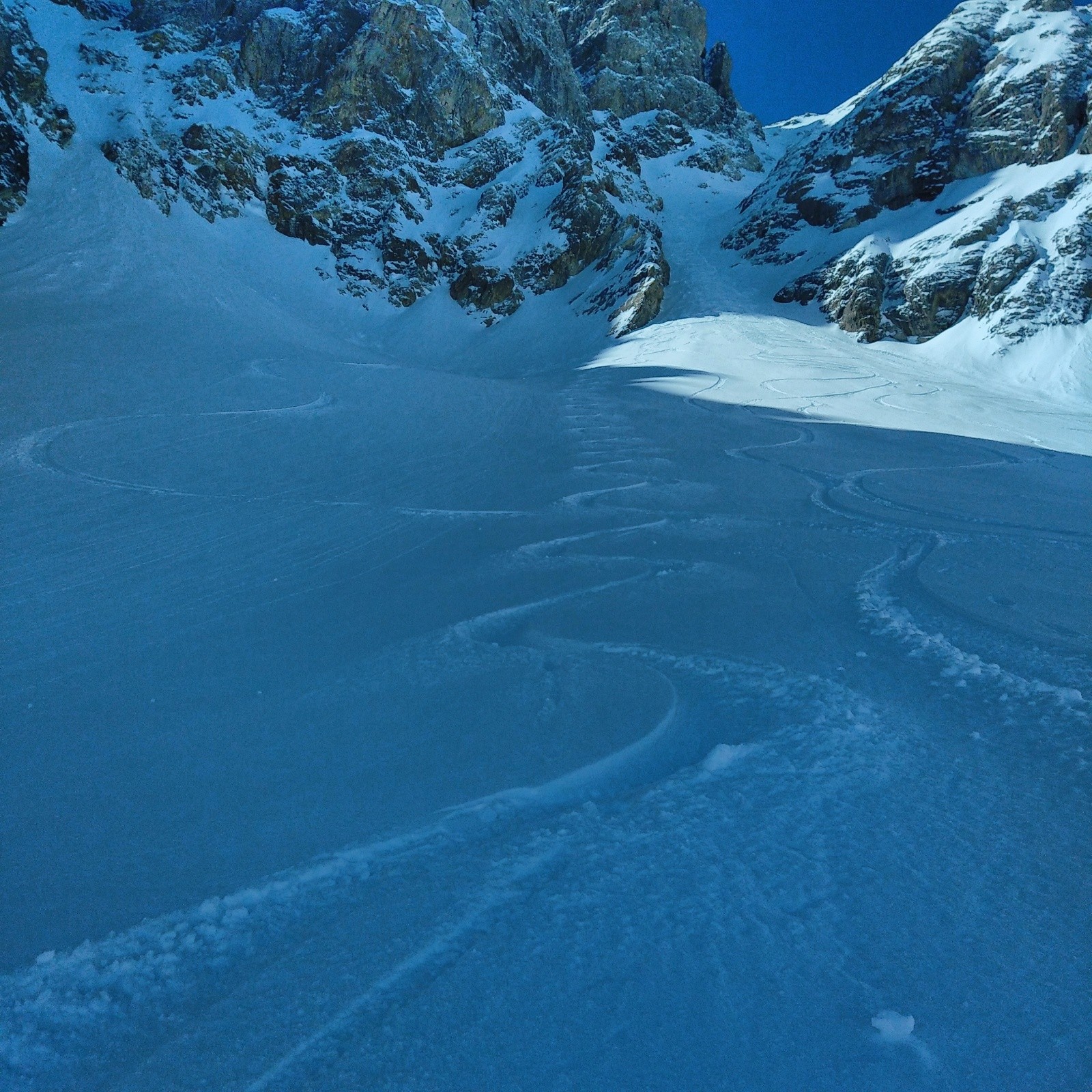 Le cône du bas du couloir est excellent, pas mal de place pour tracer... derrière, la pente de la moraine est aussi excellente...la pente de départ est bonne au début, puis neige moins facile mais ça tourné...retour en ski , puis a pied...une belle matinée de Pâques en montagne.