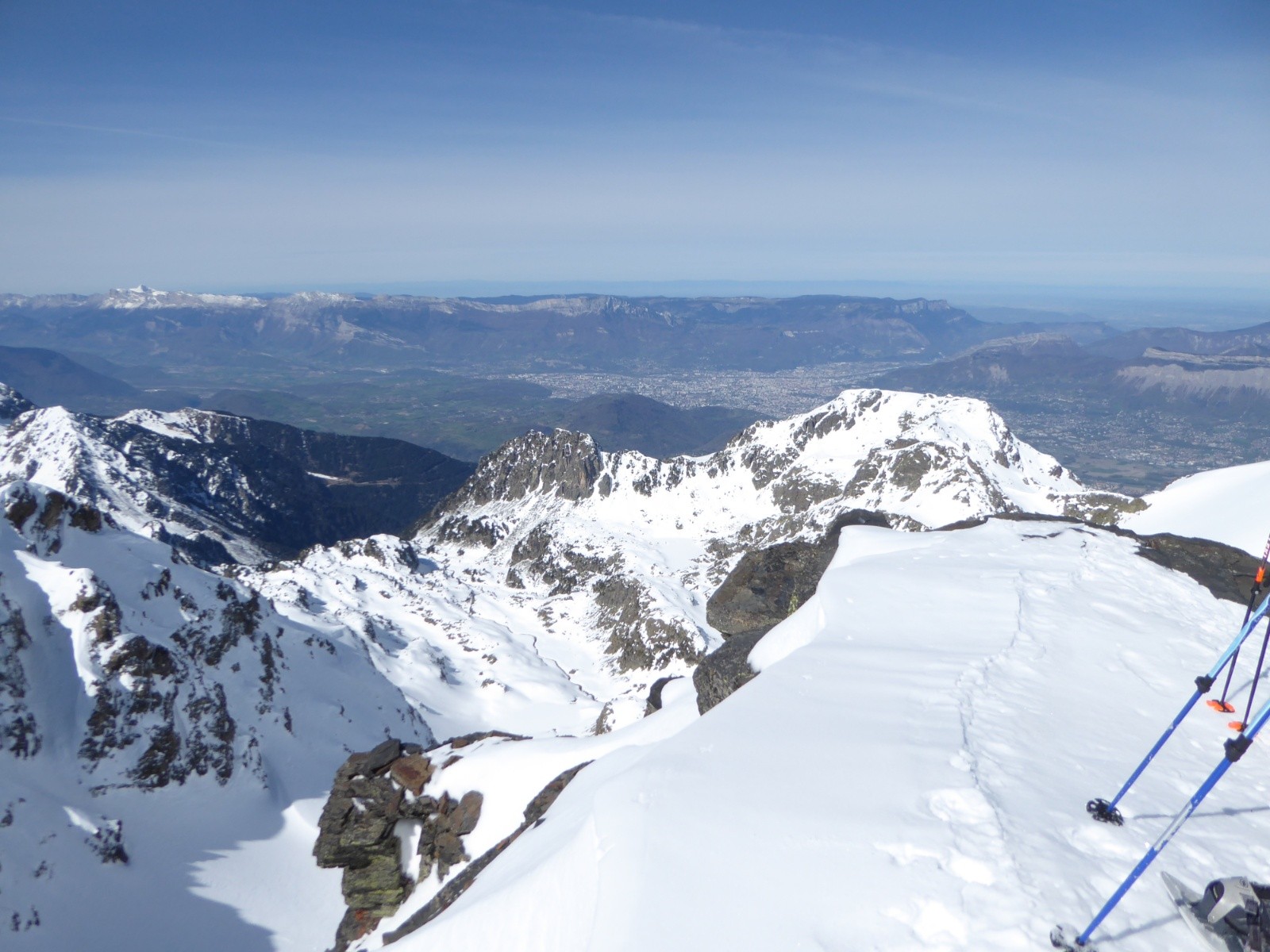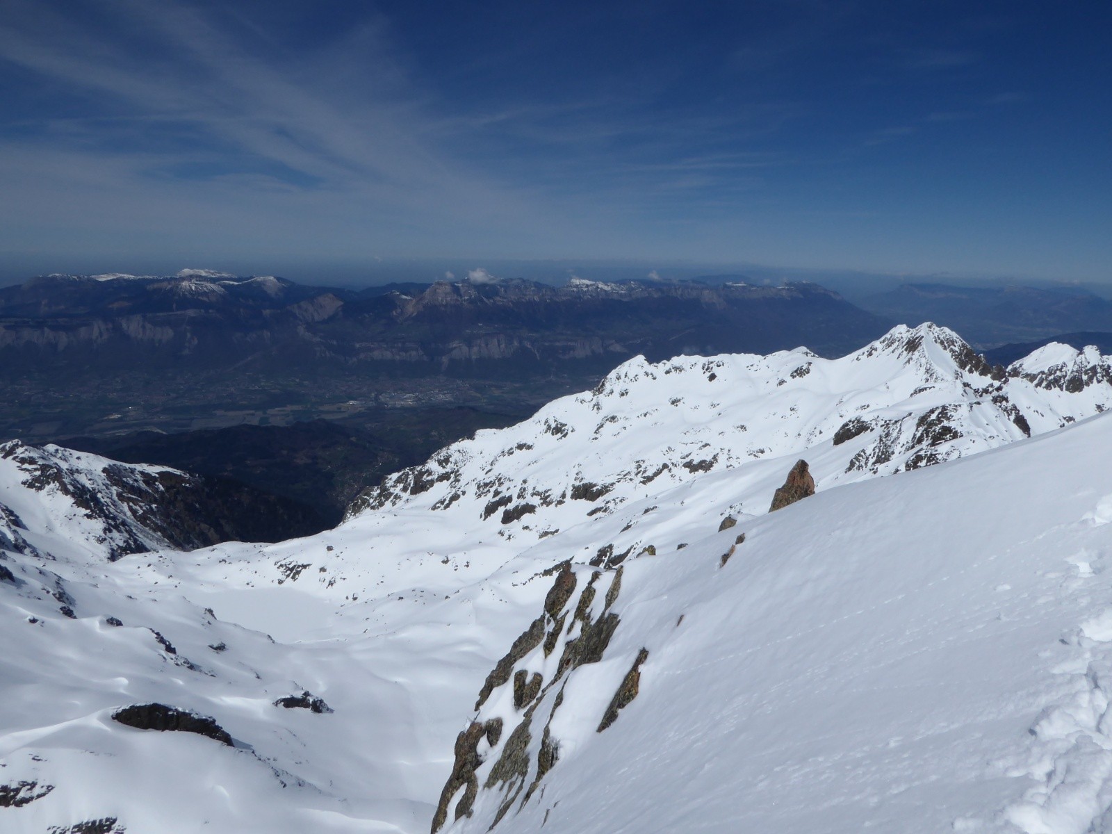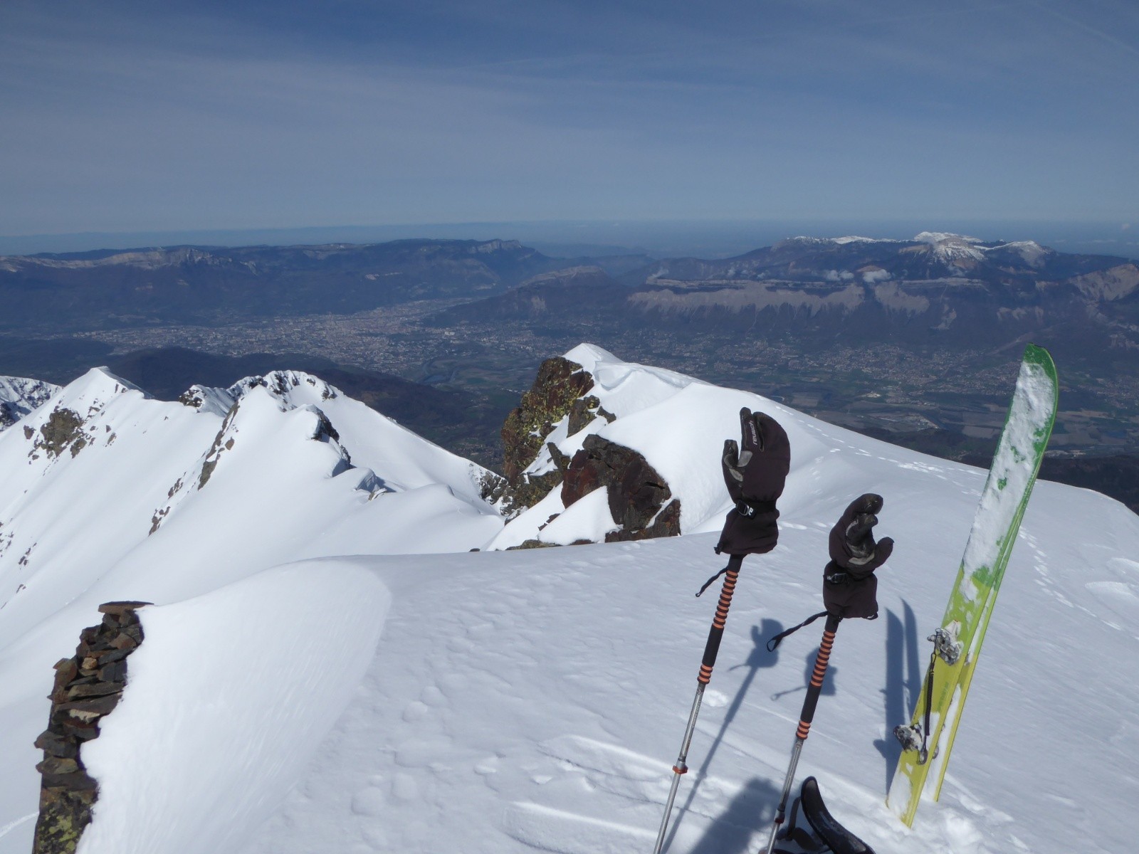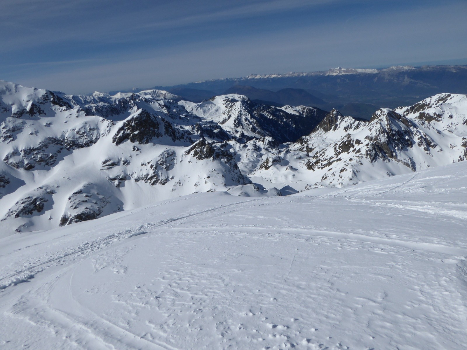 Aujourd'hui neige dur jusqu'à l'épaule, un peu de poudreuse proche du sommet de la Grande Lauzière, à peine décaillée sur l'arête sud et bonne moquette***** dans le vallon au col de La Vaudaineet et sur la traversée vers les Lacs Robert, piste Casserousse moquette****.