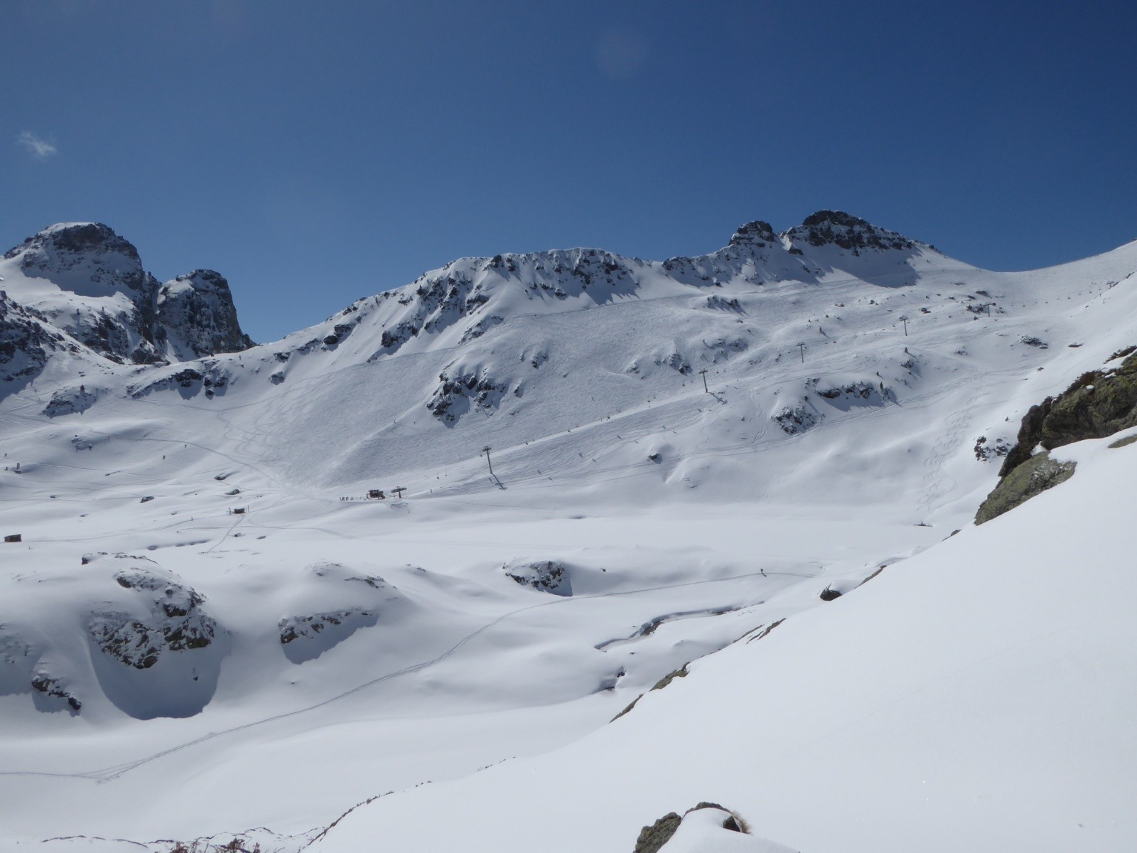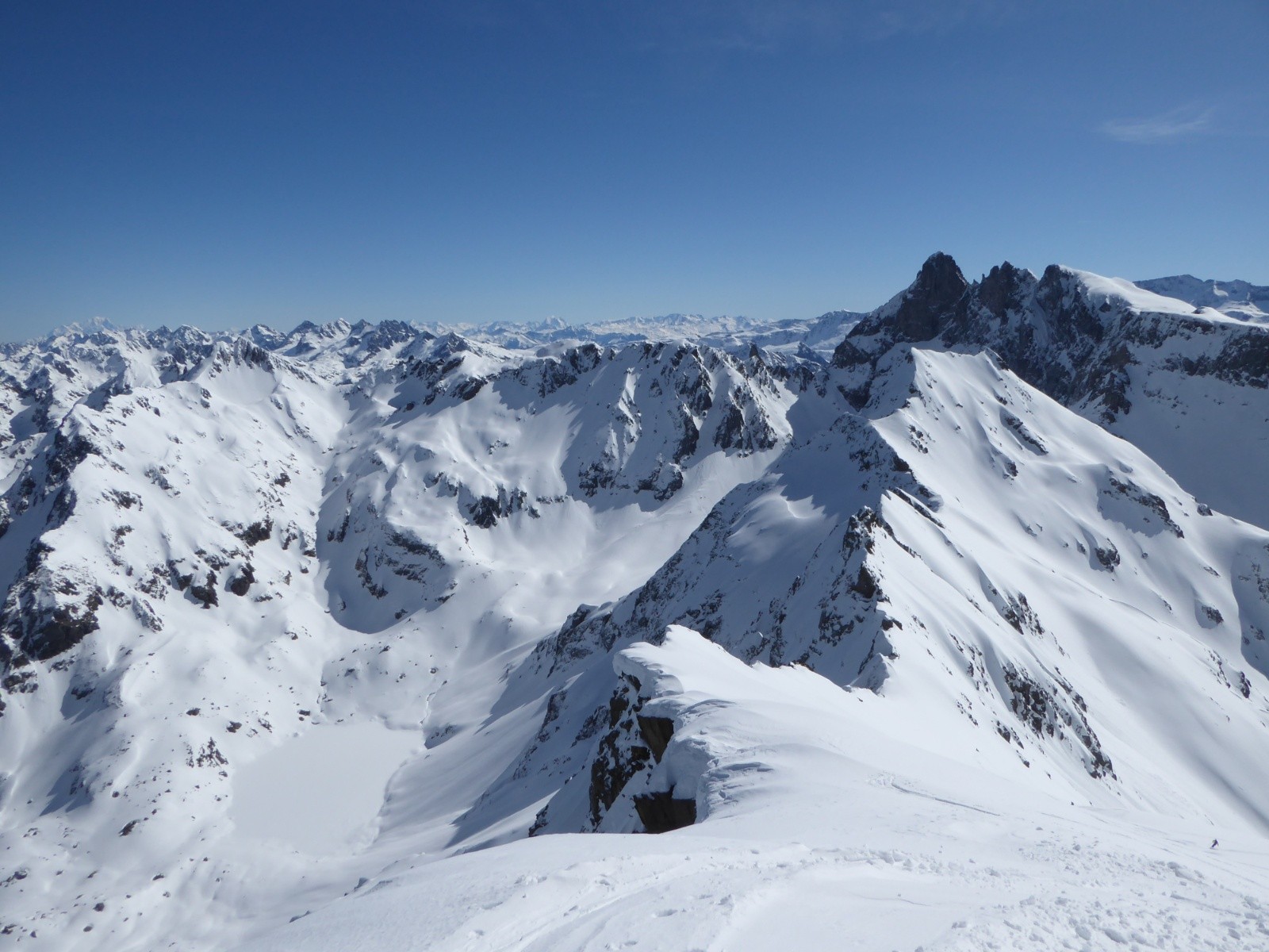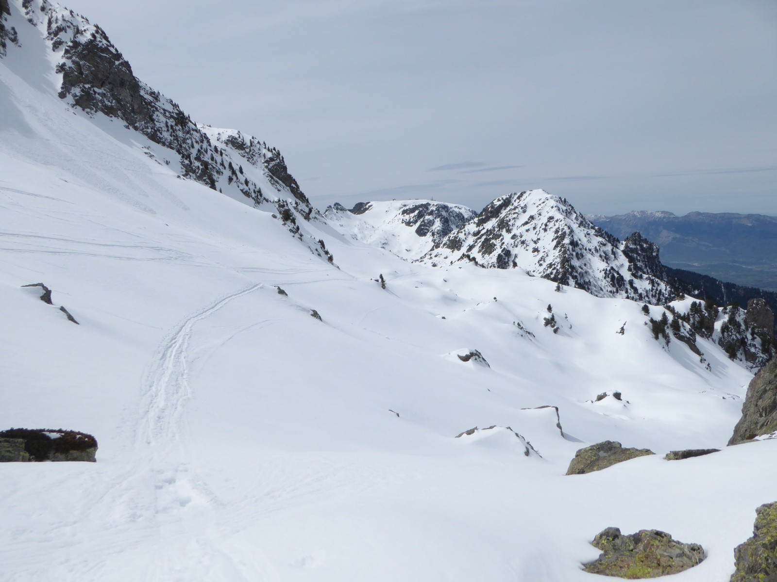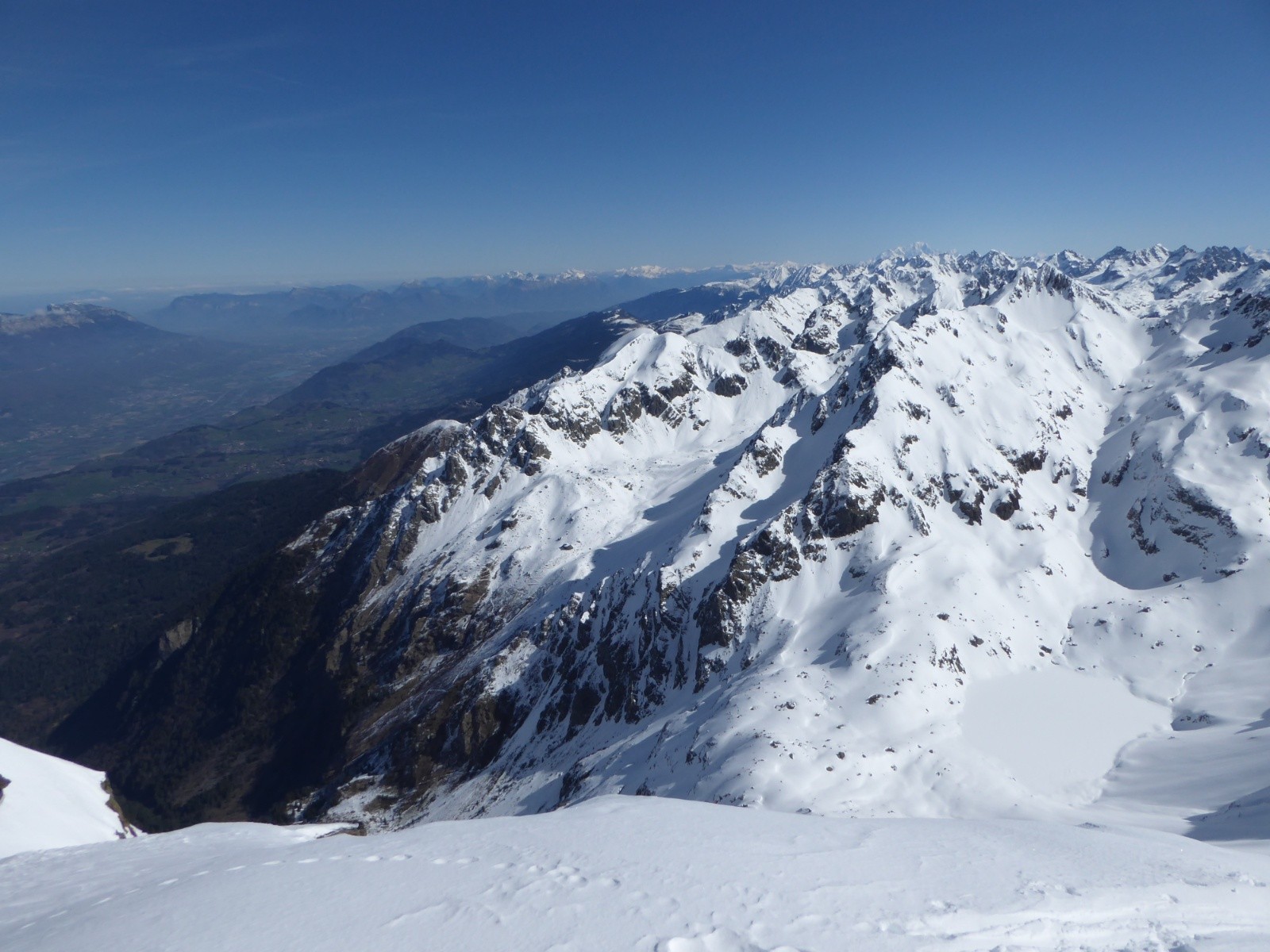 Belle journée montée depuis le refuge de la Pra par la face sud de La Grande Lance de Domène, descente par la face sud-est excellente poudreuse et moquette jusqu'au Lac du Grand Doméno, montée sur la Croix de Belledonne, descente excellente poudreuse jusqu'au Lac de Doménon et moquette***** jusqu'au refuge de la Pra,