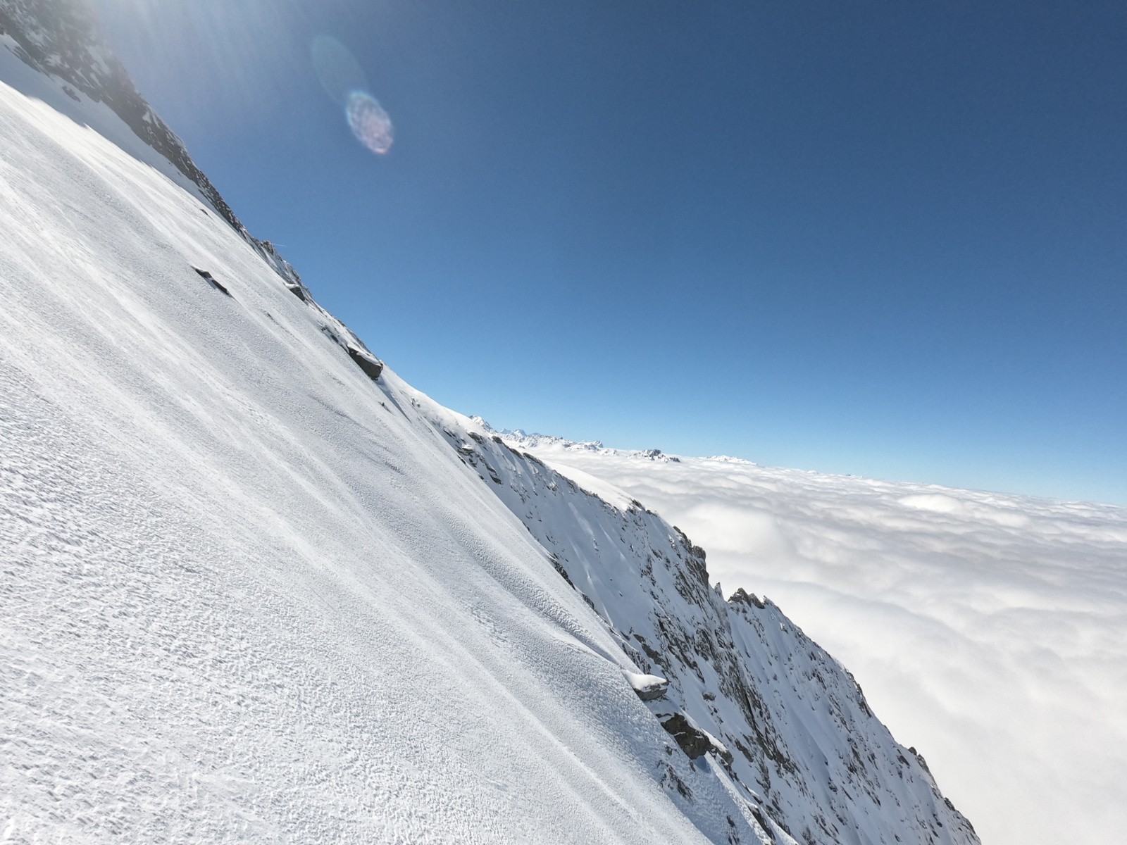 Activité avalancheuse : ras, plaquage sur le cône d'accès (sur 15 cm peu de propagation), grosses purges passées, très gros volume de neige mais stable pour ce que nous avons vu
