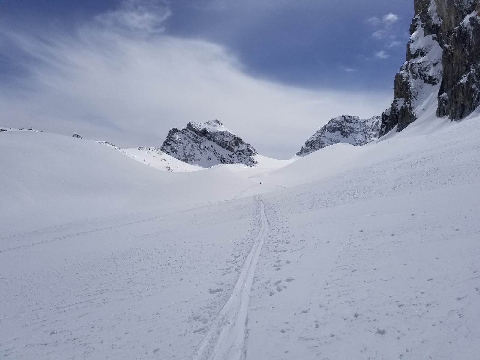 Au niveau du lac, on rattrape un couple. Puis alors qu'on discute de la suite avec Cyril, il me dit "Avalanche". Je me retourne et 1 puis 2 aérosols viennent s'écraser au pieds des barres de la Granta Parei. Plus impressionnant que dangereux, vu les quantités et le fait que la trace soit bien à gauche... Trace qui d'ailleurs me laisse penser qu'ils ne sont pas bien nombreux devant!