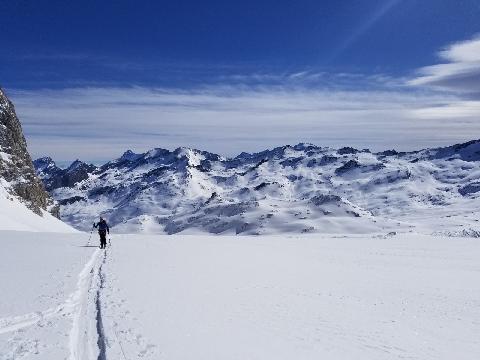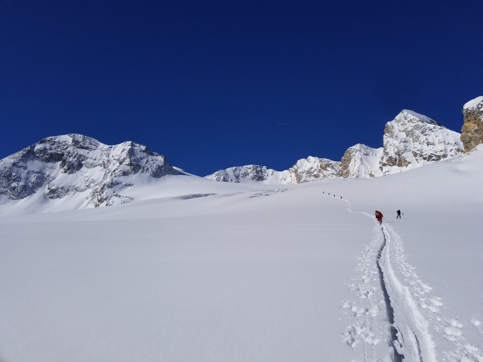 Effectivement, on rattrape un nouveau groupe, avant d'avoir les traceurs en visu, sur fond de Tsanteleina et de glacier d'un blanc immaculé! Magnifique... tout comme la descente qui s'annonce! 😎