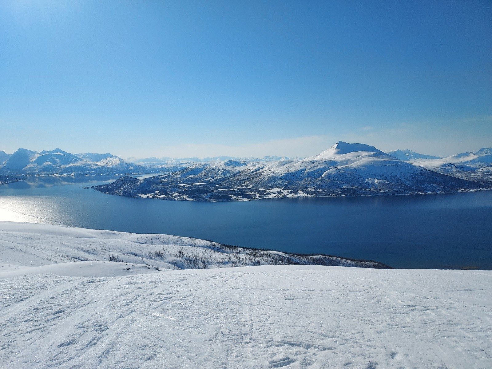 Coincé au bureau vendredi sans pouvoir rejoindre les copains en montagne, il était urgent de prendre ma revanche en sortant aujourd'hui, vu que c'est probablement le dernier jour de beau temps de cet hiver... On se rend donc plus au S sur le Balsfjord dans l'optique de profiter un maximum du soleil tout en ayant une neige plus souple que les carapaces glacées qui peuplent les secteurs N. Partis raisonnablement tôt, on est déjà précédés par des grappes conséquentes de Norvégiens. Après un passage de clôture, fait rare en Scandinavie, on entame la montée dans la trouée sur la croupe forestière qui monte gentiment vers l'E, mais permet déjà d'engranger un dénivelé et une distance conséquents. Une fois hors des arbres, on oblique au N pour traverser le plateau et aboutir au pied de la combe sommitale. En prenant pied sur l'épaule E, le panorama dévoile les Alpes de Lyngen S, notamment les dures parois des Lakselvtindane, et la longue calotte du Jiehkkevárri qui s'allonge vers le N. Juste avant le sommet, le replat peut décourager mais n'est pas si long, d'ailleurs on voit rapidement le cairn. C'est une journée assez peuplée sur Blåtinden, il doit y avoir pas loin d'une centaine de skieurs sur la montagne, dont certains ont entamé la montée bien après 14h... Mais la neige est raisonnablement stable, et tout ce qu'ils risquent est de revenir dans la soupe. Pour notre part, on choisit l'option par la droite et on s'en félicite : la neige de printemps a la bonne consistance et n'est pas trop tracée. Verser dans la combe au dernier moment permet de profiter d'une partie un peu plus raide et tout aussi agréable. Retraverser le plateau vers le S se fait presque sans avoir besoin de pousser, et la fin de la descente ressemble à une piste damée par les nombreux passages.
