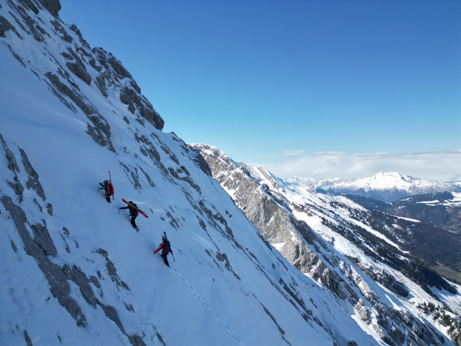 Montée très jolie, c'est esthétique, aérien et très agréable. Pas de grosses difficultés, c'est limite plus simple que le NW car aucune manip de corde, c'est appréciable. Globalement pas raide et bien large, qq courtes sections raides avec de la neige proche des dalles rocheuses.