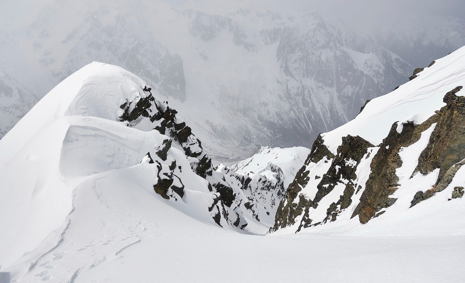 Pas envie de m’éterniser au sommet sous les bourraques aussi violentes qu’incessantes, mais quelle ambiance, loin du monde, depuis ce véritable nid d’aigle… À la limite du plafond nuageux, les sommets alentours sont étincelants de blanc immaculé. Encore un instant singulier qui restera gravé dans ma mémoire…