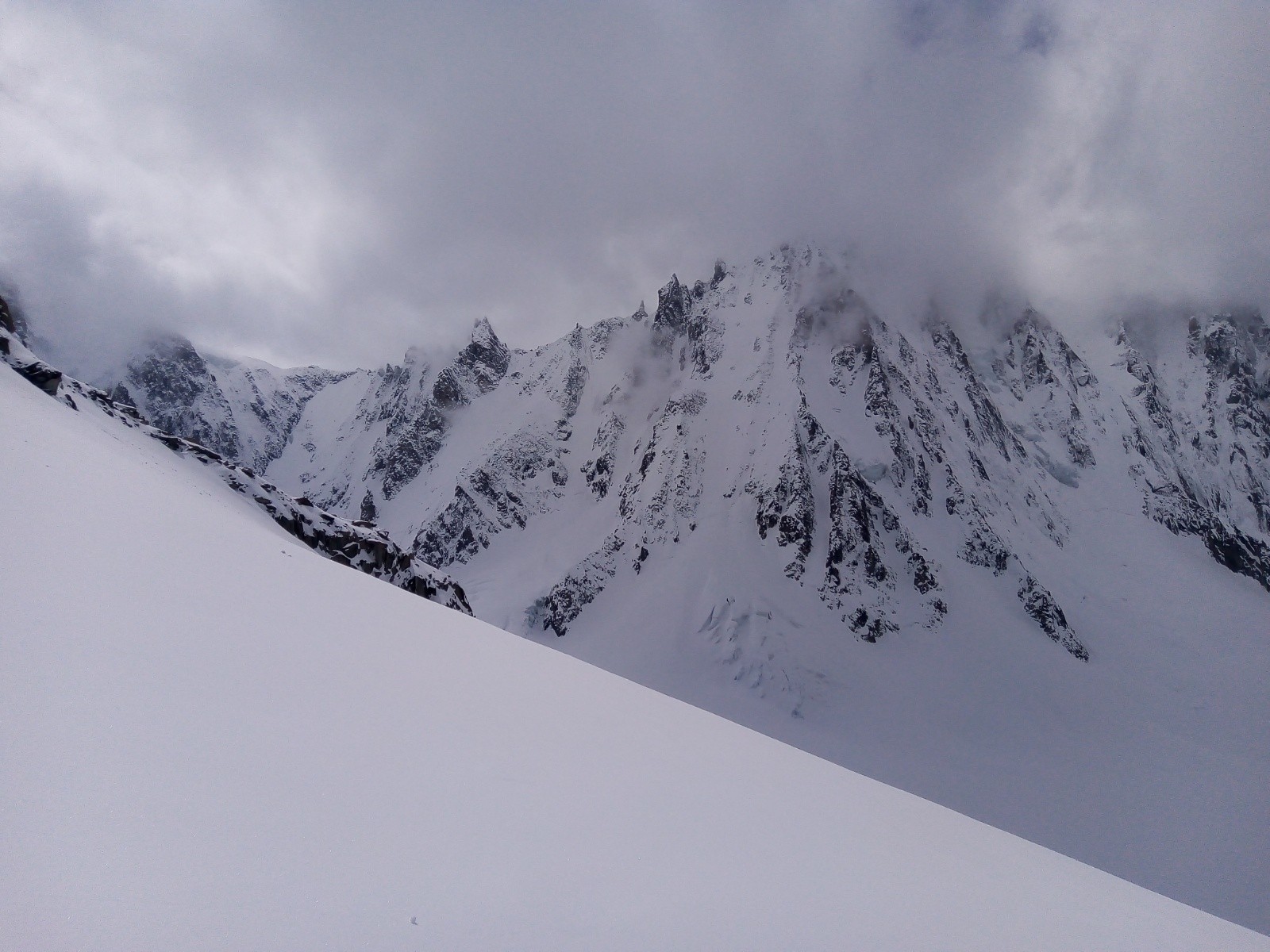 On suivra la trace sur le glacier du Tour Noir, celle-ci ne va pas au col d'argentiere mais à un autre col rive gauche vers 3300m (reliant le glacier du Tour Noir à celui des Rouges du Dolent). On stoppera ici aussi, fatigués par la chaleur, le bottage, et ça serait bête de descendre dans la perturbation arrivant vers 13-14h. Belle descente dans de la poudre sur le haut puis on retrouve une neige plus lourde sur le glacier. Heureusement elle ne colle pas trop donc le retour sur Lognan n'est pas si pénible.