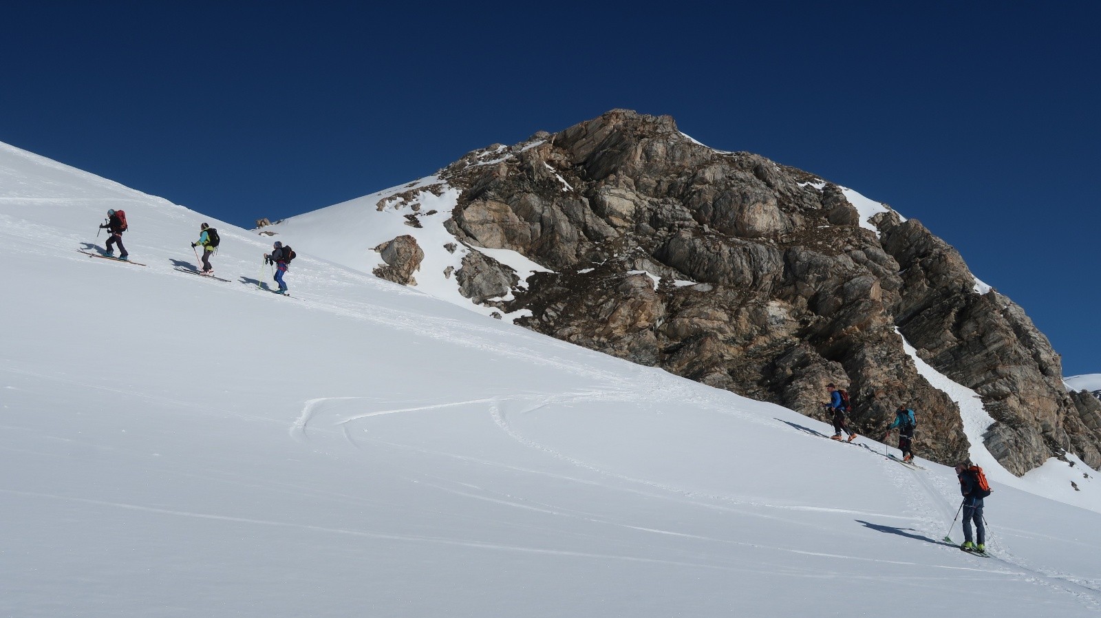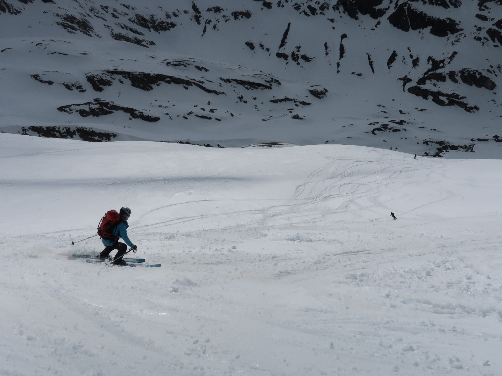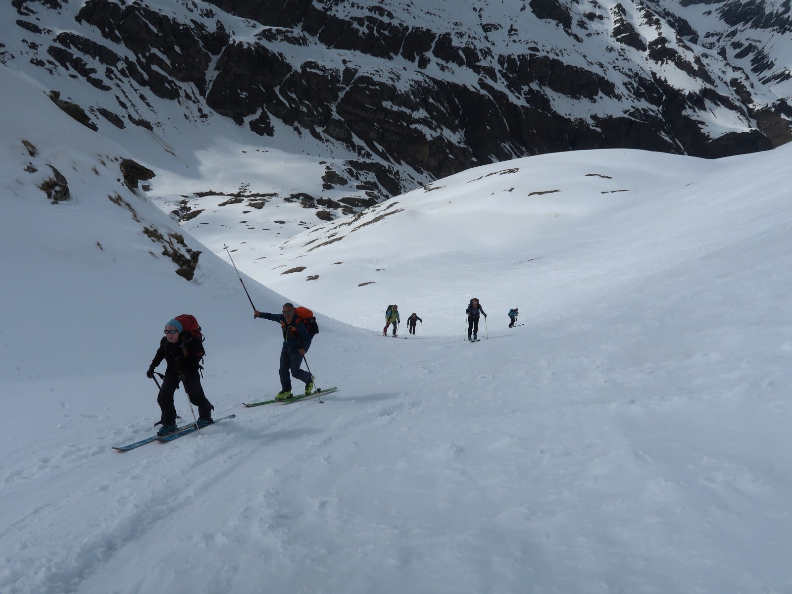 Aujourd'hui sera notre dernier jour dans ce Val di Rhêmes enchanteur. Nous nous décidons pour un retour sur les pentes de la veille: direction La Punta Baséi. Sur certains passages proche du 30°, nous prenons nos précautions, l'approche de la crête présentant des plaques de neige soufflée. Le groupe atteint le Col Baséi sans trop de peine, nous sommes désormais bien acclimaté à l'altitude et en bonnes jambes. Nous bénéficions encore de bonnes conditions pour une descente ponctuée d'un enchainement de virages bien arrondis.
