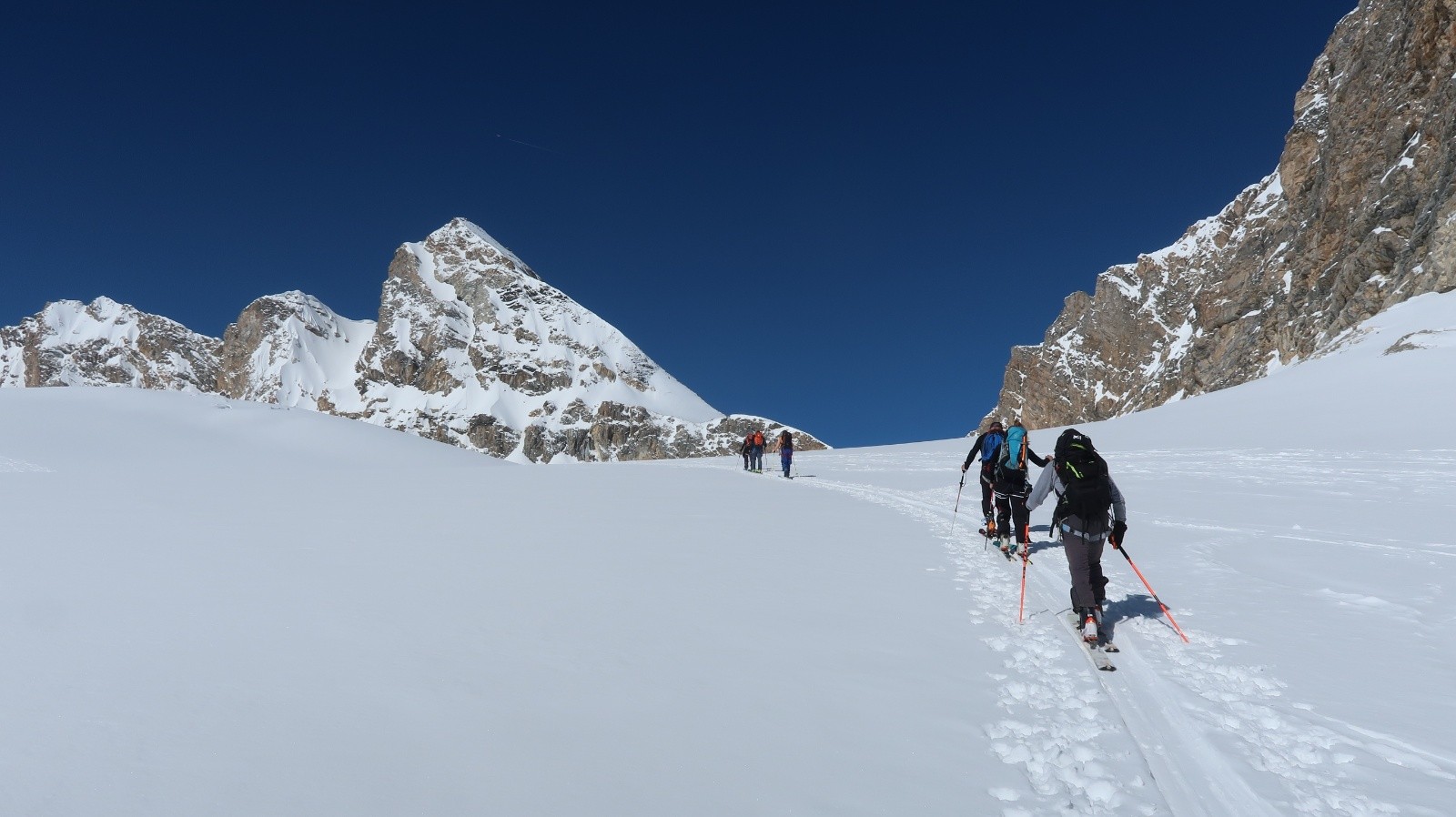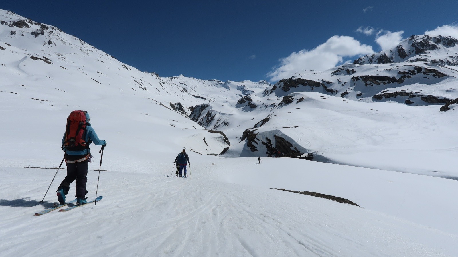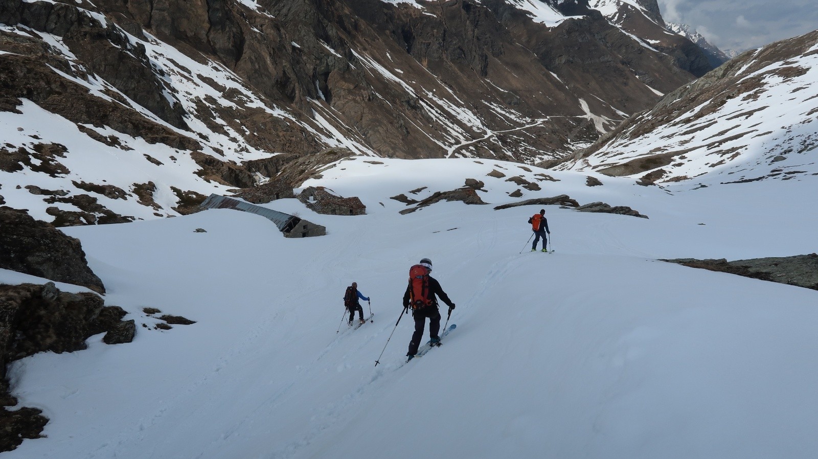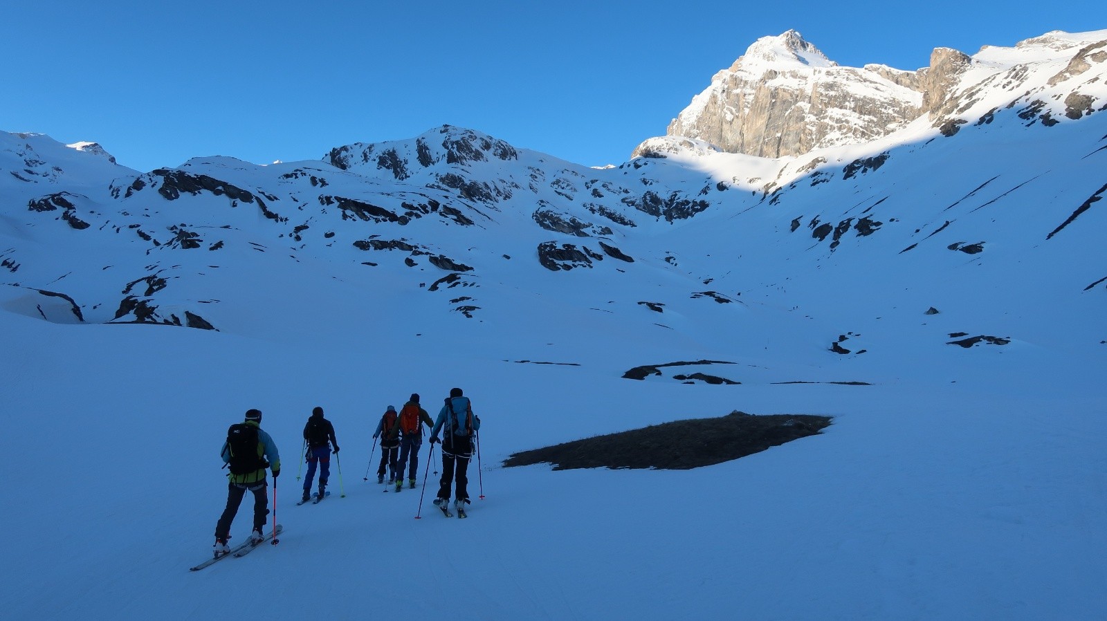 Aujourd'hui sera notre dernier jour dans ce Val di Rhêmes enchanteur. Nous nous décidons pour un retour sur les pentes de la veille: direction La Punta Baséi. Sur certains passages proche du 30°, nous prenons nos précautions, l'approche de la crête présentant des plaques de neige soufflée. Le groupe atteint le Col Baséi sans trop de peine, nous sommes désormais bien acclimaté à l'altitude et en bonnes jambes. Nous bénéficions encore de bonnes conditions pour une descente ponctuée d'un enchainement de virages bien arrondis.
